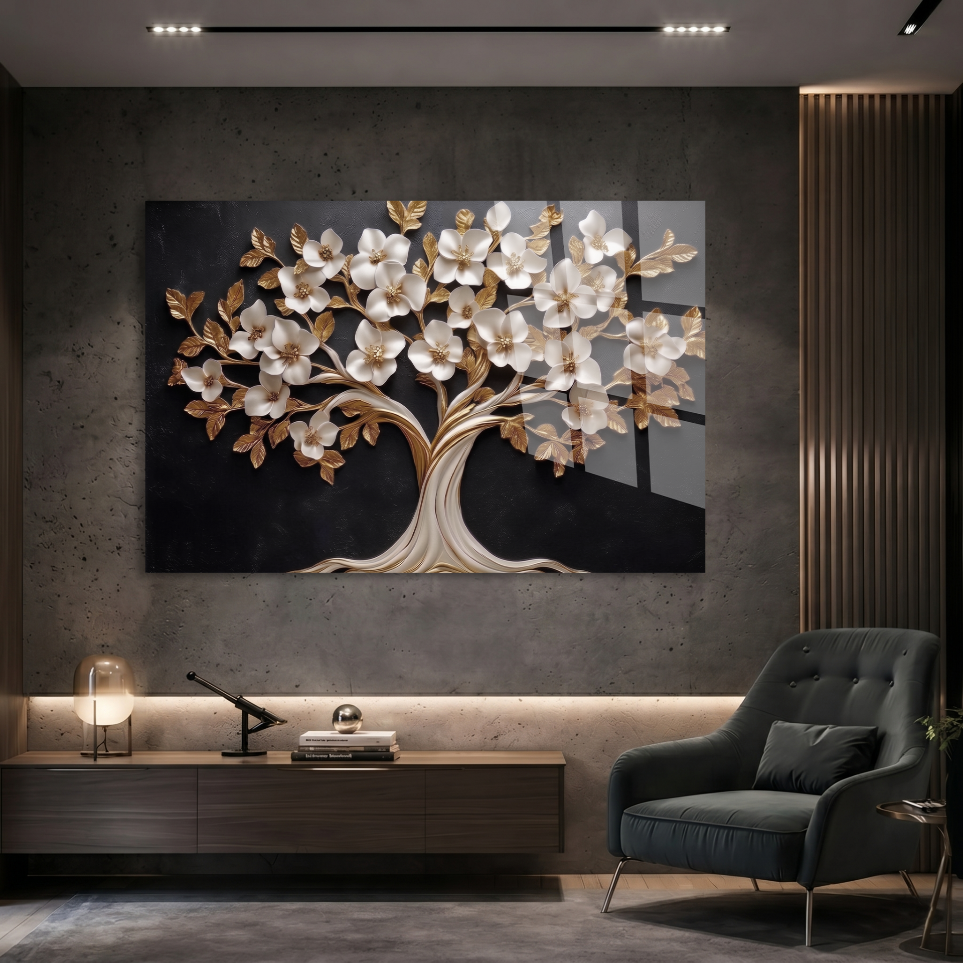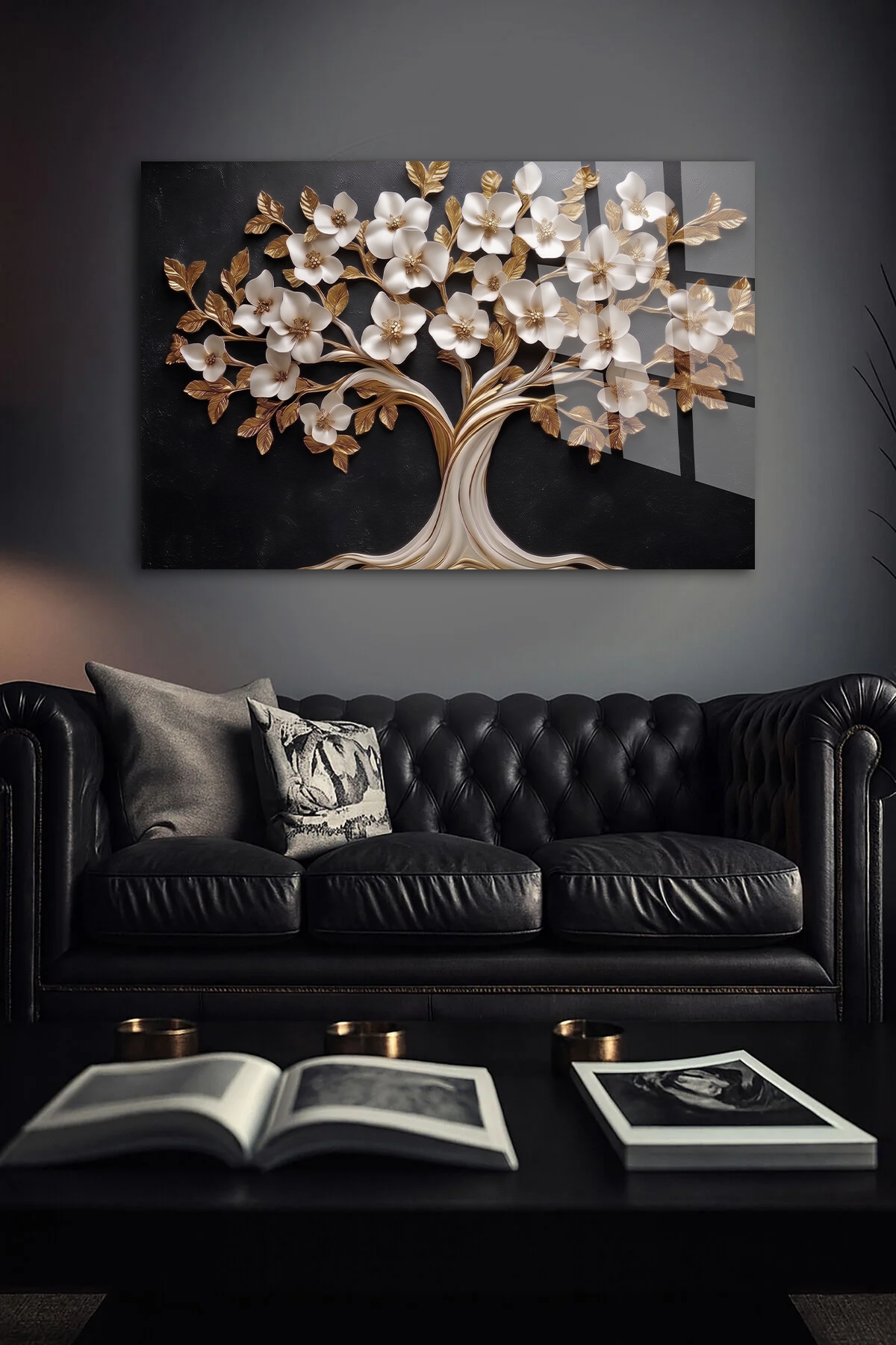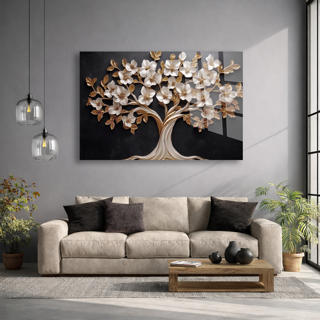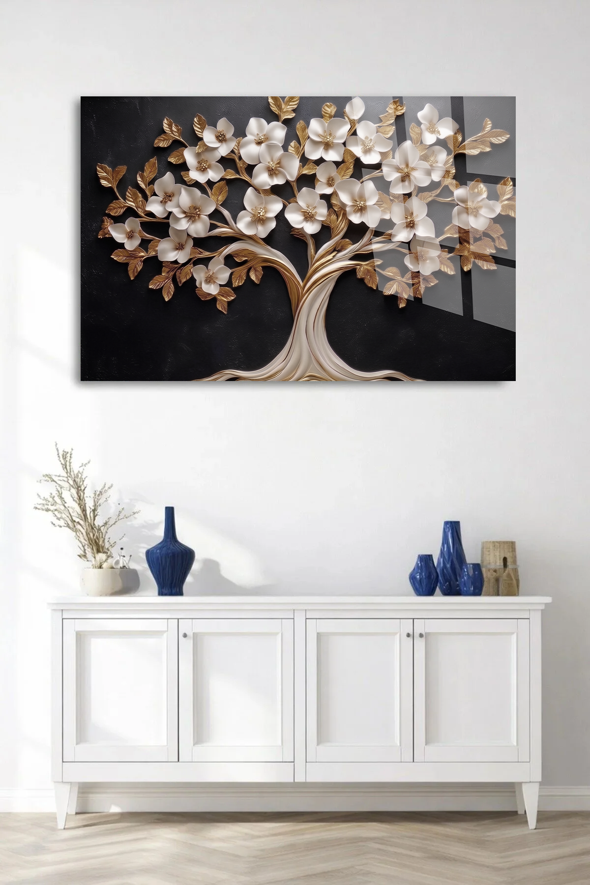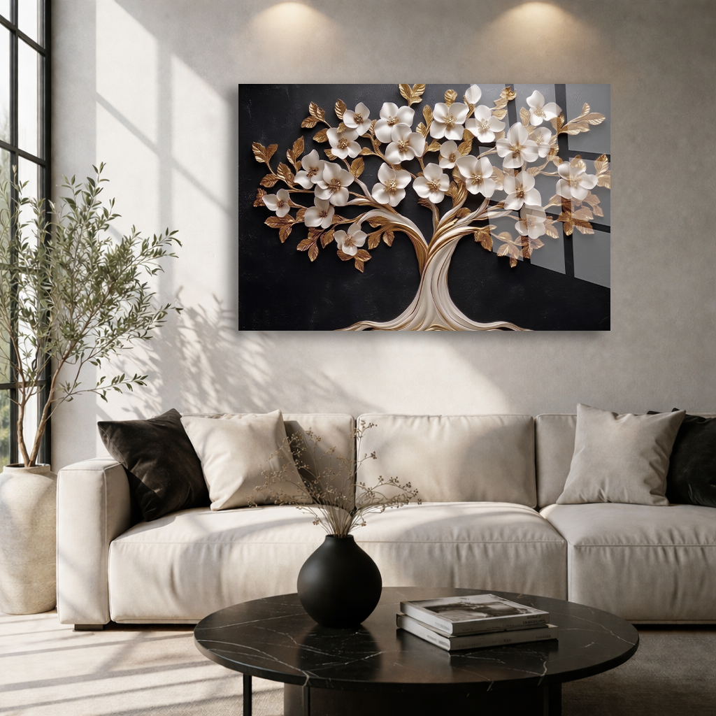 KIRILMAZ CAM TABLO , MODERN DUVAR DEKORASYONU BEYAZ ÇİÇEKLİ AĞAÇ TASARIM EV OFİS HEDİYESİ