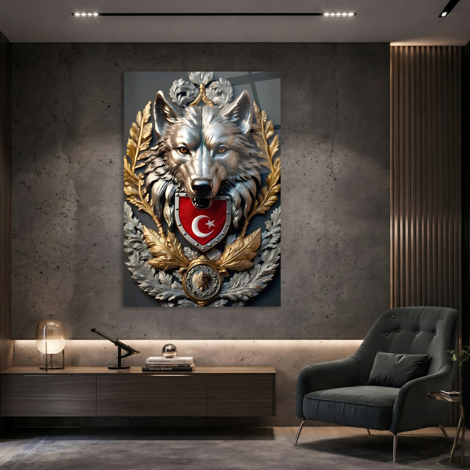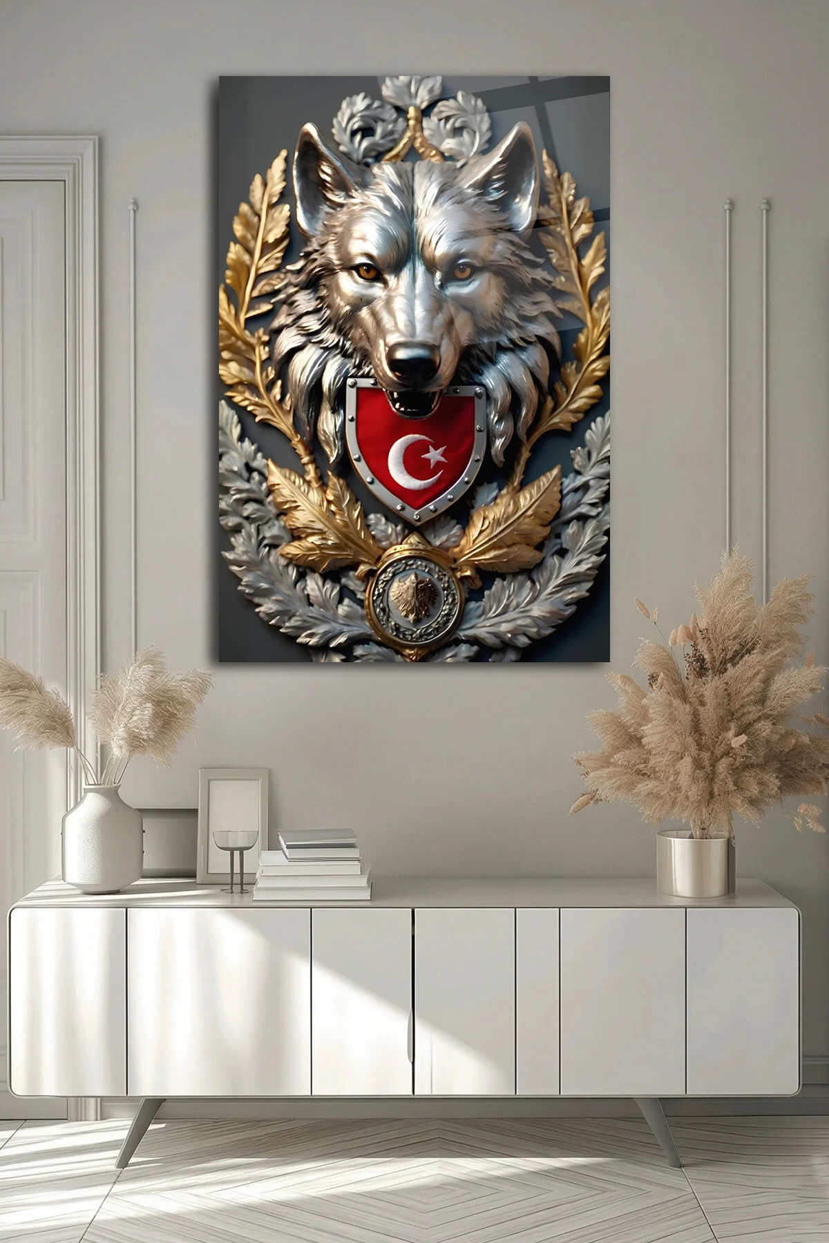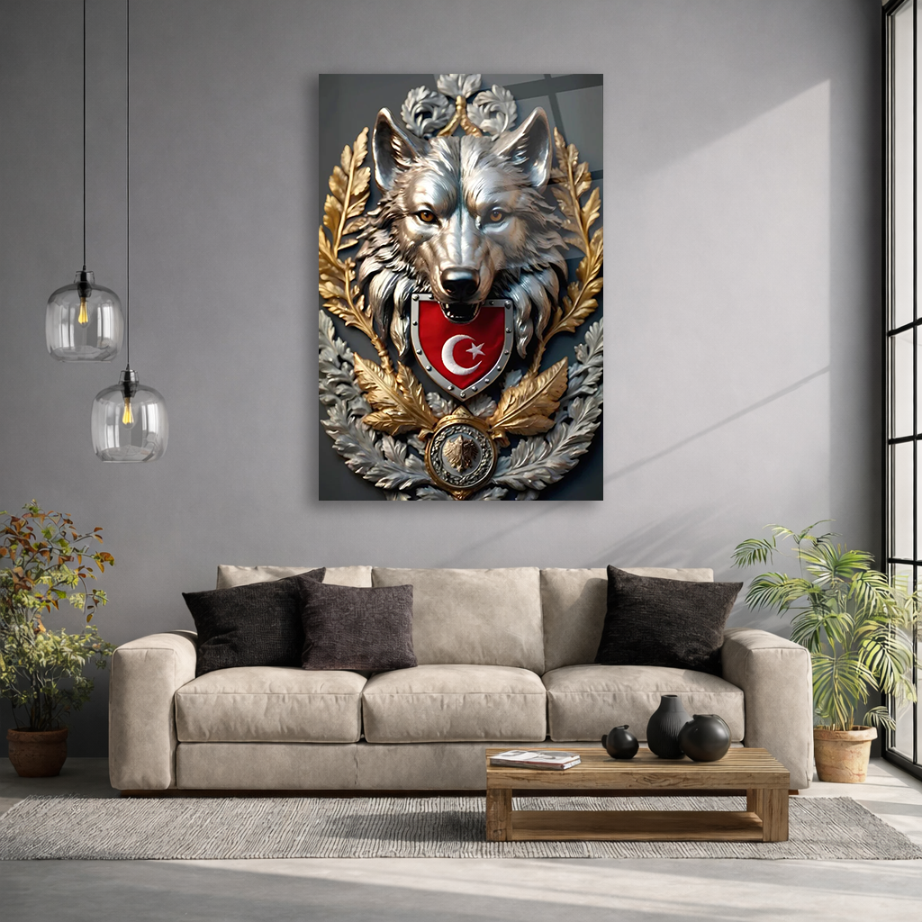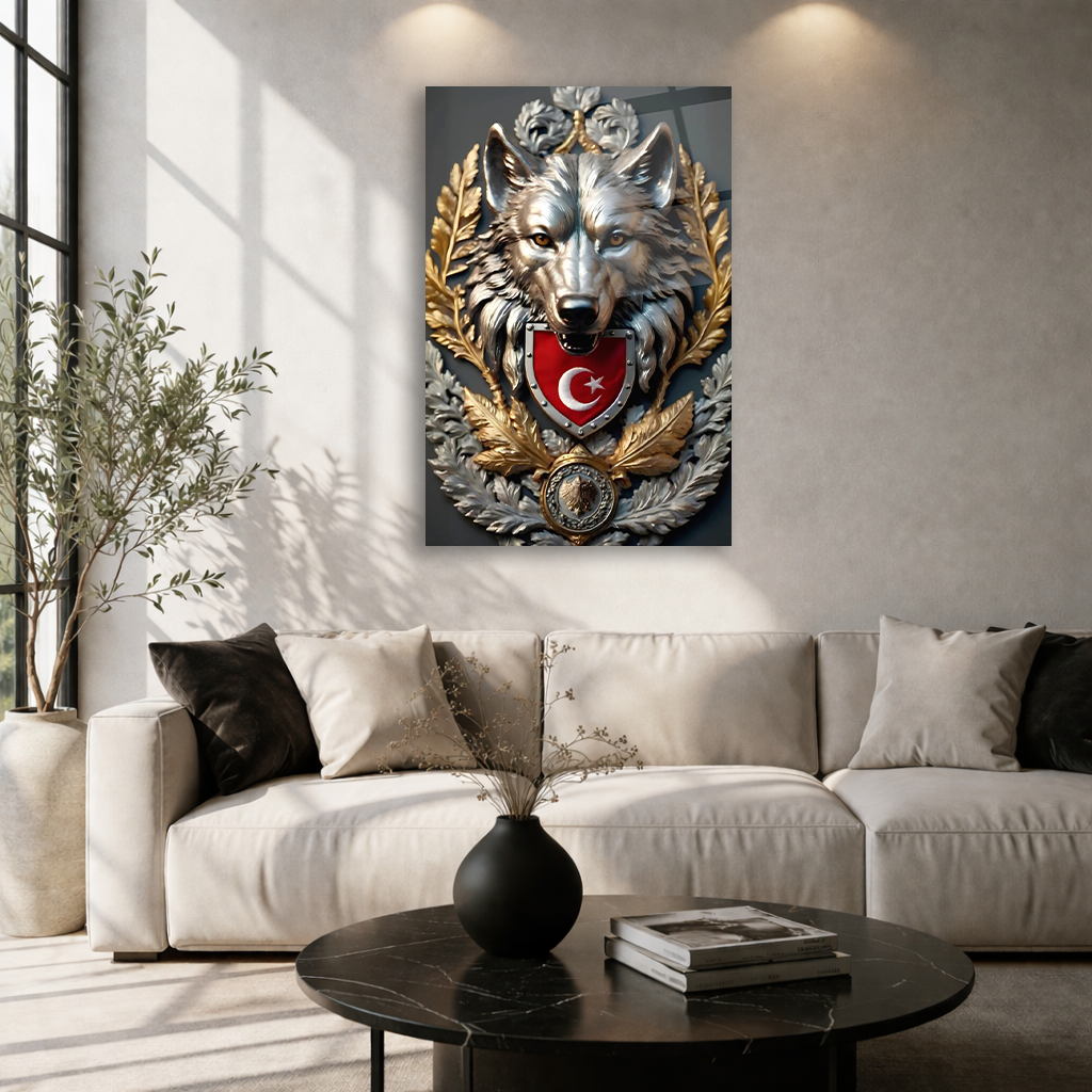 KIRILMAZ CAM TABLO , MODERN DUVAR DEKORASYONU BOZKURT TÜRK BAYRAĞI ARMASI EV OFİS HEDİYESİ