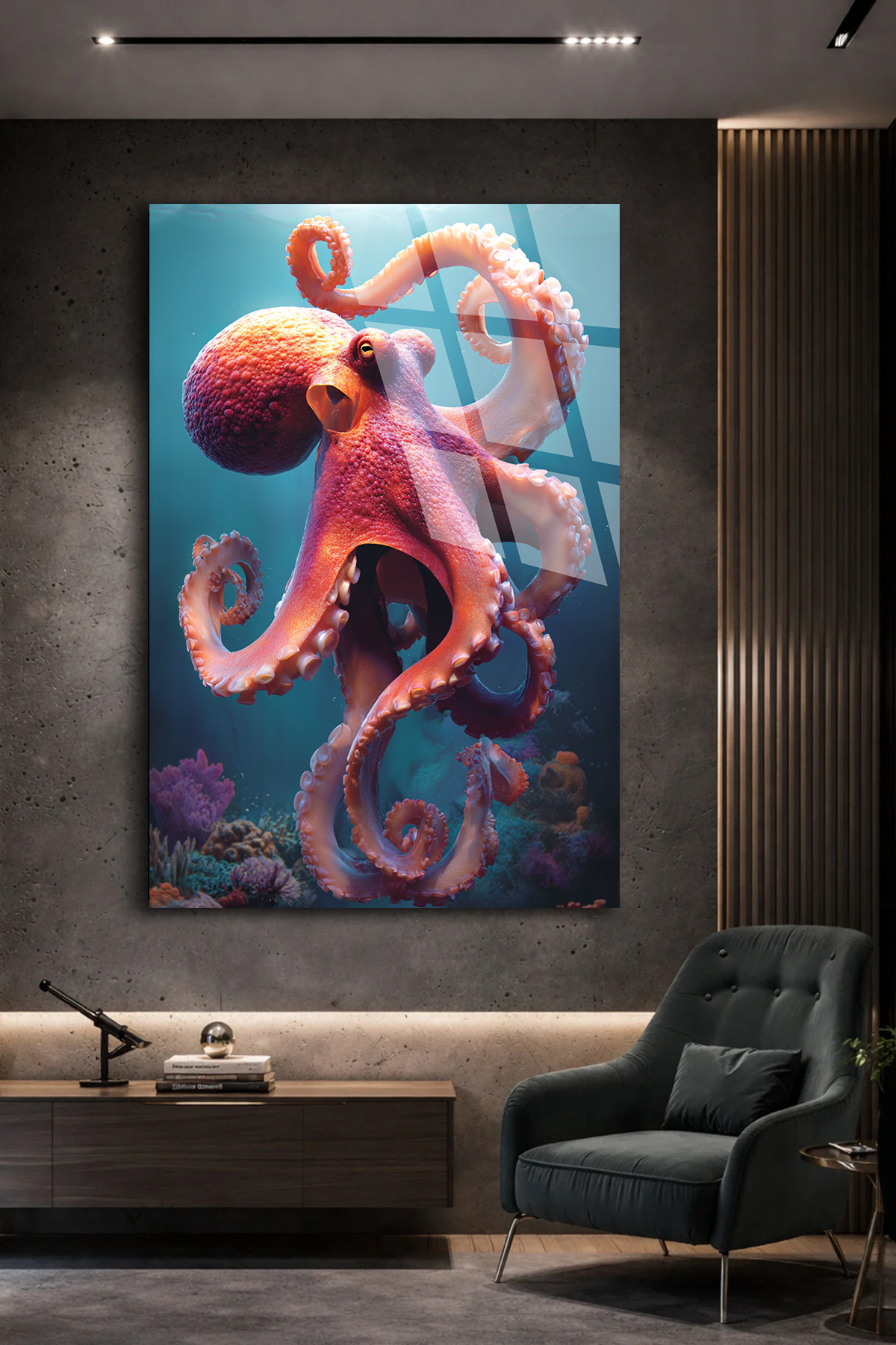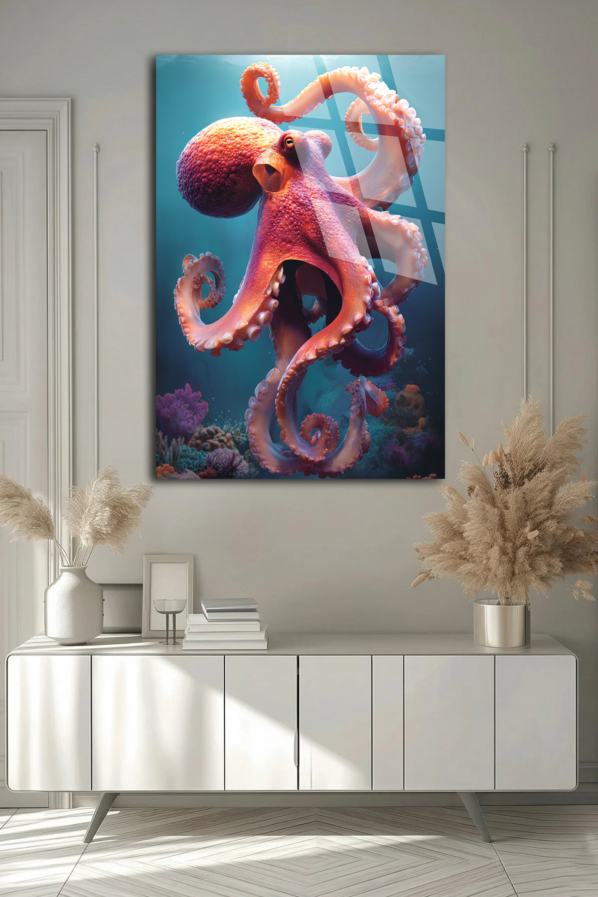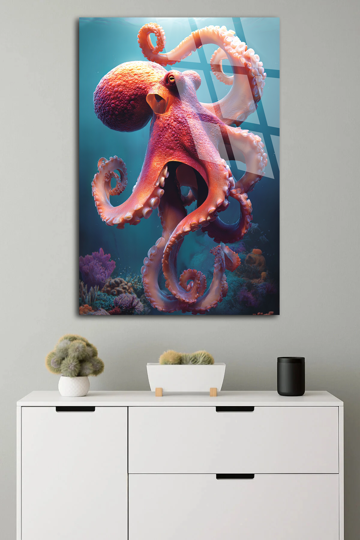 KIRILMAZ CAM TABLO , MODERN DUVAR DEKORASYONU DİKEY AHTAPOT OKYANUS EV OFİS HEDİYESİ Alternatif: