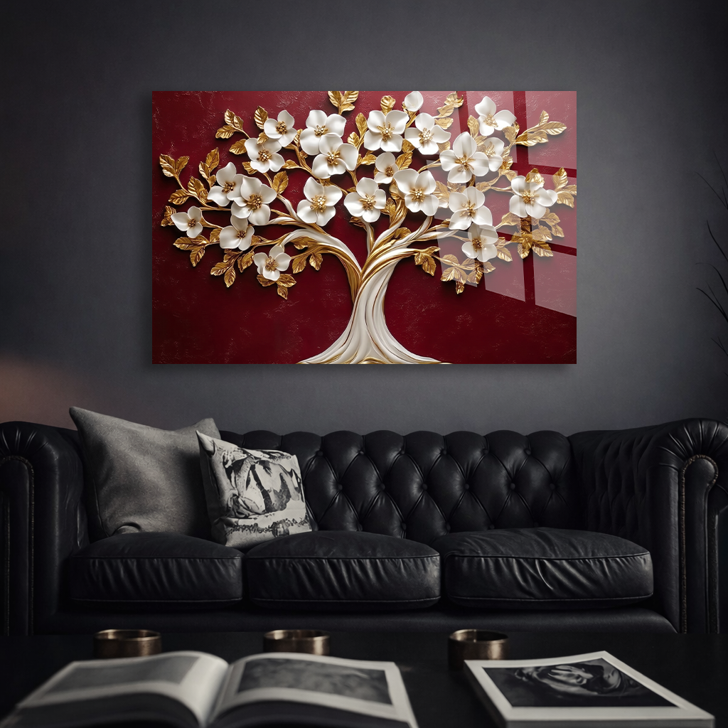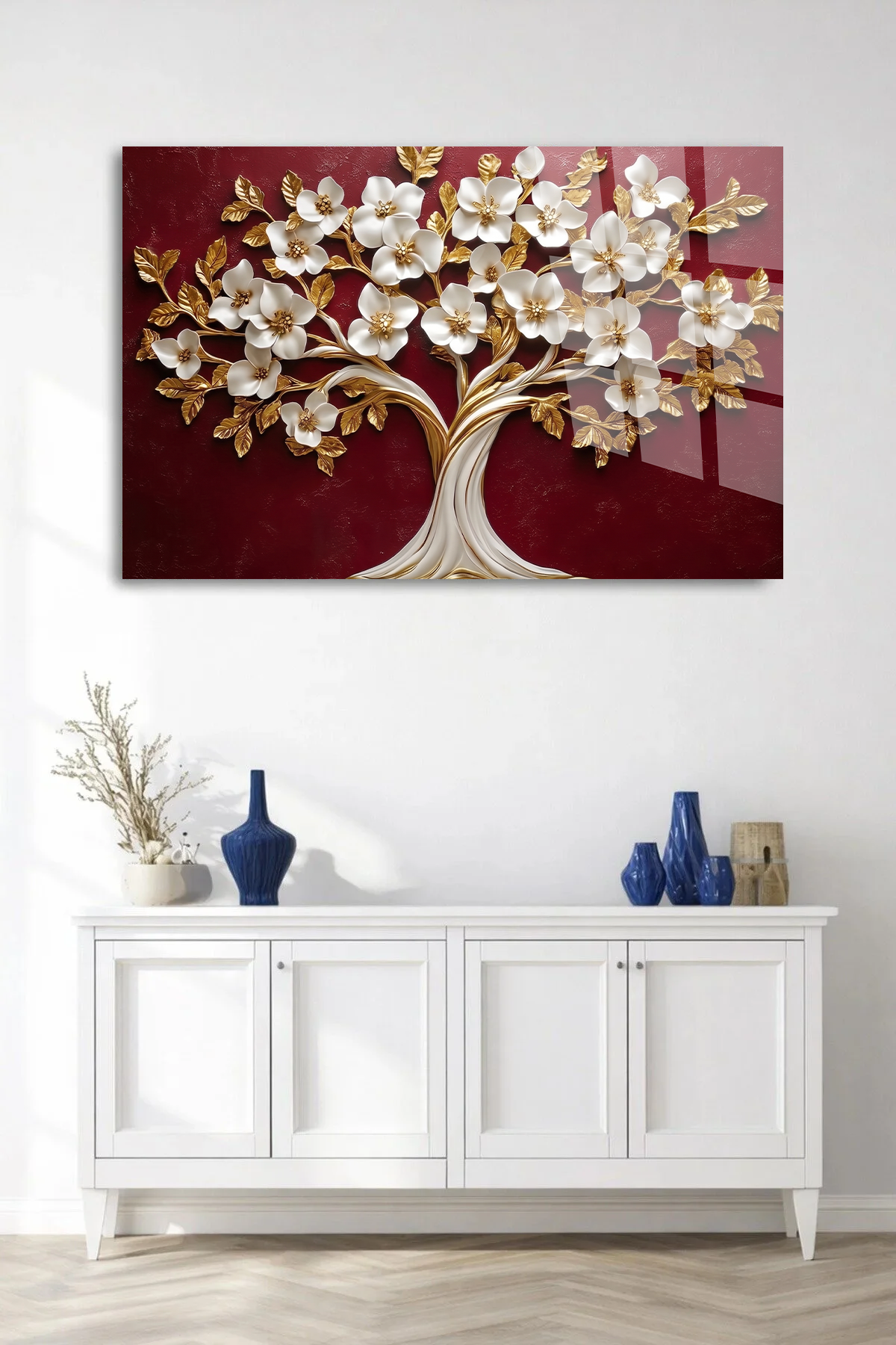 KIRILMAZ CAM TABLO , MODERN DUVAR DEKORASYONU KIRMIZI ZEMİN ÇİÇEKLİ AĞAÇ EV OFİS HEDİYESİ