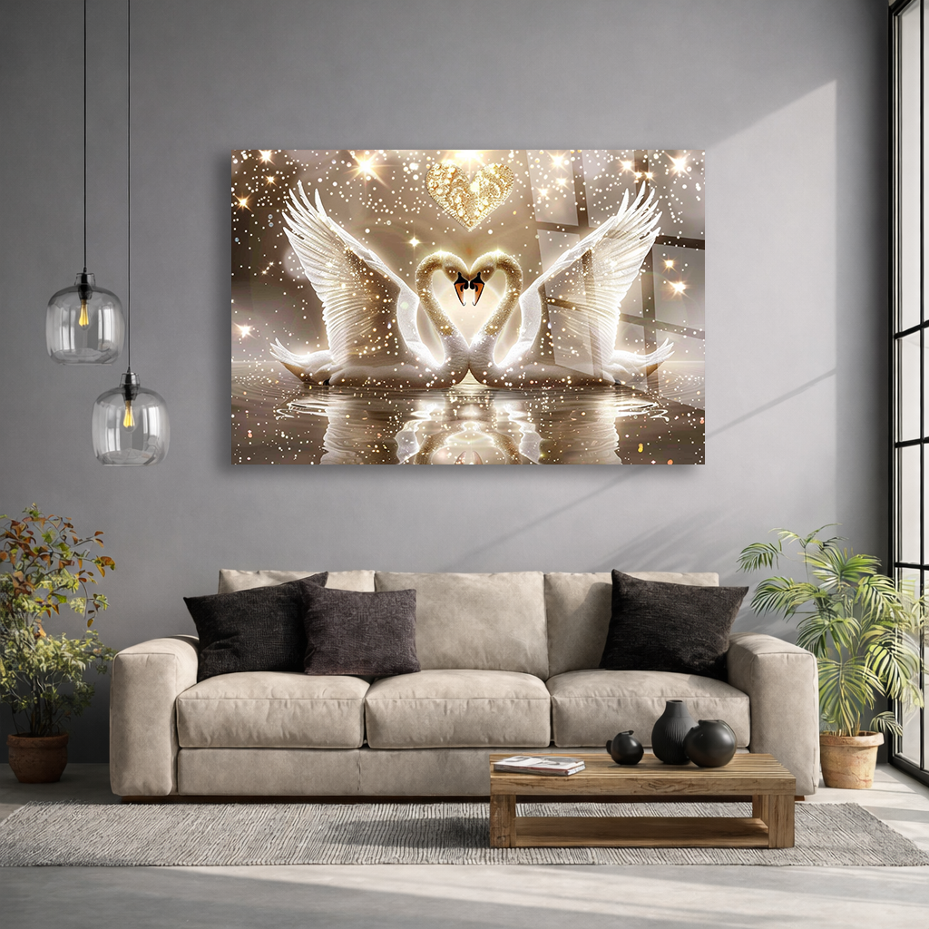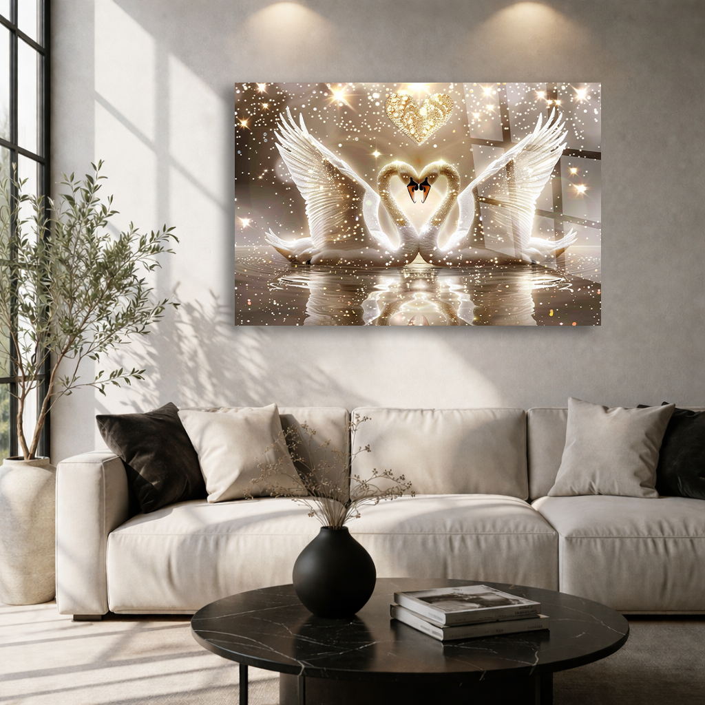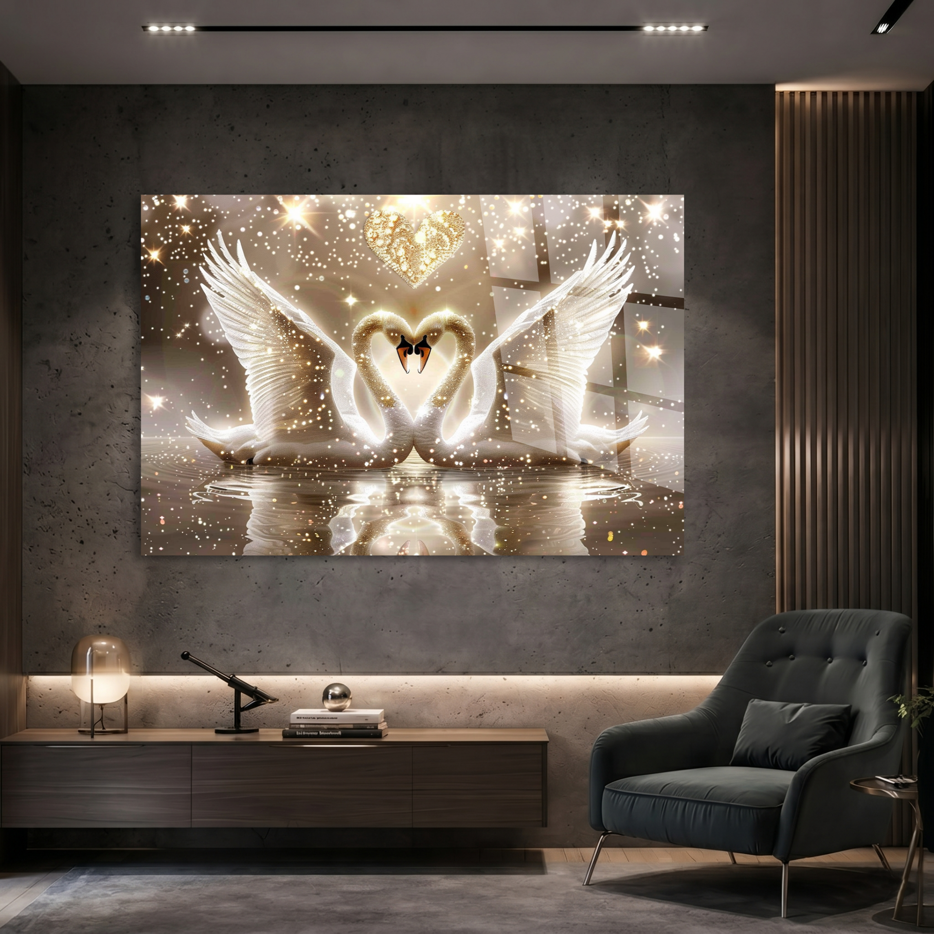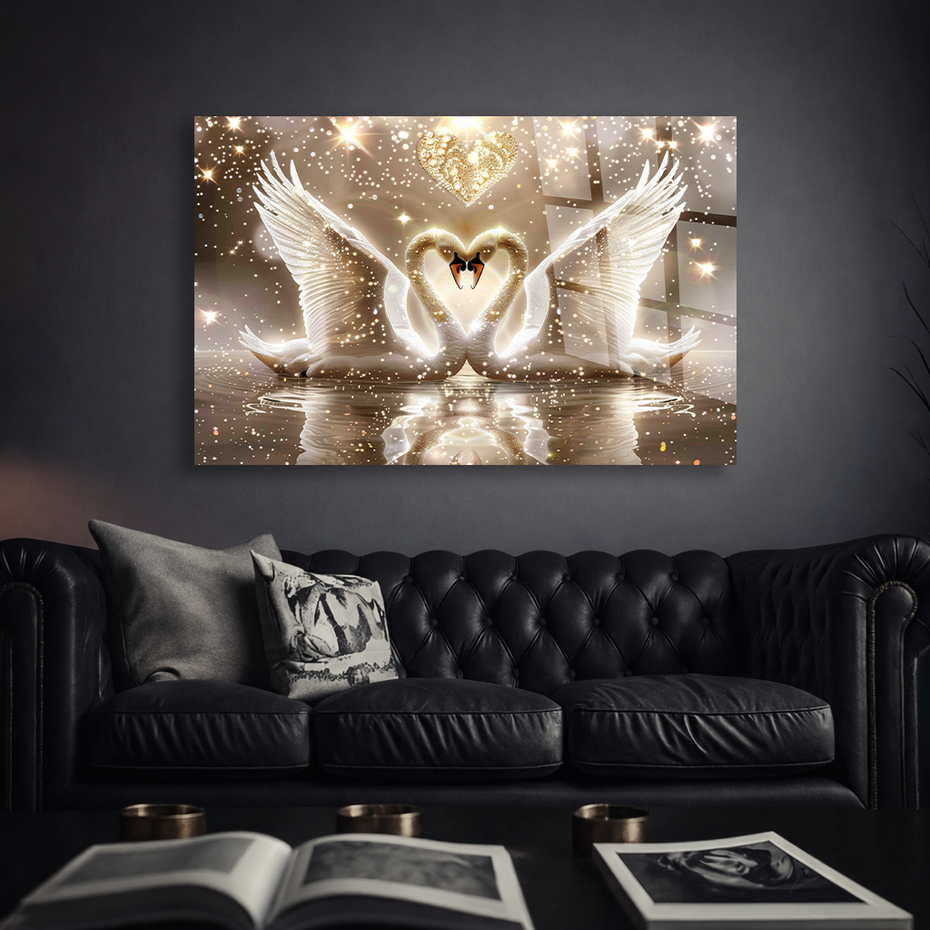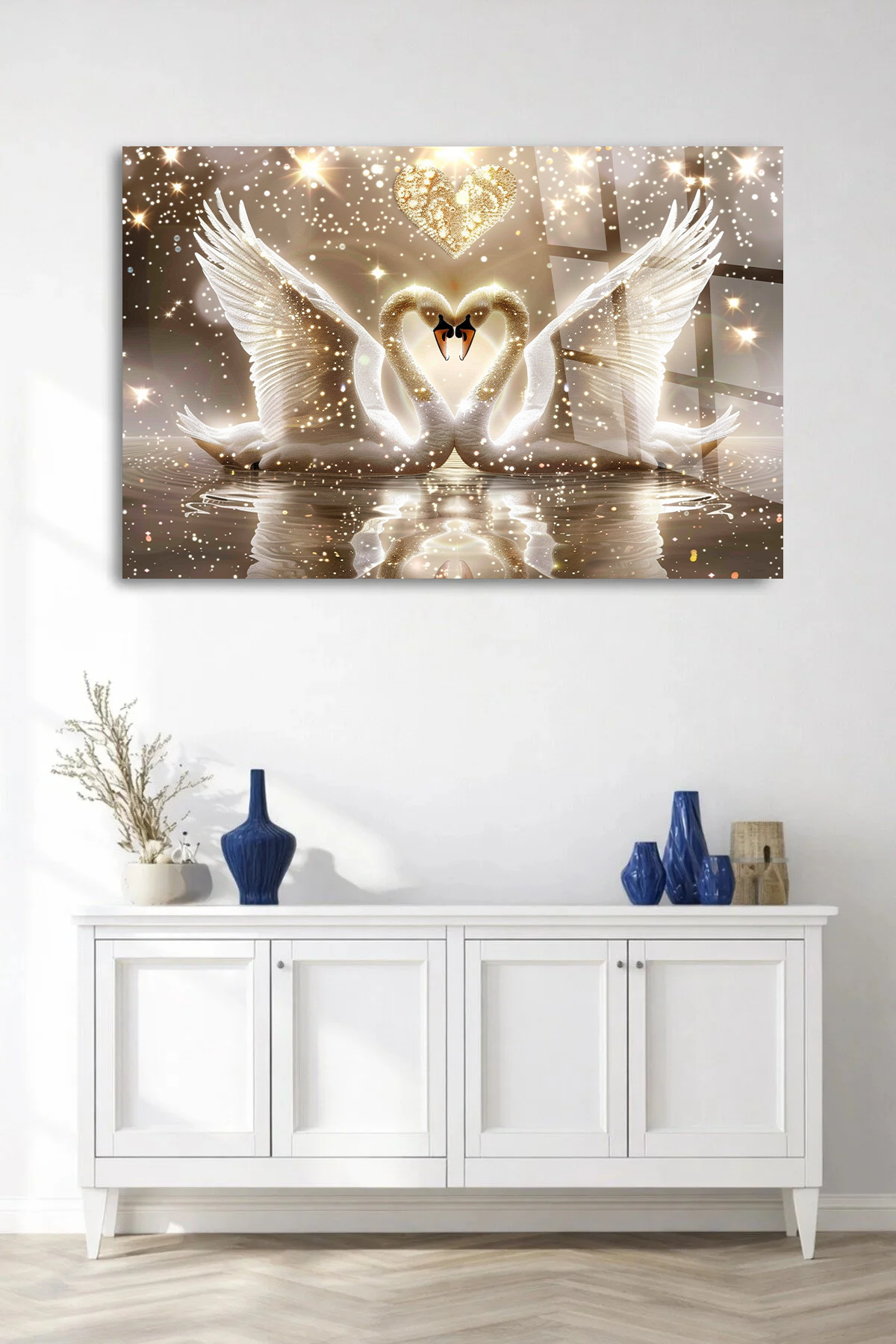 KIRILMAZ CAM TABLO , MODERN DUVAR DEKORASYONU KUĞU KALP AŞK TASARIM EV OFİS HEDİYESİ