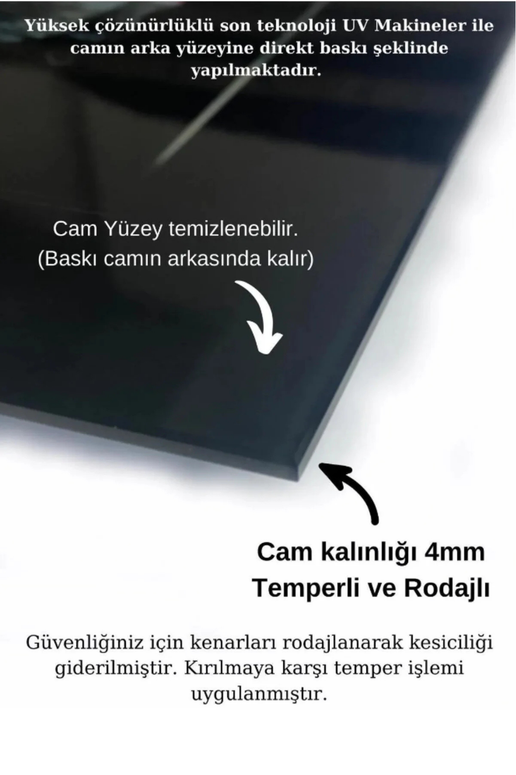 Cam tablolarımız 4 mm kalınlığında temper işlemi (ısıl işlem) görmüştür.; Kenarları rodajlanmış (kesiciliği giderilmiş) yüksek kaliteli düz camlardan oluşmaktadır.; Normal camlara göre kırılmaya 10 kat daha dayanıklıdır.; Gönderilirken özel koruma aparat ve ambalajları ile gönderilmektedir.; ; Tarafımızca hazırlanan özel tasarımlar doğrudan cam yüzeyine uv baskı tekniğiyle yüksek çözünürlüklü makinalarımız tarafından uygulanır.; Bu nedenle yüksek kaliteli,mükemmel bir görüntü derinliği sağlar.; Herhangi bir medyaya(folyo,kağıt v.; b.; ) baskı yapılmış görselin cam yüzeyine yapıştırılması şeklinde değildir.; Görsellerimiz camın arka yüzeyine doğrudan uv cam boyası kullanılarak basılır ve özel koruma boyası ile arka yüzey kapatılır.; Baskı cam ile arka koruma boyası arasında kalır.; Tasarımları ön yüzeyden camın parlaklığı ve şıklığı ile görürsünüz.; Cam tablolar zamanla solmazlar ve renkler canlılığını hiç kaybetmez.; ; Özel tasarım cam tablolar duvar dekorasyonunda yeni bir sayfa açmaktadır.; Özellikle ev ve ofis dekorasyonunda büyük tablolar duvarlarda çok şık bir görünüm sağlarlar.; Dekoratif ve zarif tablolar ev ve ofis duvarlarınıza estetik bir hava katar.; ; Tablolarımız sizler için özel olarak tasarlanmıştır.; ; Temizliği son derece kolay olan cam tablolarımızı,herhangi bir kimyasal ürünle veya nemli bez ile gönül rahatlığıyla silebilirsiniz.; Özel askı aparatı sayesinde ürünlerimizin duvardan kazara düşme olasılığı çok düşüktür.; Tek çivi ile kolayca duvara monte edebilirsiniz.; Ürün asıldığında duvardan 2 cm önde durmaktadır.; ; Kargo esnasında yaşanacak her türlü olumsuzluk(kırılma v.; b.; ) firmamıza aittir.; Kırılma olasılığı %1 in altındadır.; Özel çerçeveli kargo metodumuz Türkiyede yalnızca tarafımıza aittir bu sayede kırılma yaşanmamaktadır.; En ufak bir sorunda ise sizlere sağlam şekilde ulaşıncaya kadar tekrar gönderilir.; ; Üretici firma olarak özel tasarımlarıyla camı birleştirerek yaşam alanlarınıza şık bir görünüm ve modern bir hava katmayı amaç edinilmiştir.Kişiye özel Tablo seçeneğimiz de mevcuttur kişiye özel cam tablolalar için iletişime geçiniz.