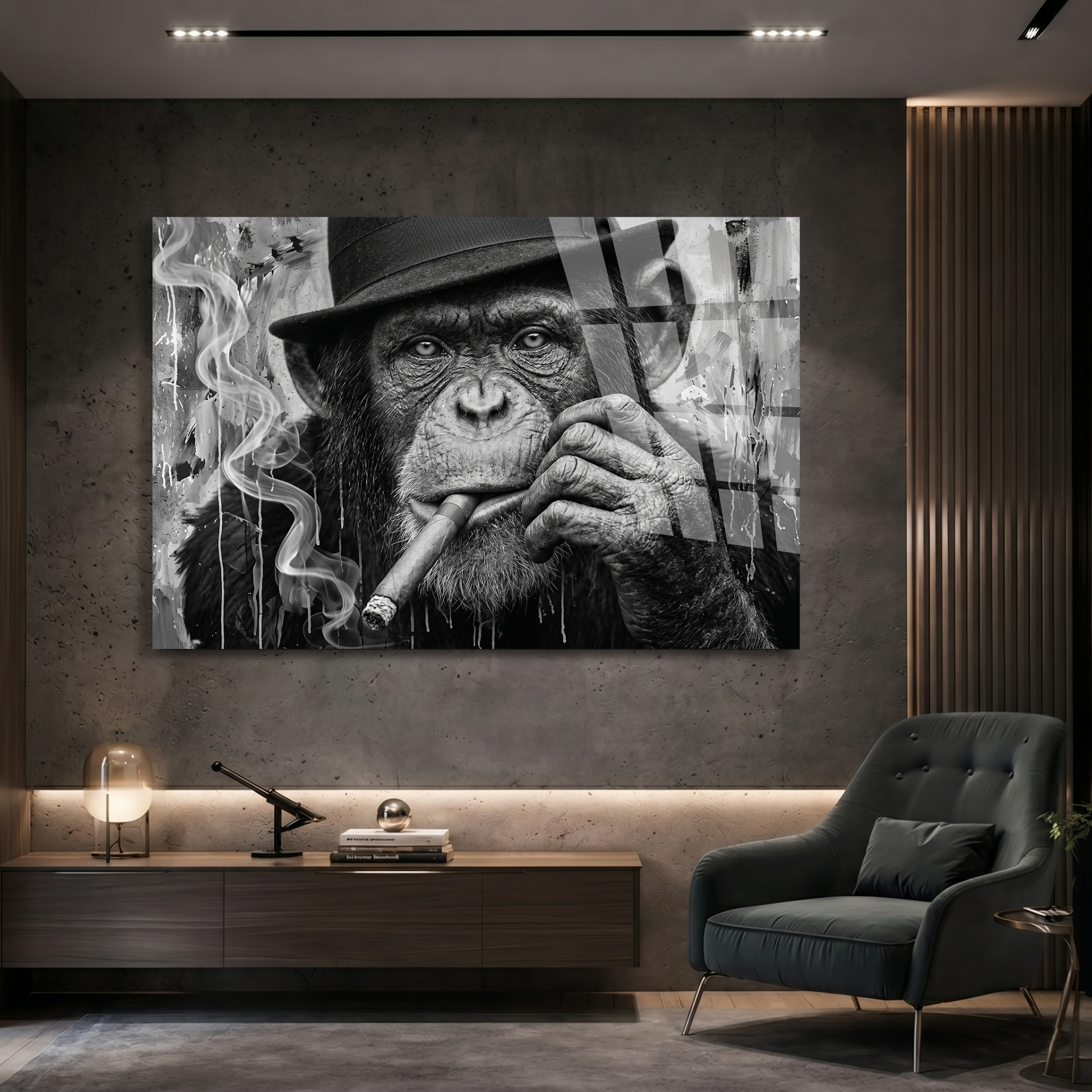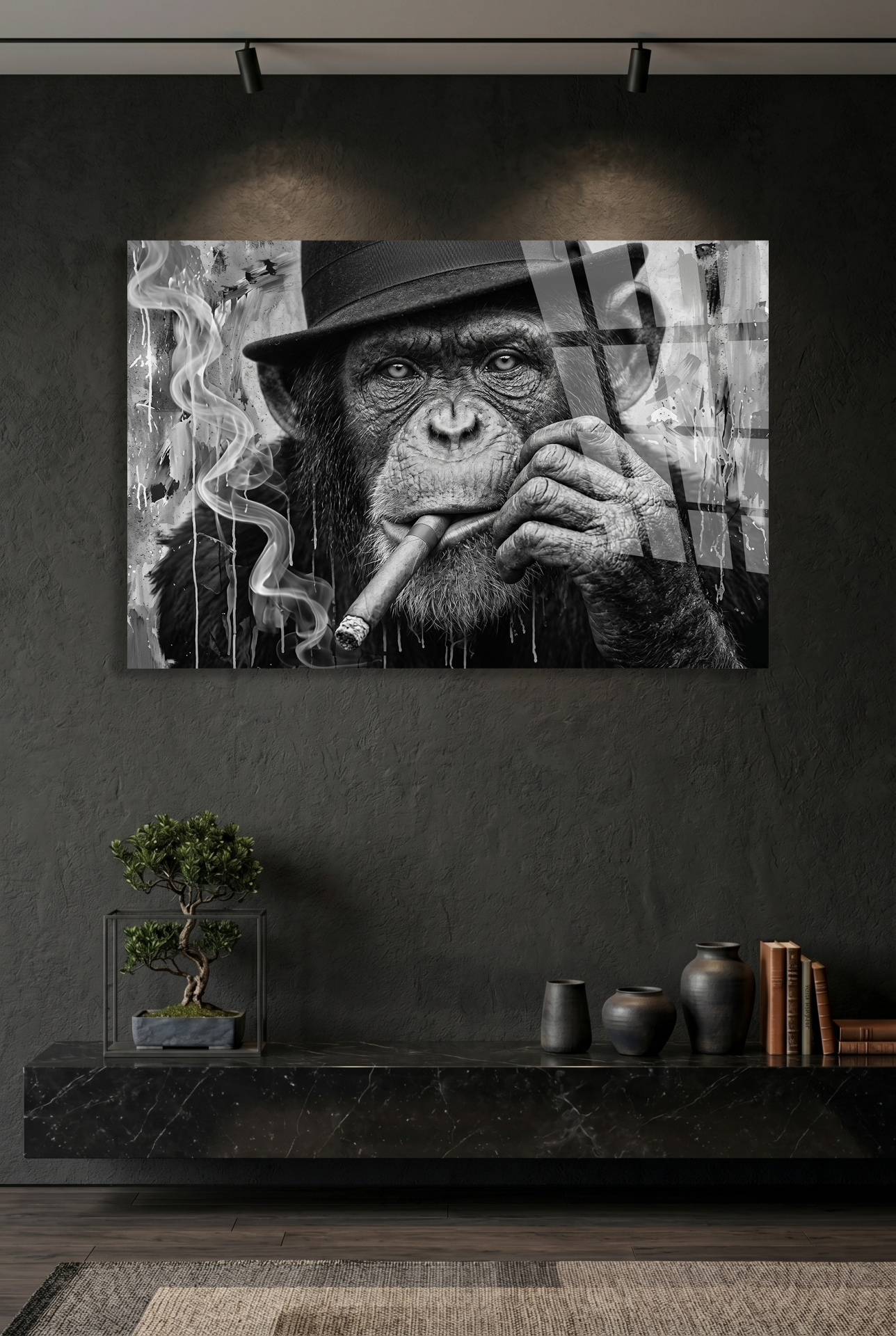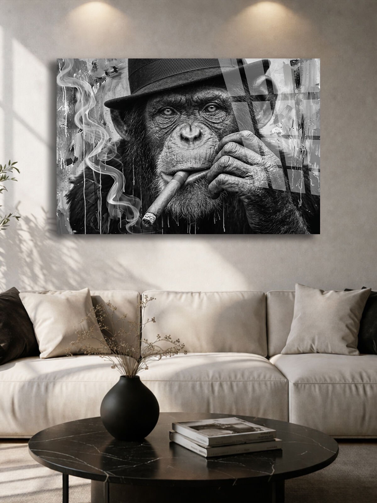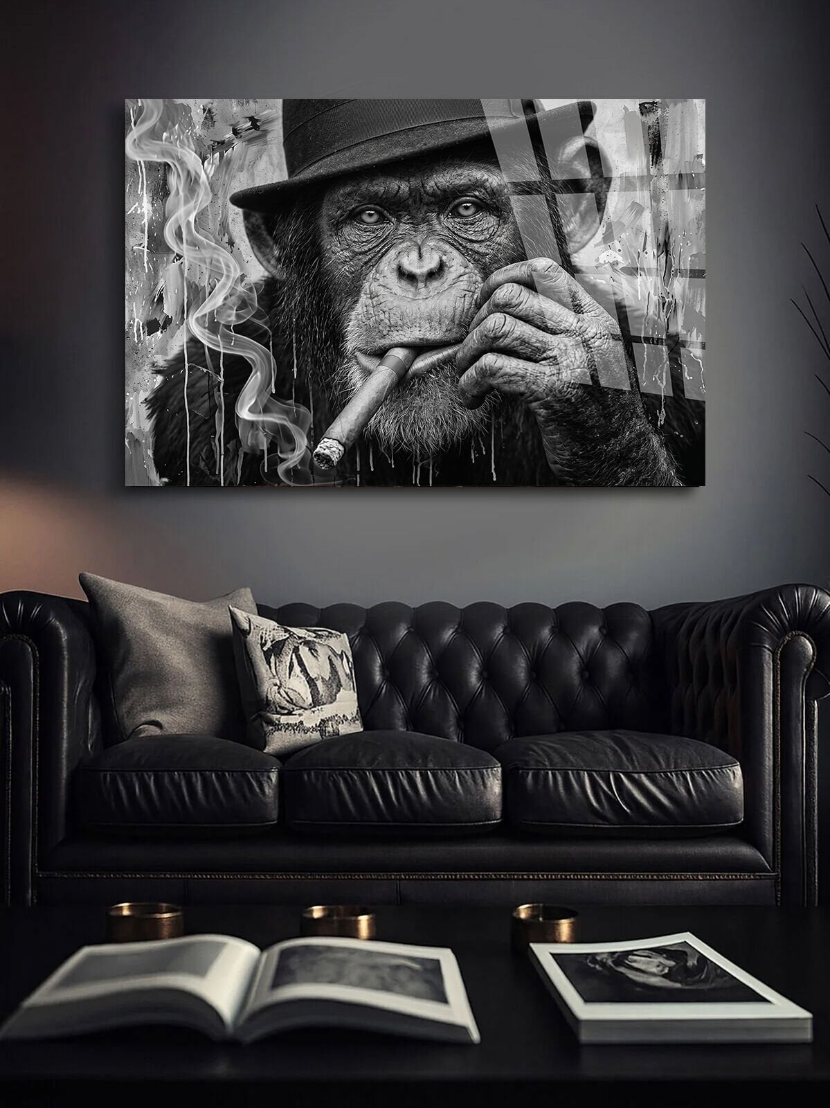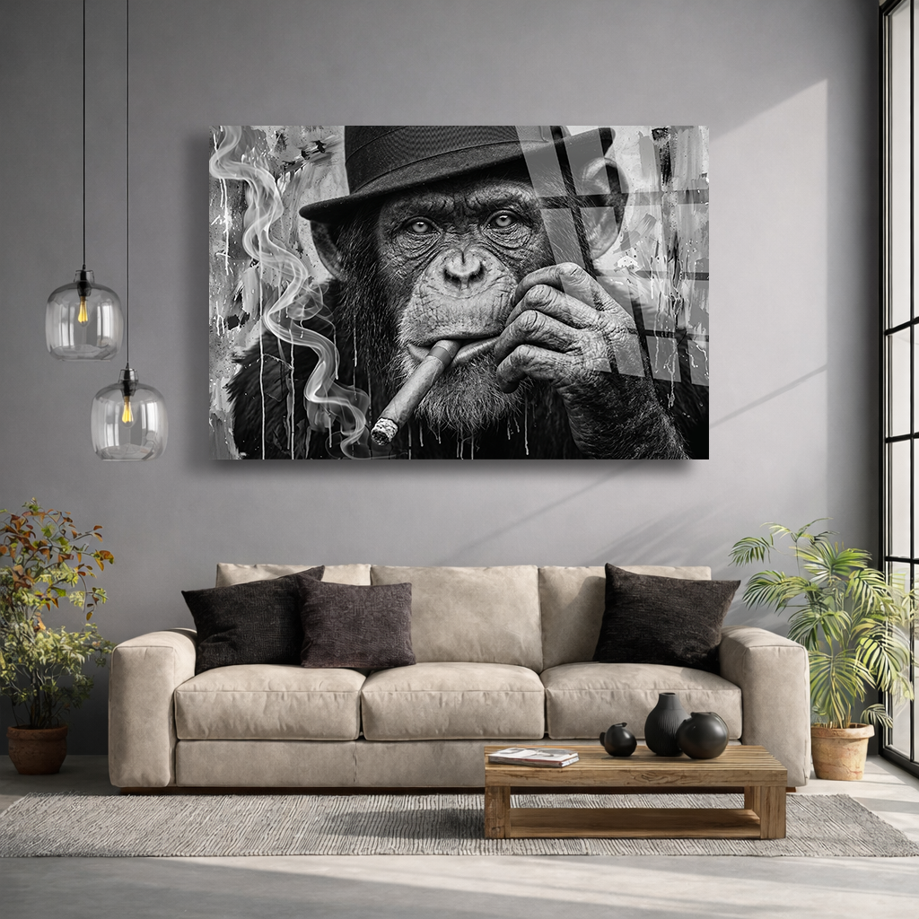 KIRILMAZ CAM TABLO , MODERN DUVAR DEKORASYONU MAYMUN PURO SİYAH BEYAZ SANAT EV OFİS HEDİYESİ