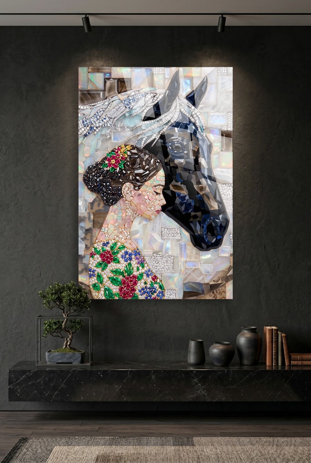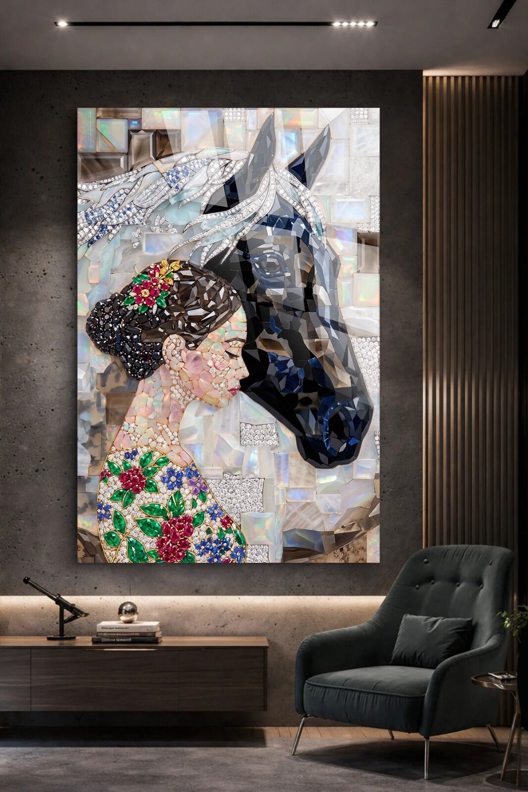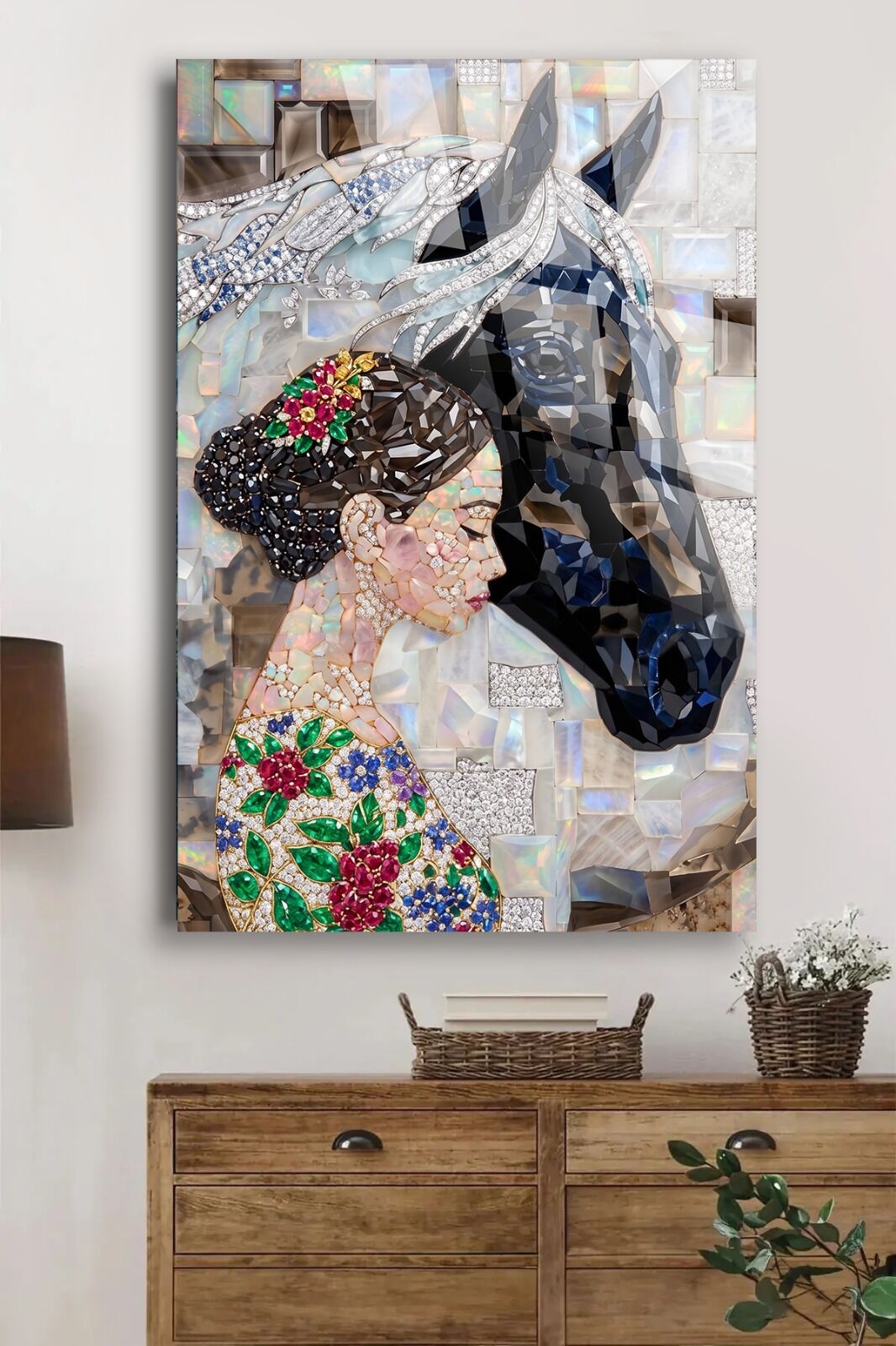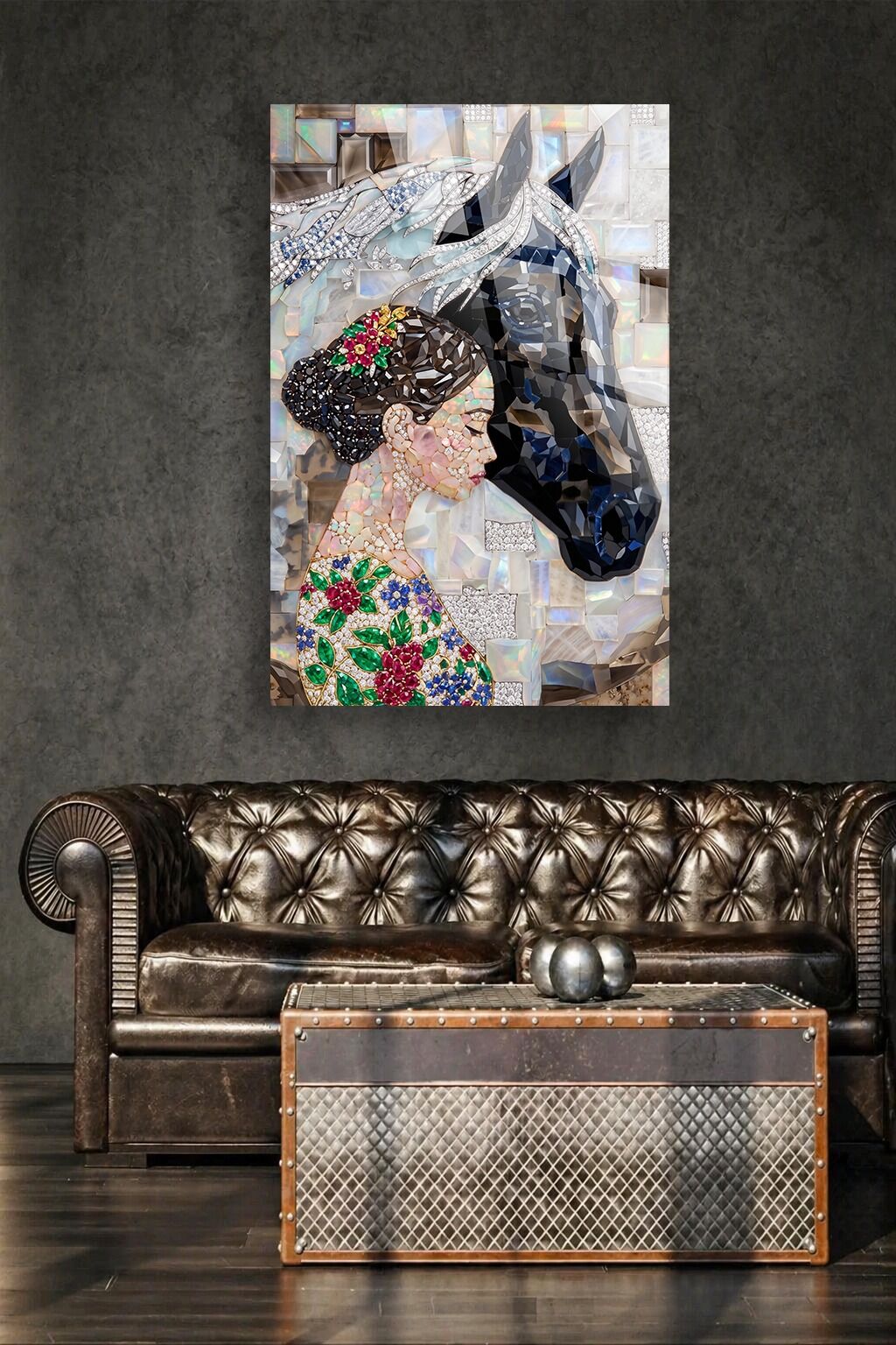 KIRILMAZ CAM TABLO , MODERN DUVAR DEKORASYONU MOZAİK KADIN AT SANAT TASARIM EV OFİS HEDİYESİ