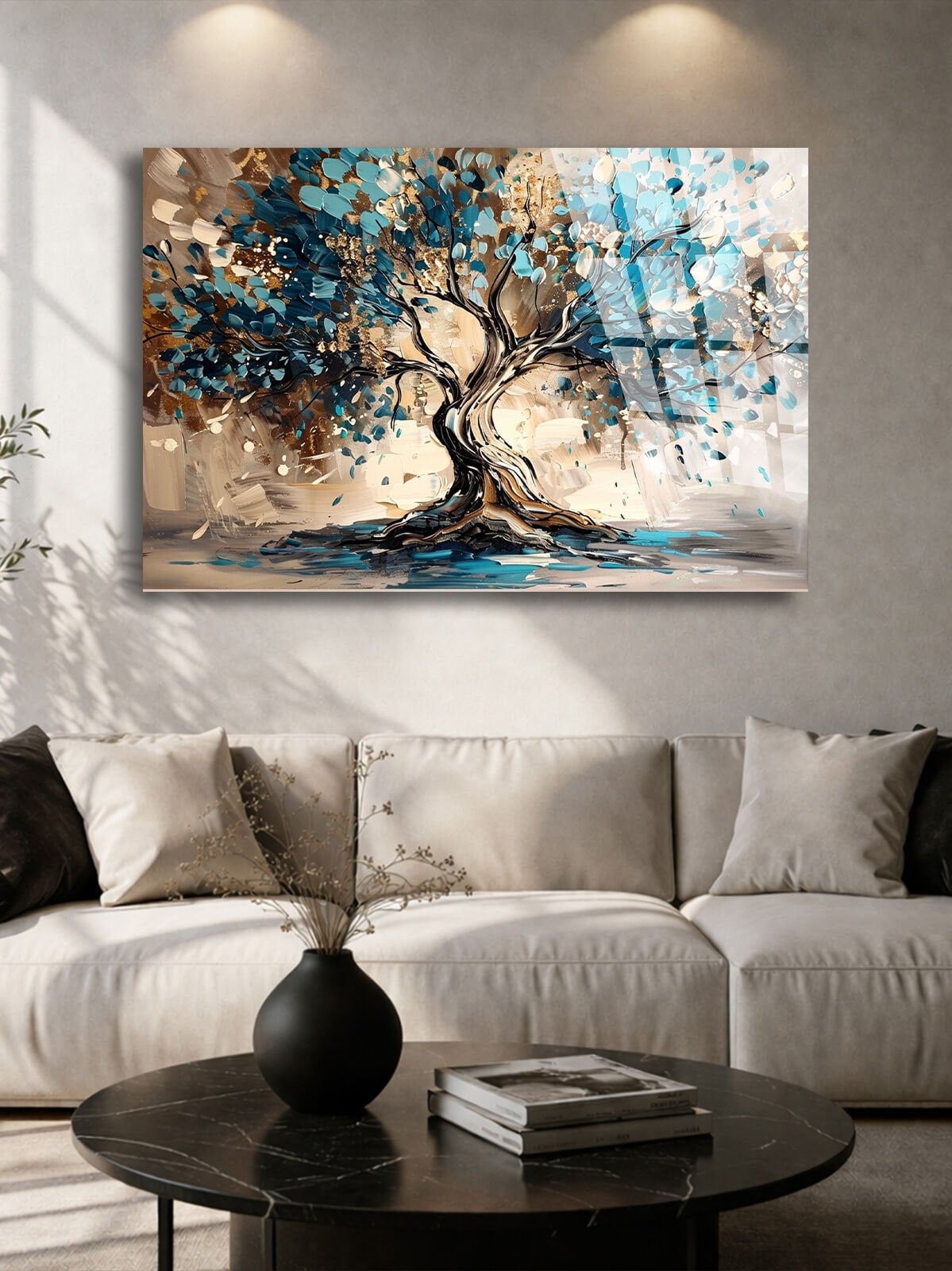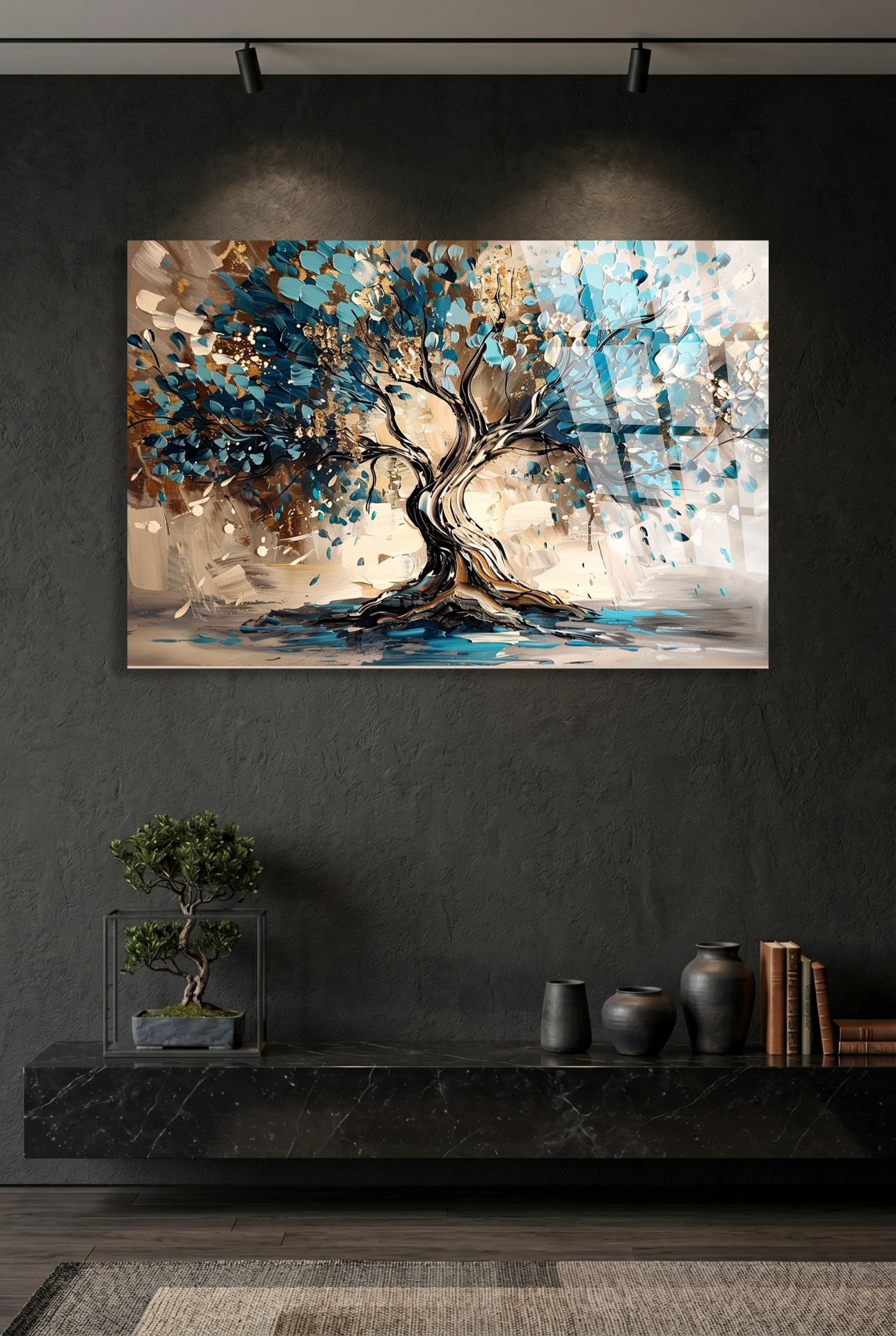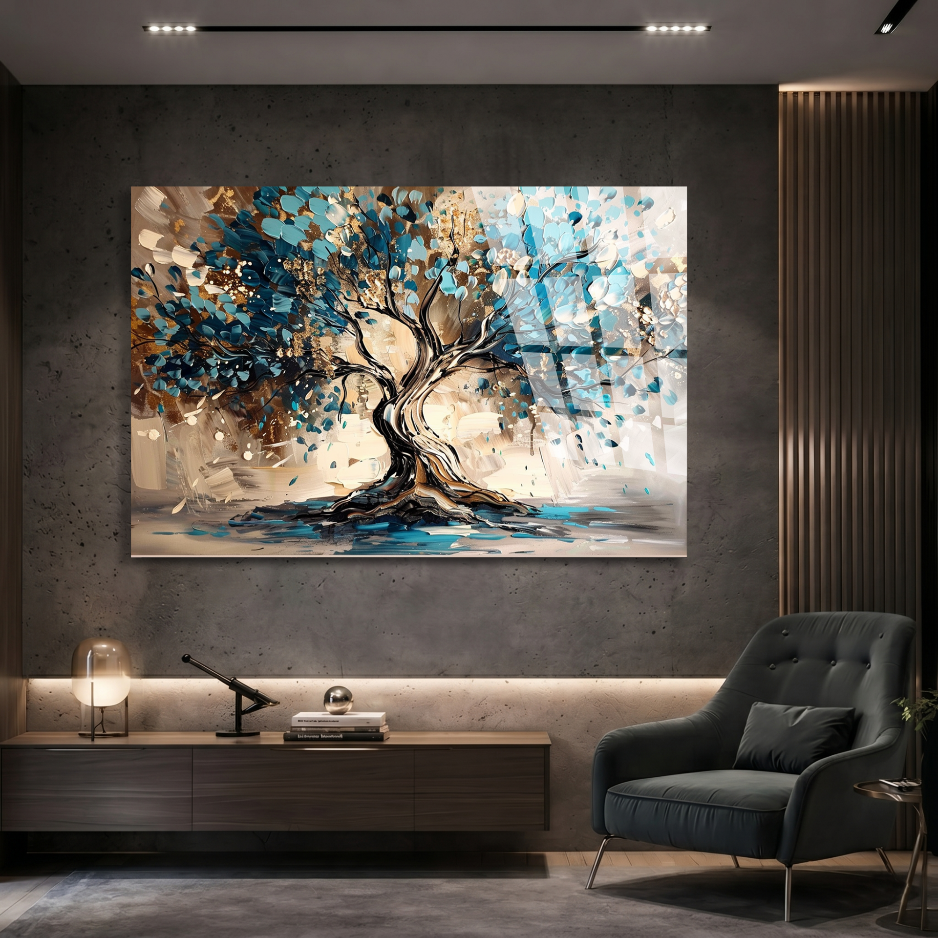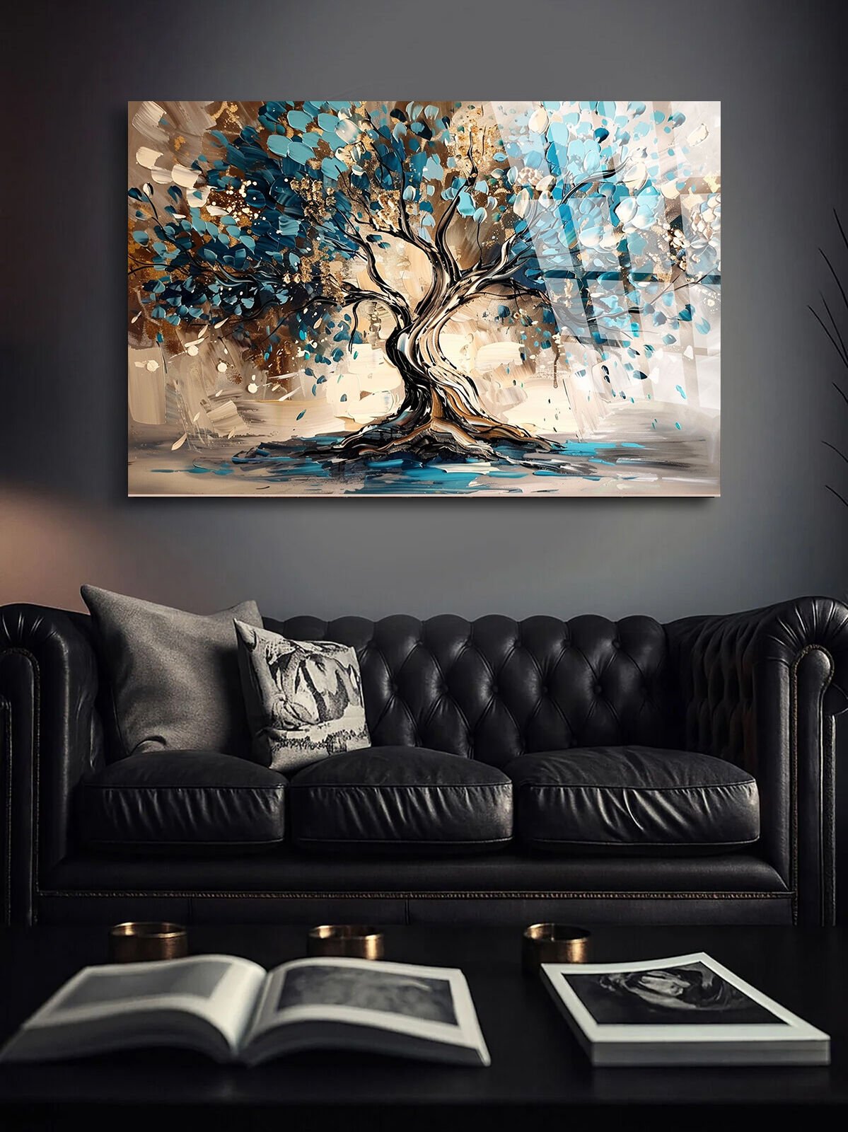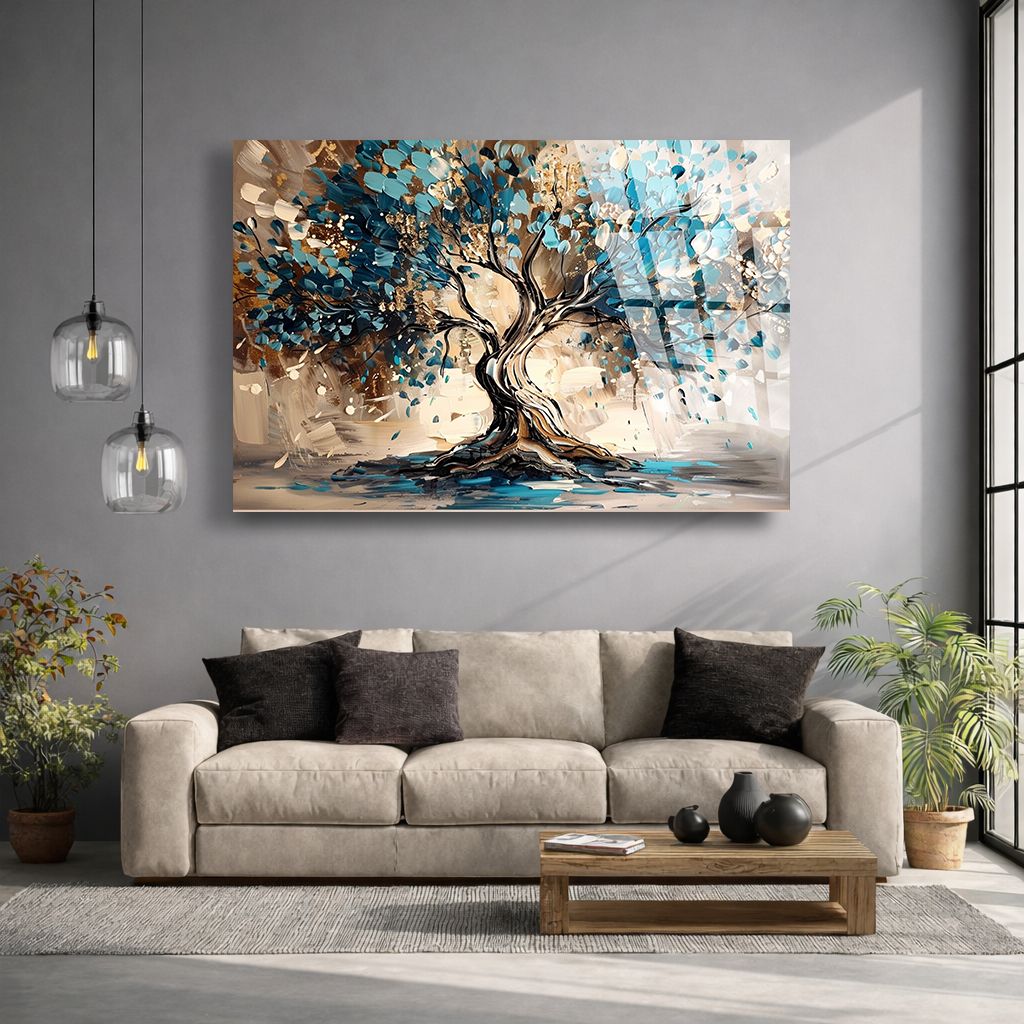 KIRILMAZ CAM TABLO , MODERN DUVAR DEKORASYONU SOYUT AĞAÇ MAVİ SANAT TASARIM EV OFİS HEDİYESİ