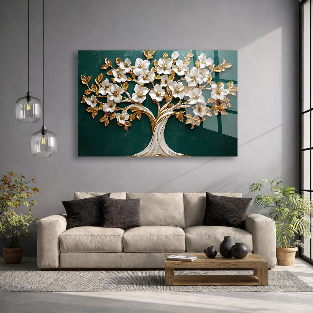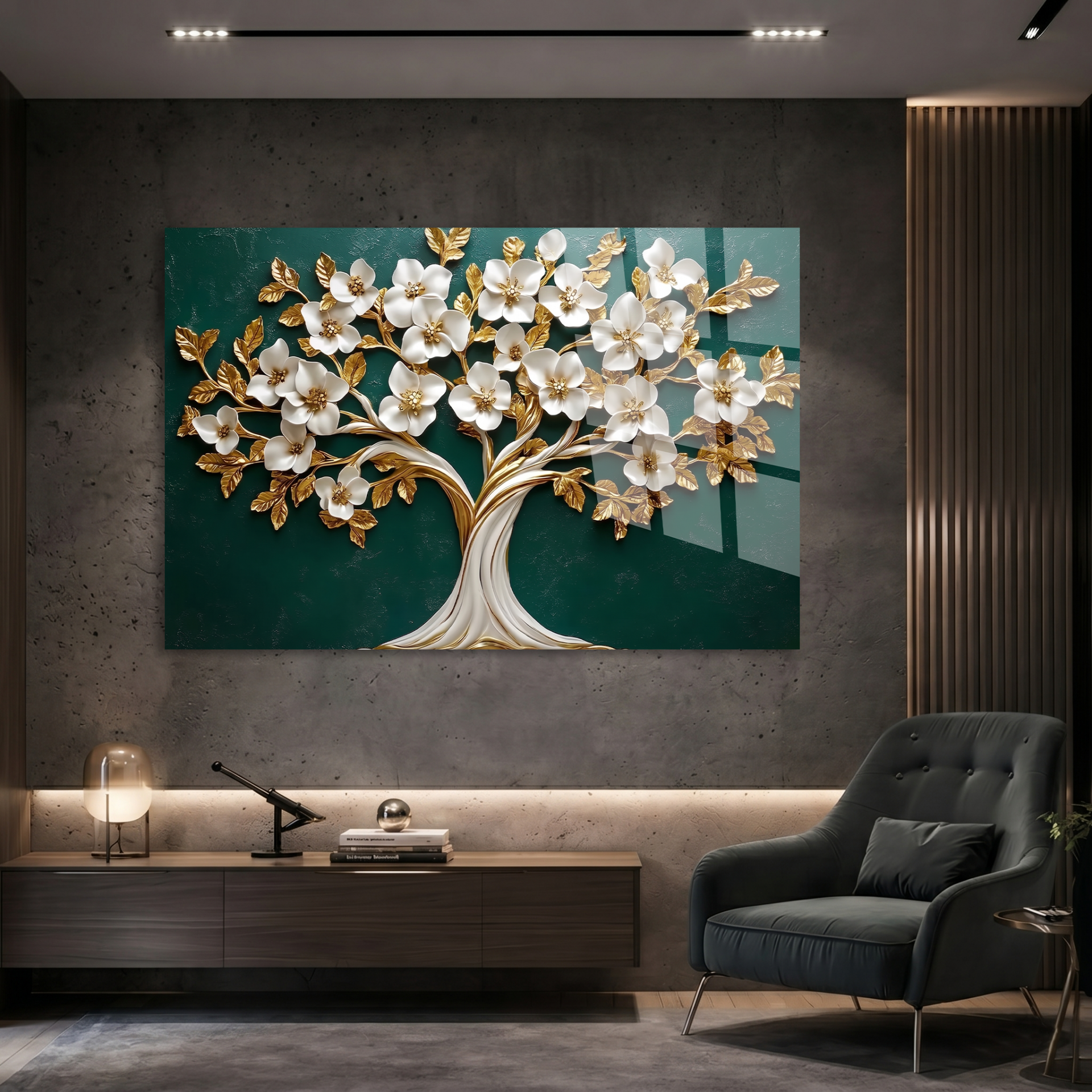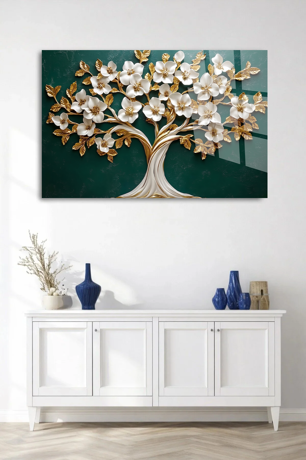 KIRILMAZ CAM TABLO , MODERN DUVAR DEKORASYONU YEŞİL ZEMİN ÇİÇEKLİ AĞAÇ EV OFİS HEDİYESİ