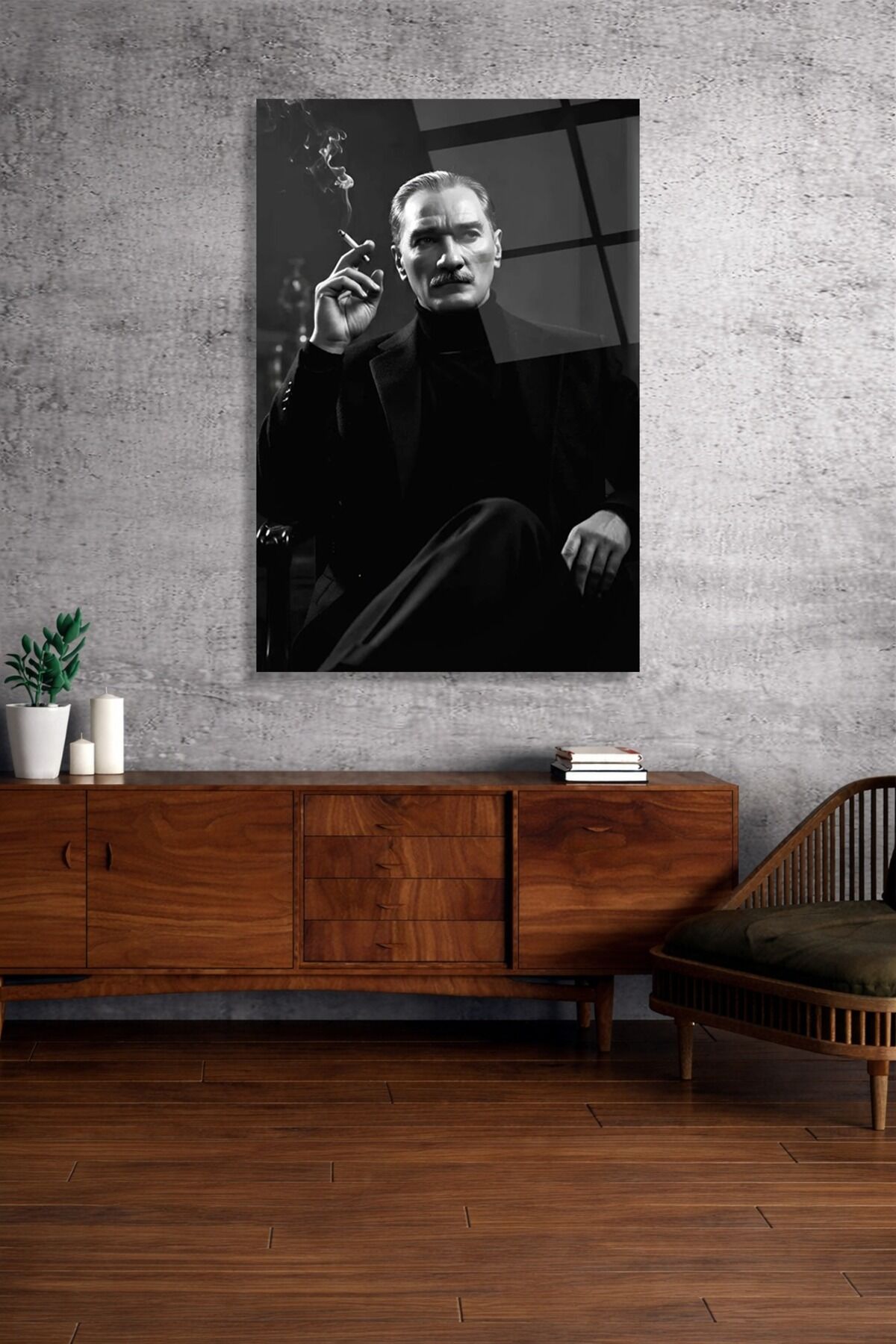 - Türkiye'de üretilen bu soyut temalı Mustafa Kemal Atatürk portresi, ev ve ofis dekorasyonunuza modern bir dokunuş katıyor.; - Çerçevesiz tasarımı sayesinde, duvarınızın doğal güzelliğini ön plana çıkararak minimalist bir görünüm sunar.; - Yüksek kaliteli cam materyali ile uzun ömürlü kullanım ve kolay temizlik imkanı sağlar.; - Tek parça halinde gelen bu ürün, kolay montaj avantajı ile hemen duvarınıza asılabilir.;