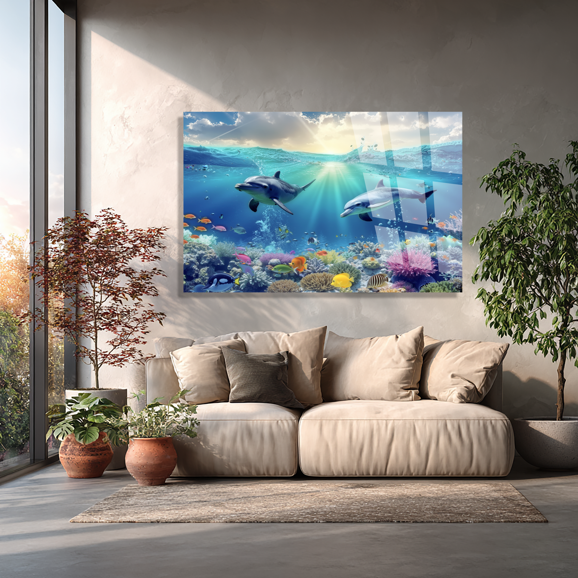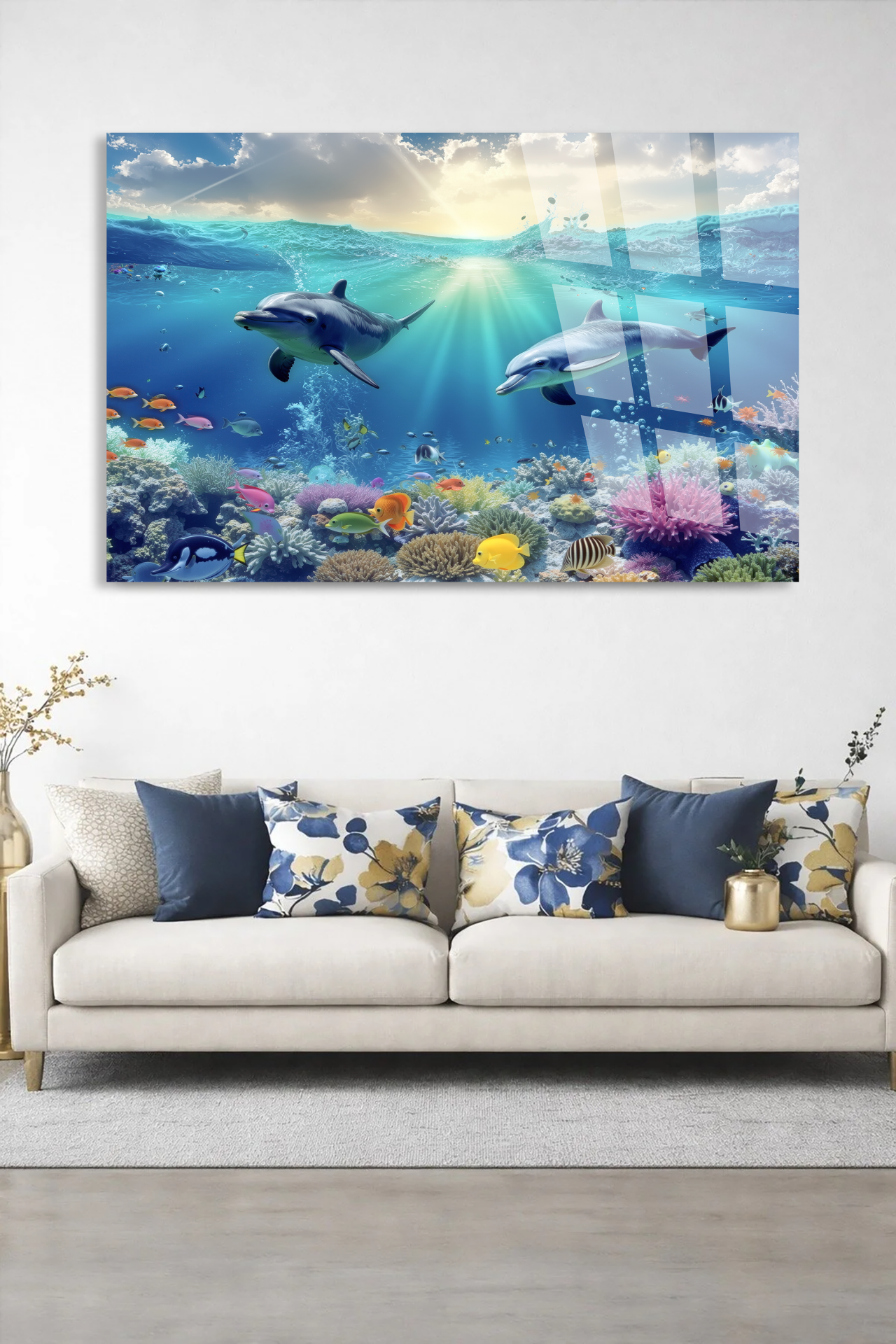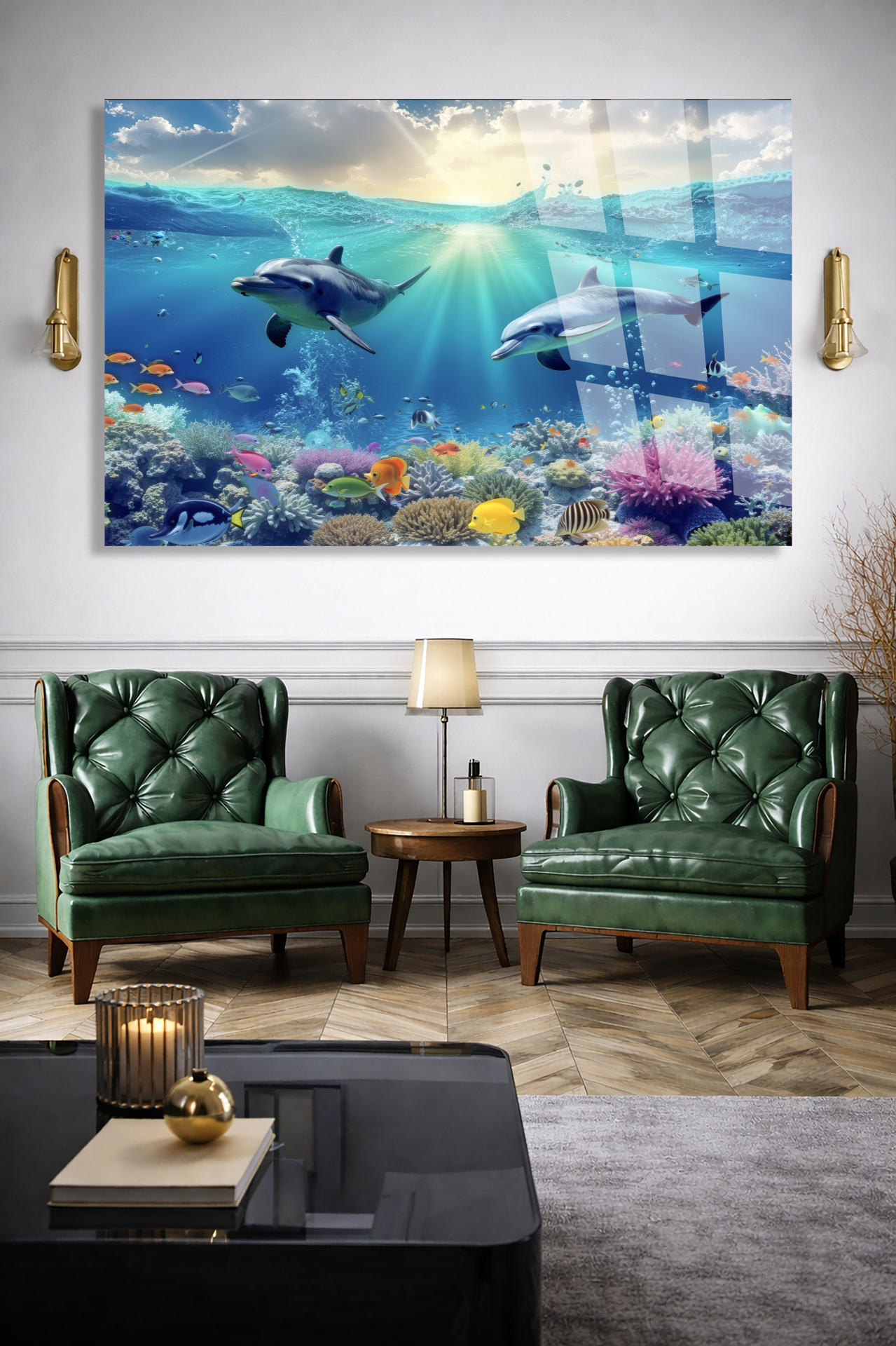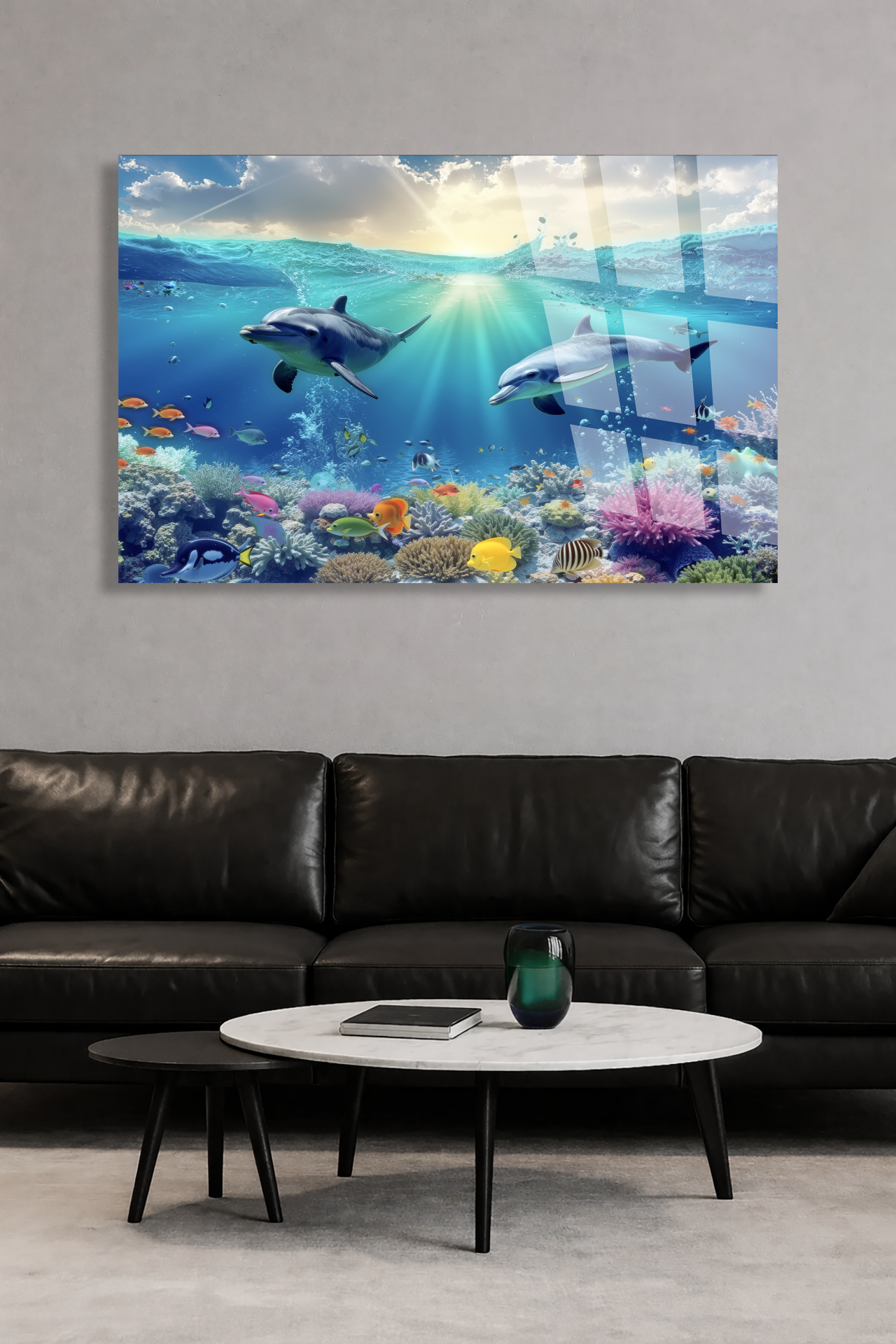KIRILMAZ CAM TABLO OKYANUS DÜNYASI YUNUS BALIKLARI MERCAN RESİFİ TASARIMI
