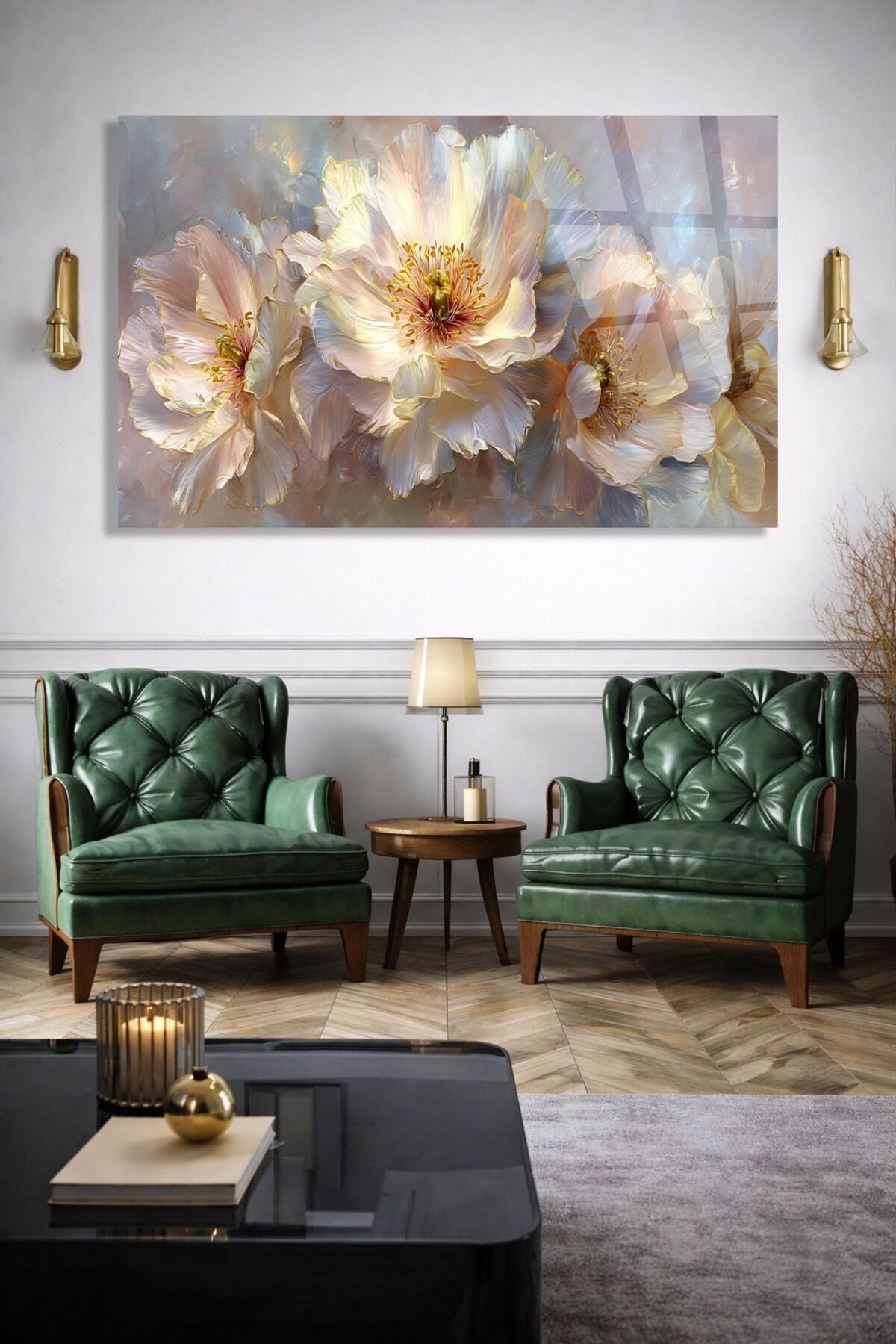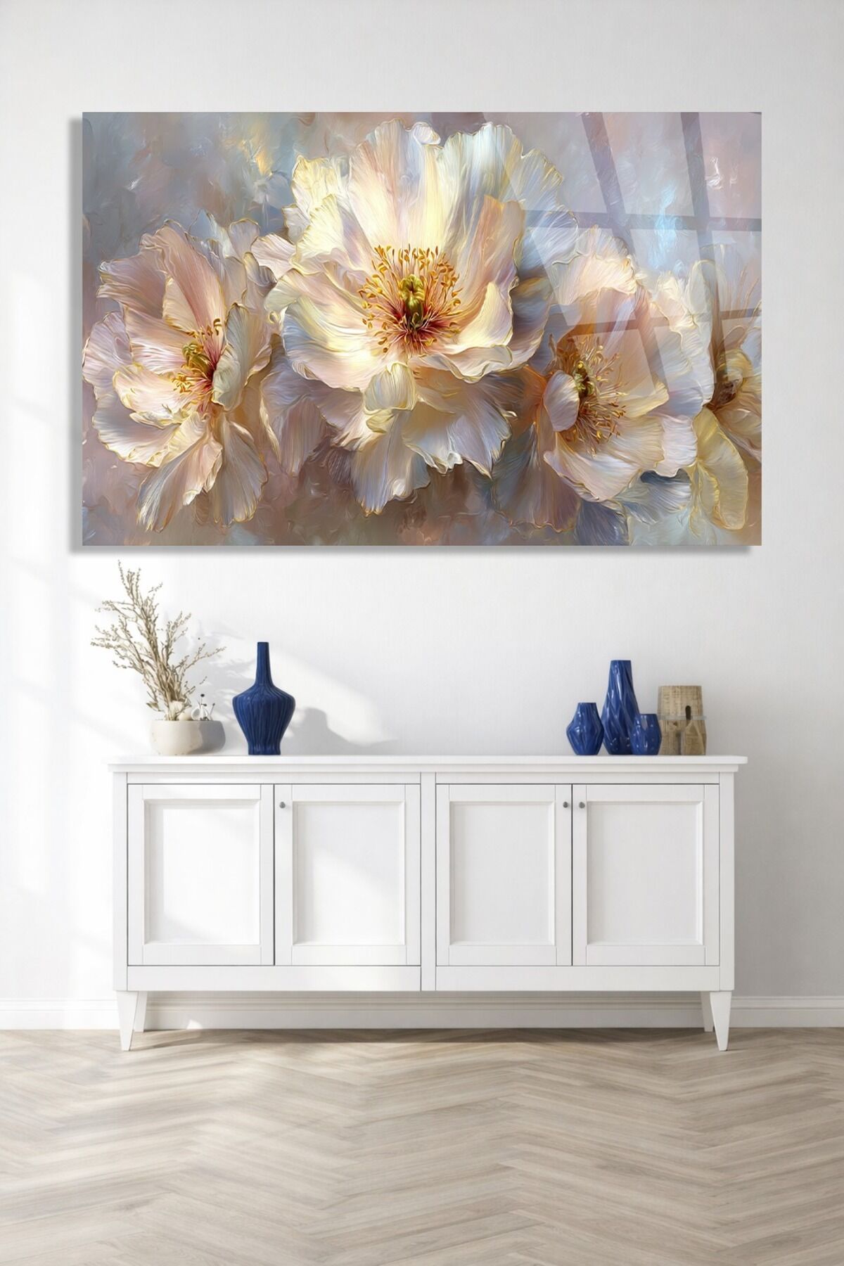 KIRILMAZ CAM TABLO PASTEL ÇİÇEK DESENLİ MODERN DUVAR TABLOSU Krem