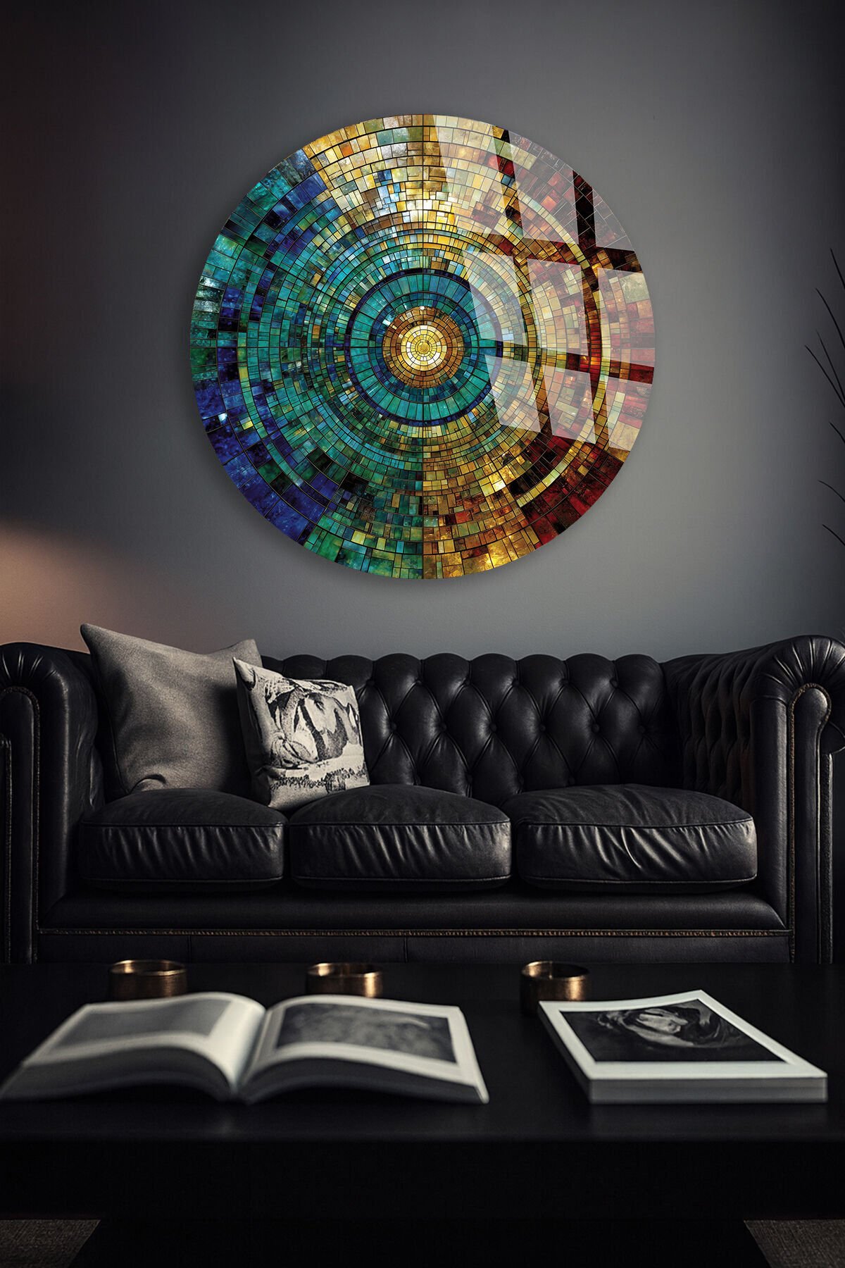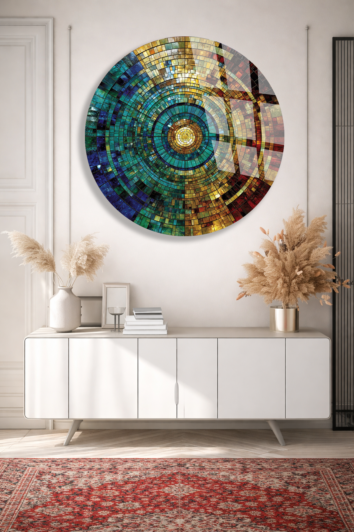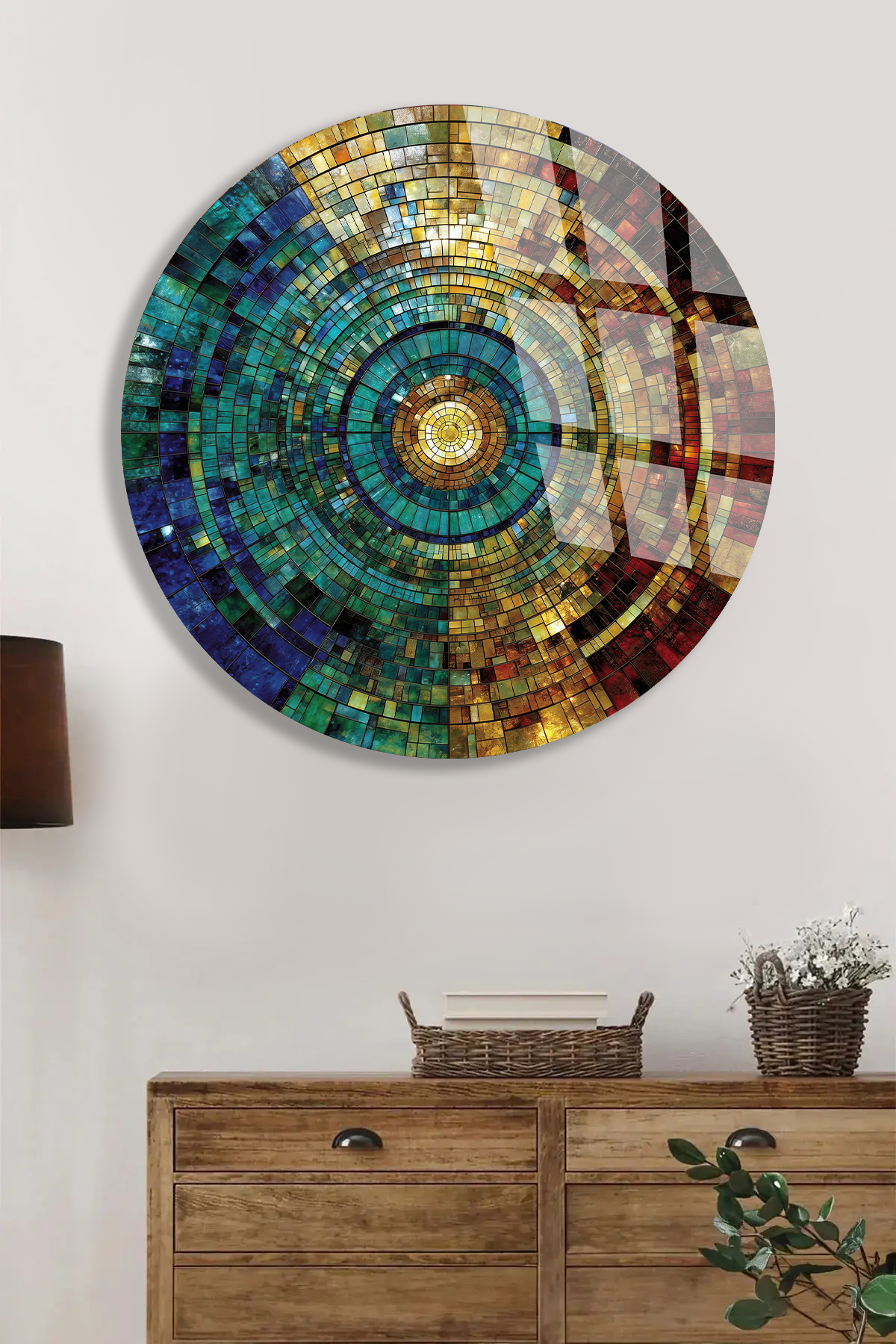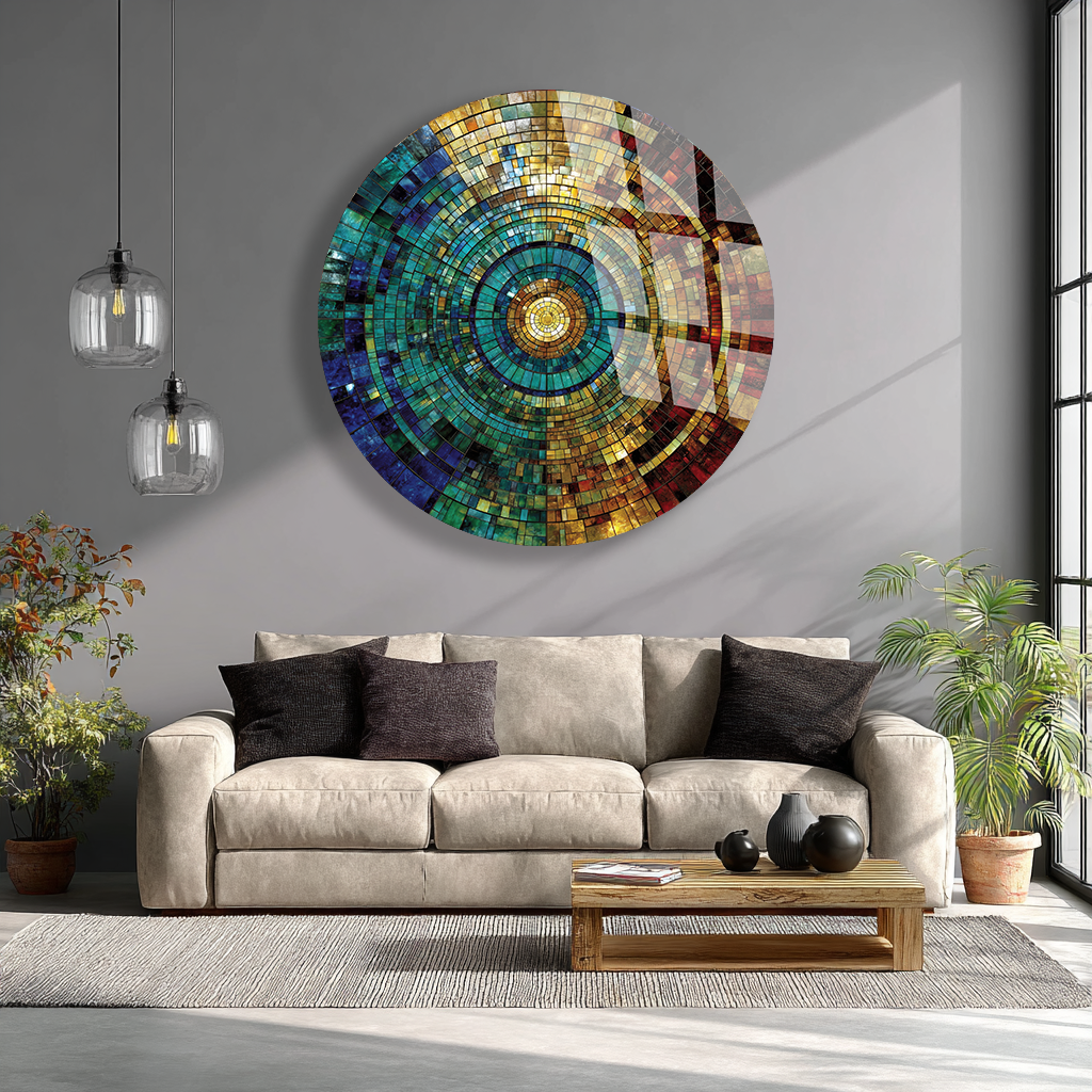 KIRILMAZ CAM TABLO – RENKLİ KOZMİK MOZAIK DAİRE SOYUT SANAT TASARIMI