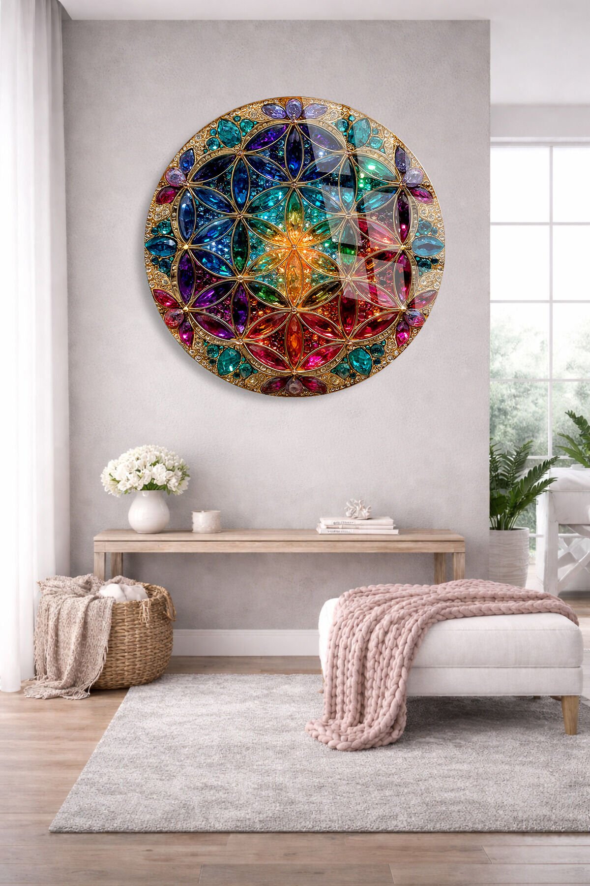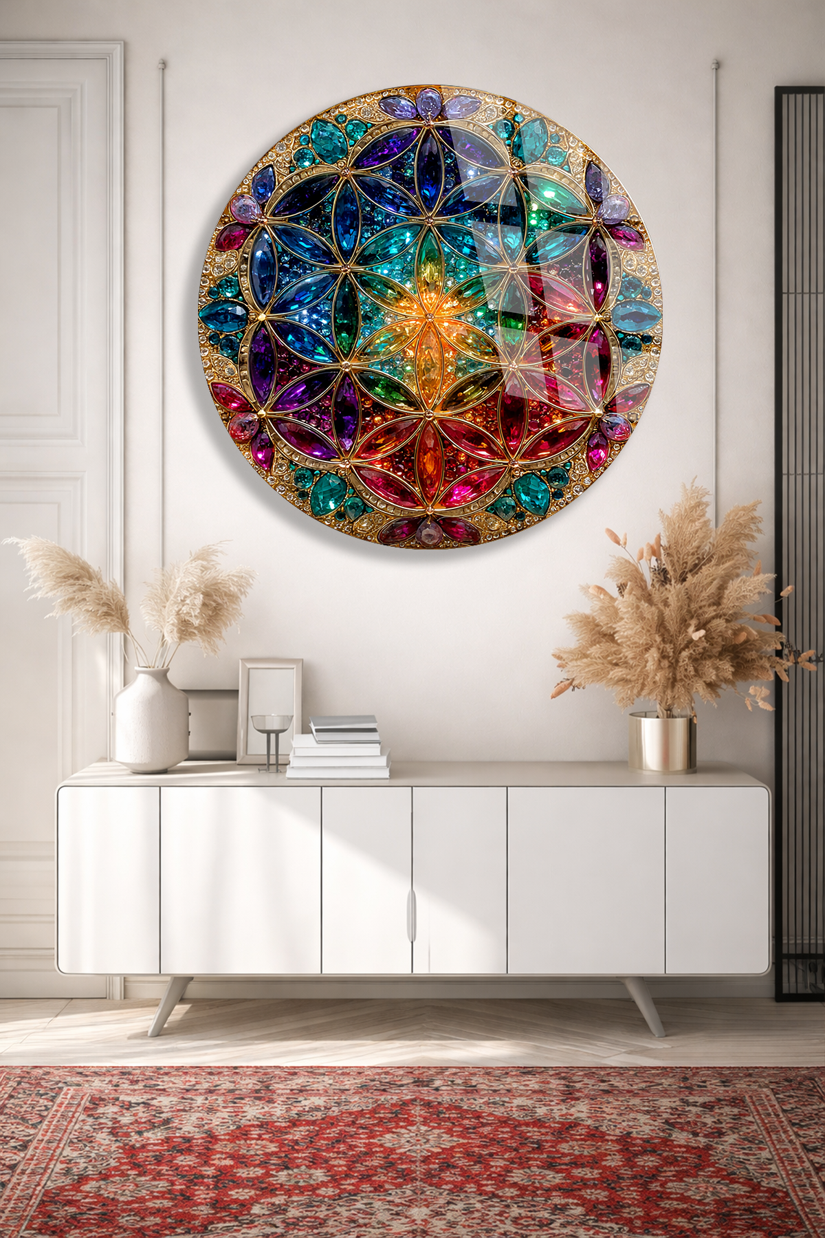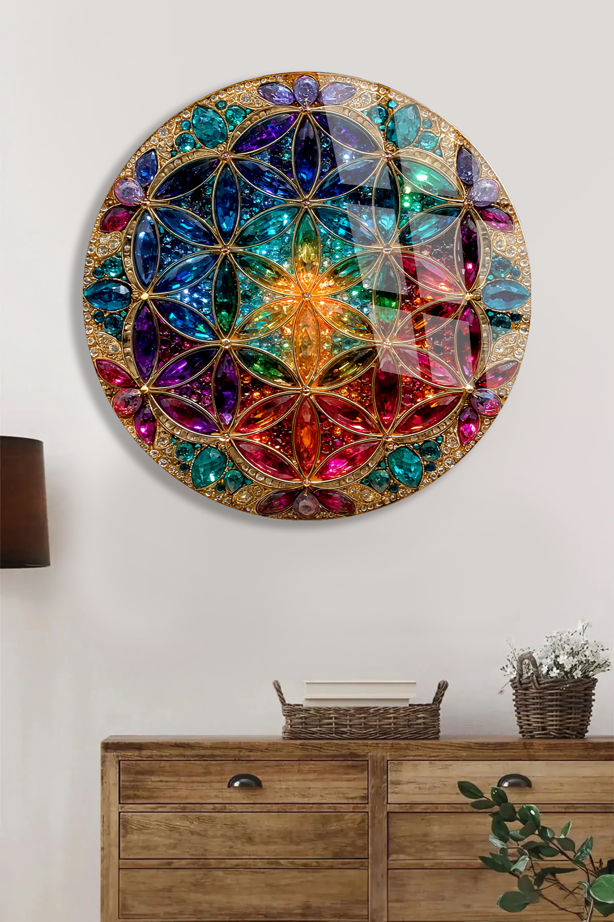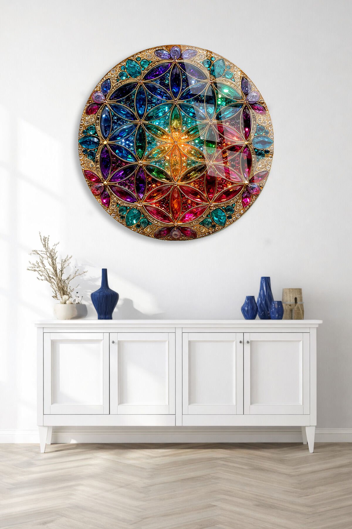 KIRILMAZ CAM TABLO – RENKLİ YAŞAM ÇİÇEĞİ MANDALA GEOMETRİK SANAT TASARIMI