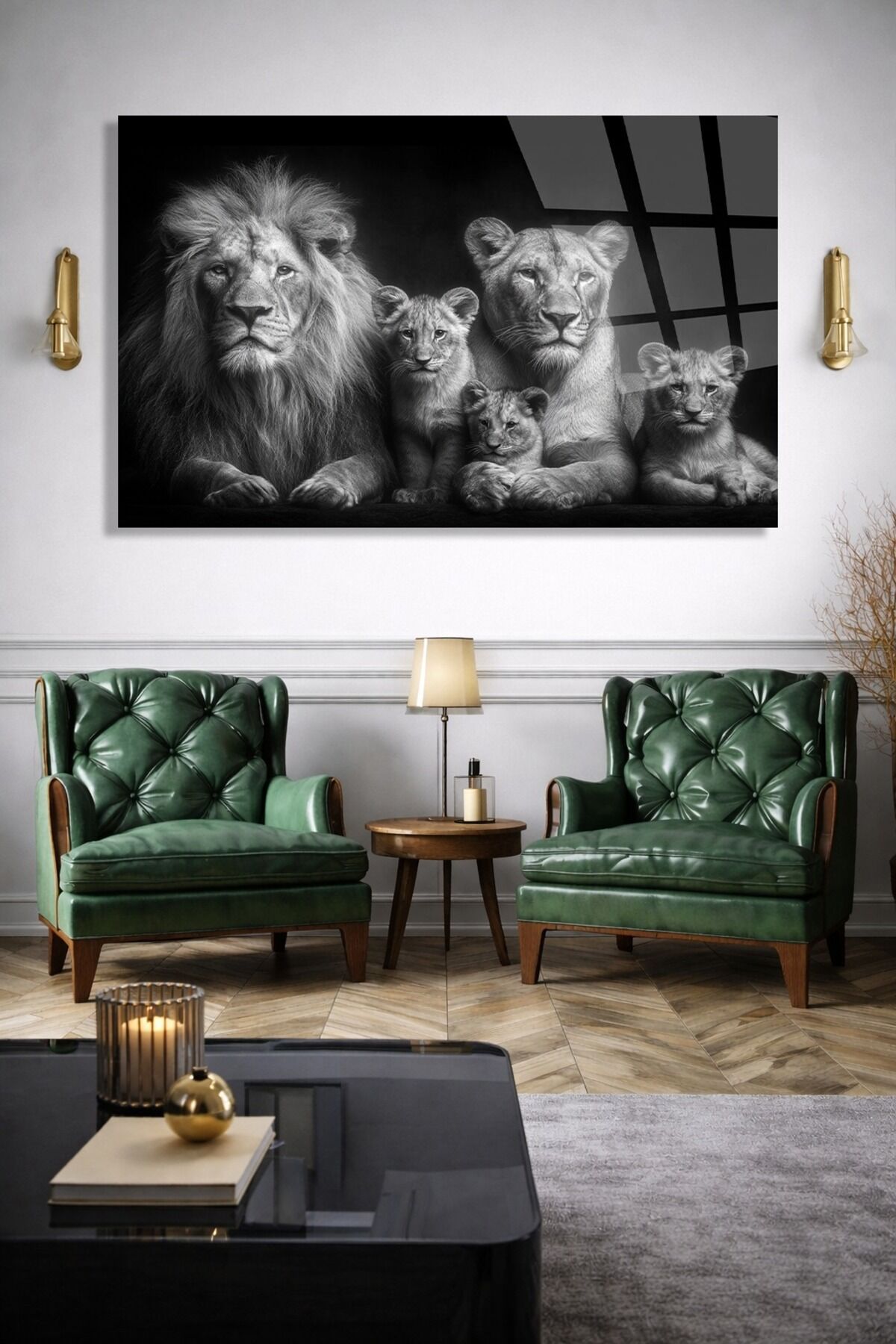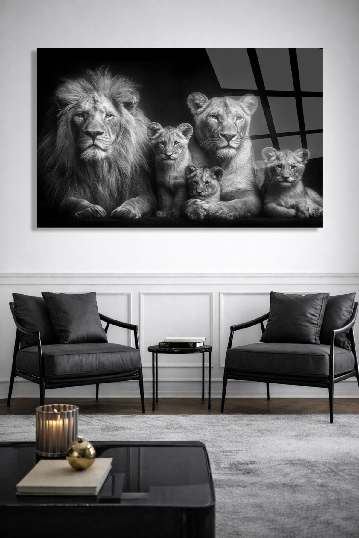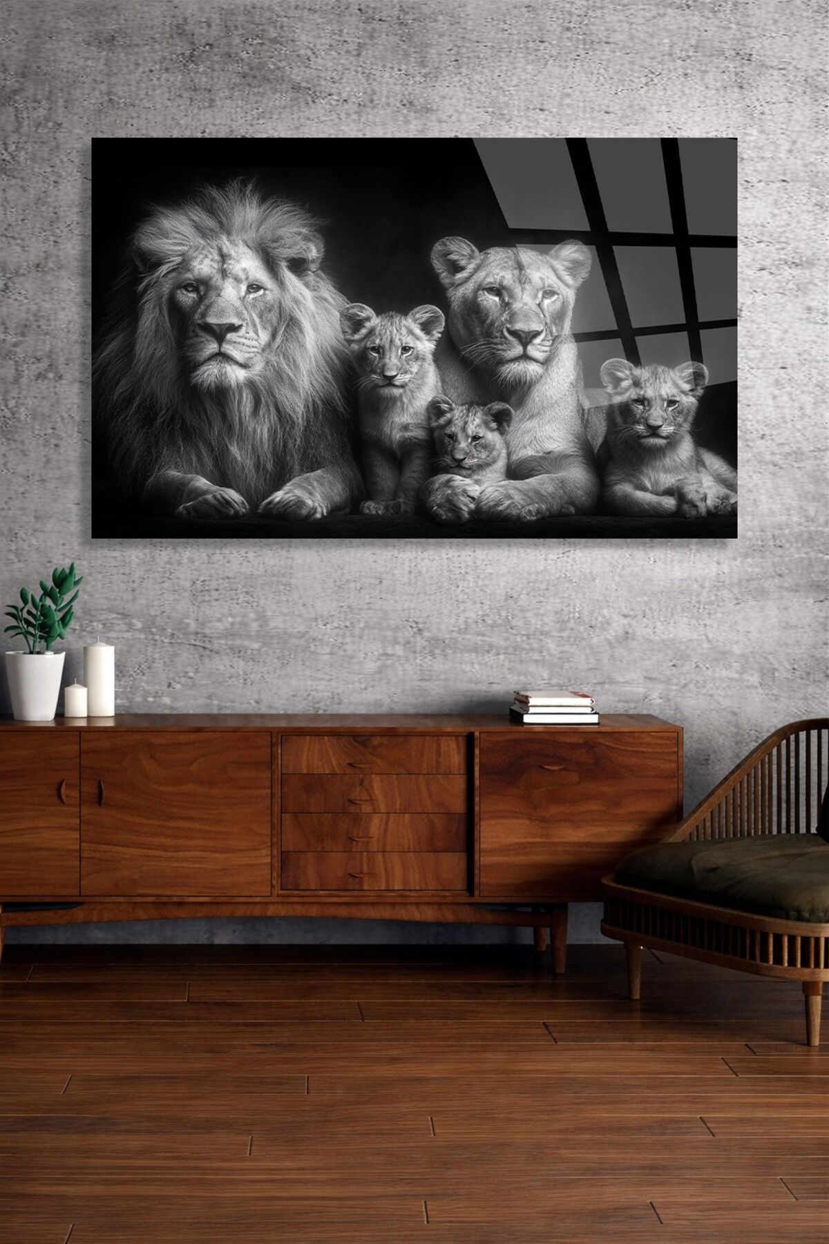 KIRILMAZ CAM TABLO SİYAH BEYAZ ASLAN AİLESİ 5 KİŞİLİK ASLAN AİLESİ DUVAR TABLOSU Gri