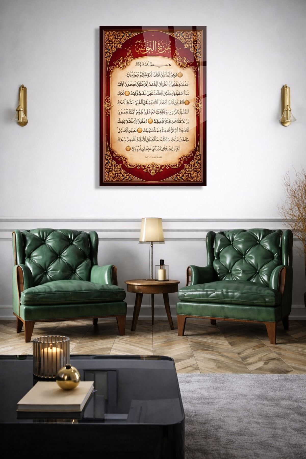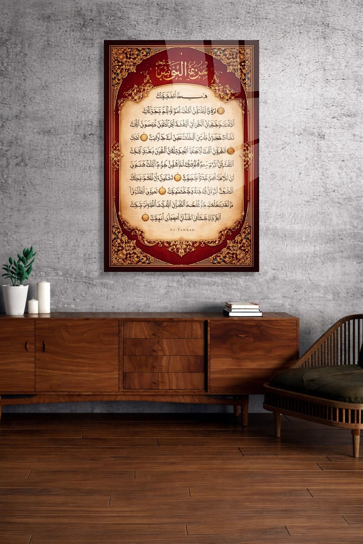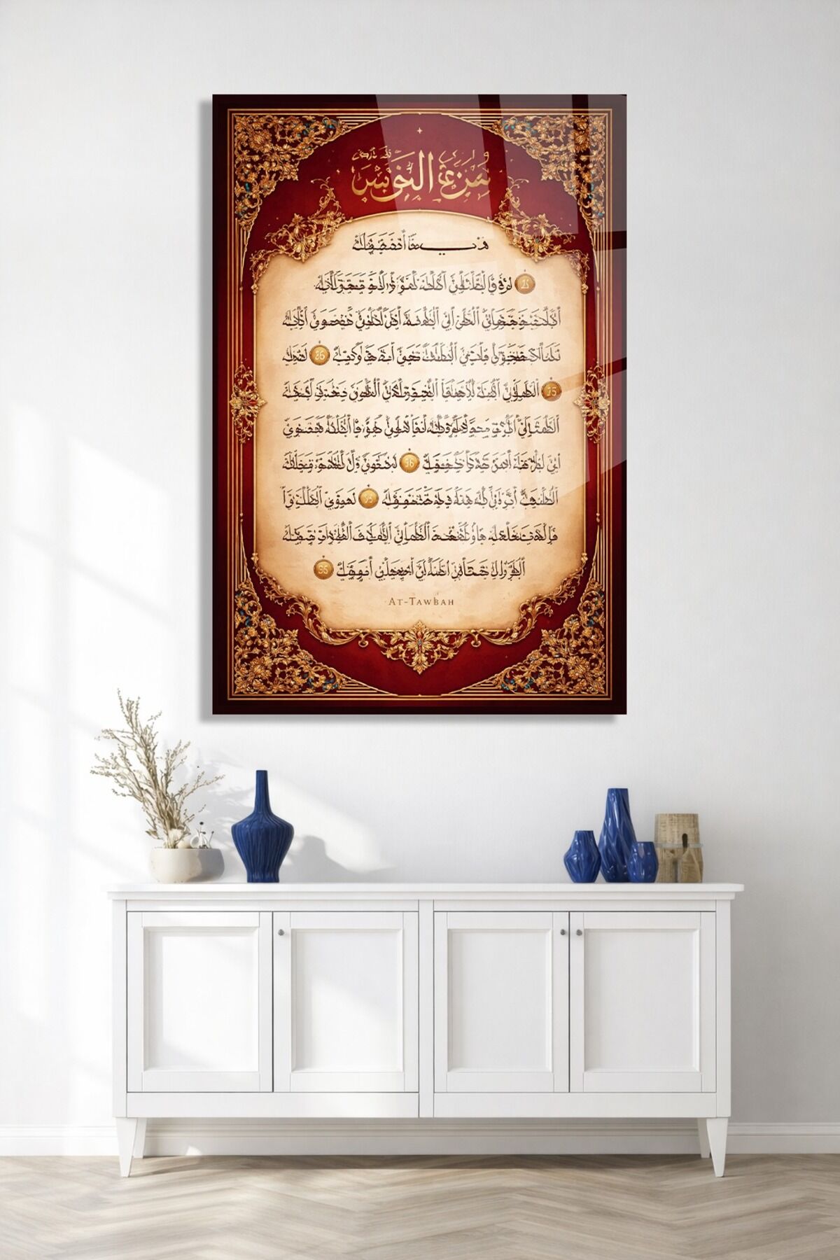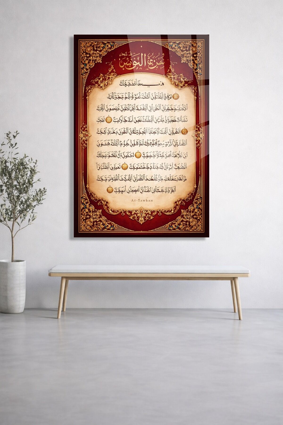 KIRILMAZ CAM TABLO TEVBE SURESİ ARAPÇA HAT DUVAR TABLOSU Kırmızı