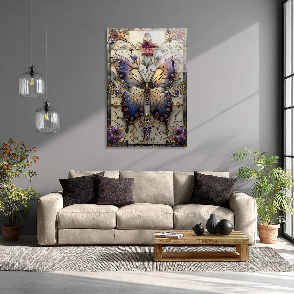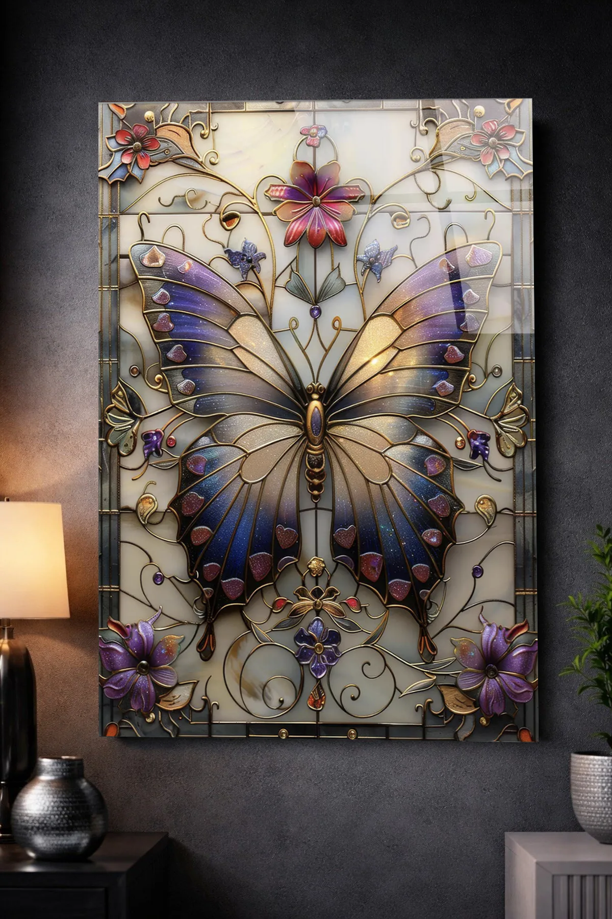KIRILMAZ CAM TABLO VİTRAY KELEBEK ÇİÇEKLİ SANATSAL LÜKS DUVAR DEKORU