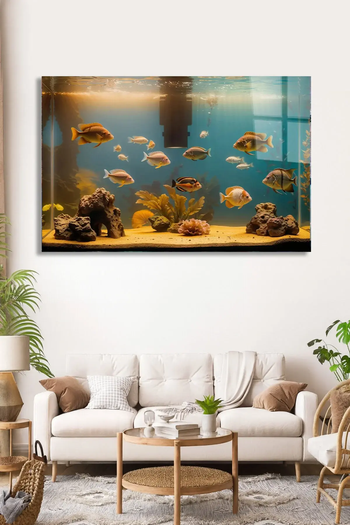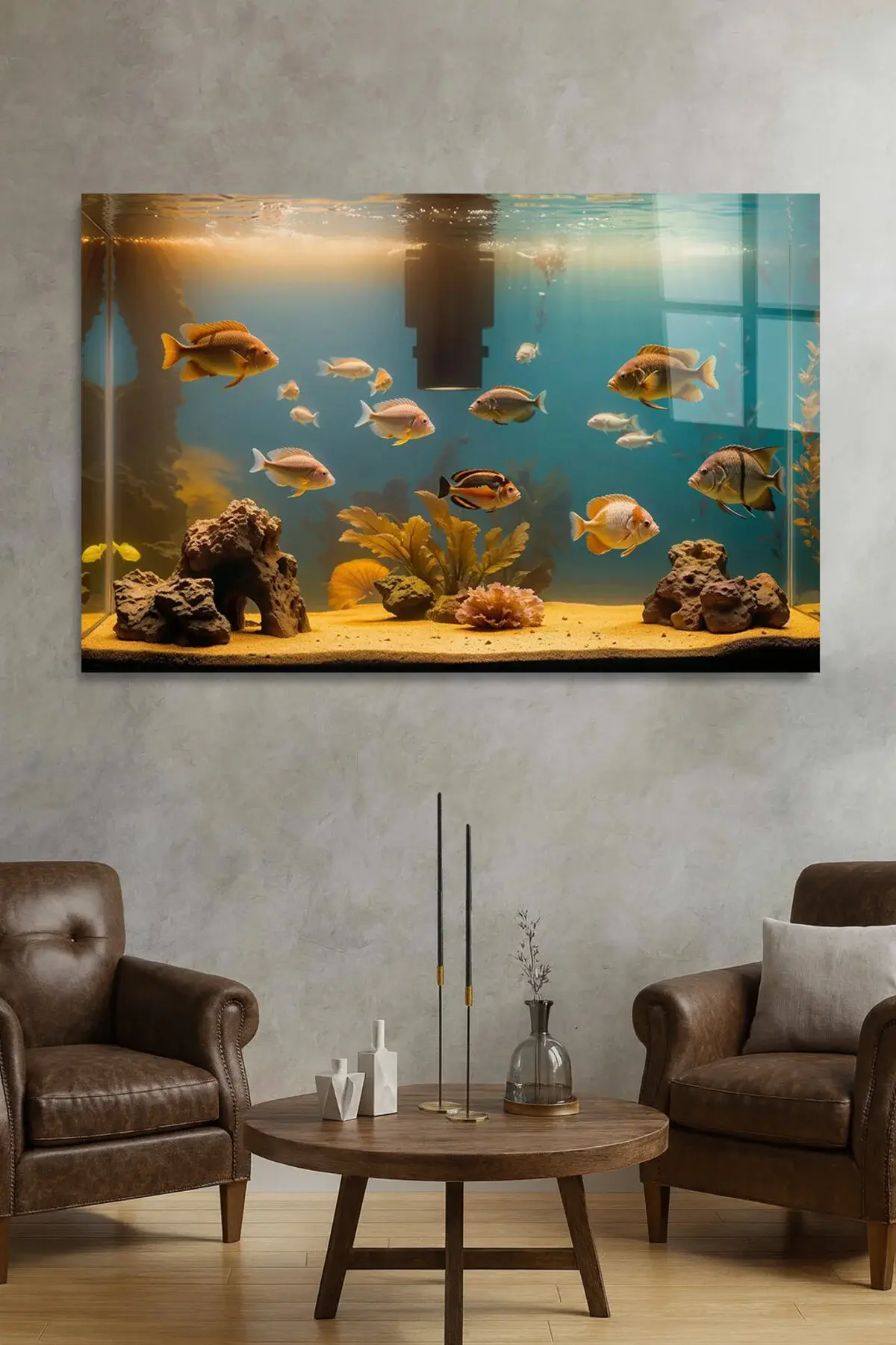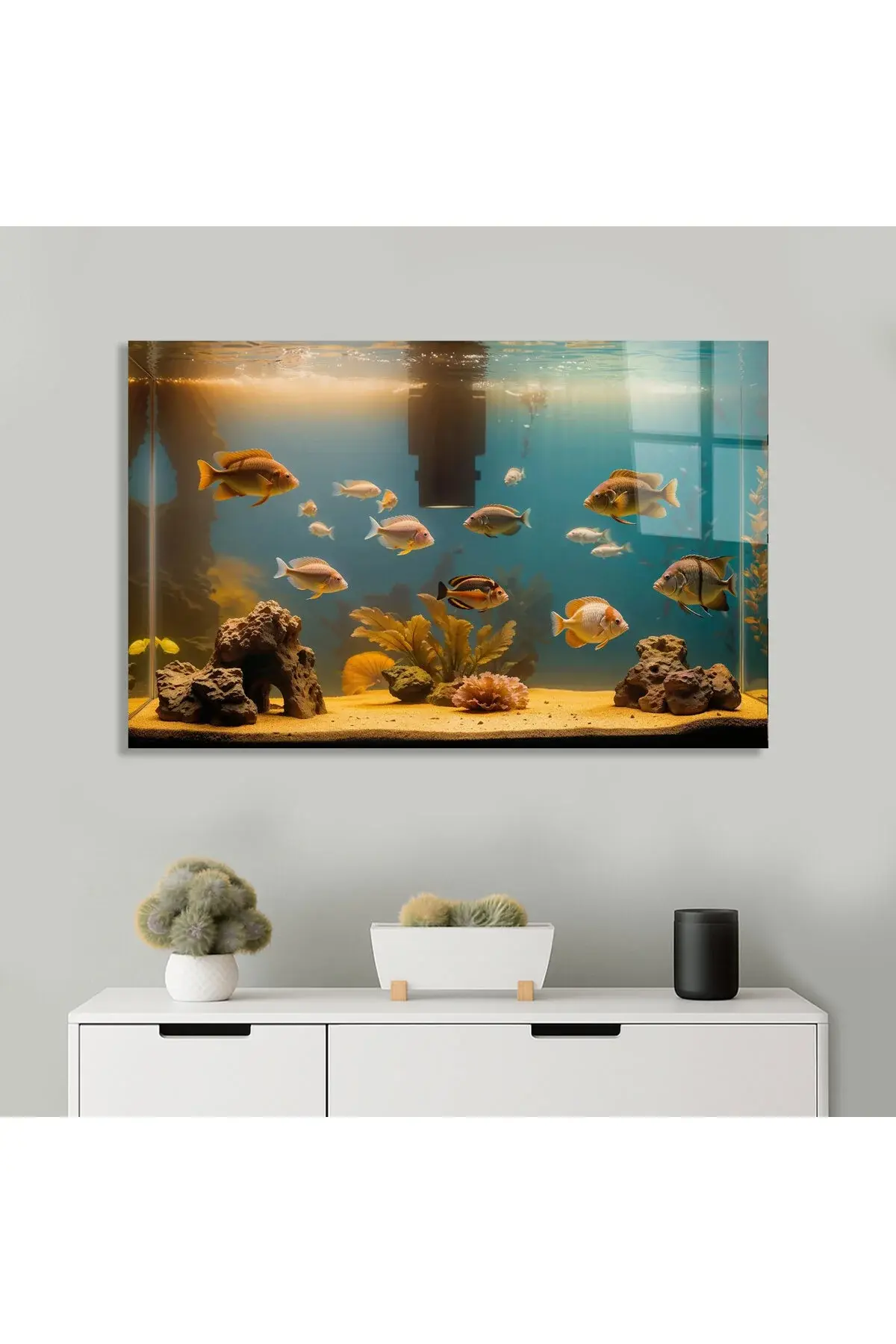 KIRILMAZ LÜKS CAM TABLO AKVARYUM TEMALI RENKLİ BALIK TASARIMI SALON OTURMA ODASI MODERN TABLO Sarı