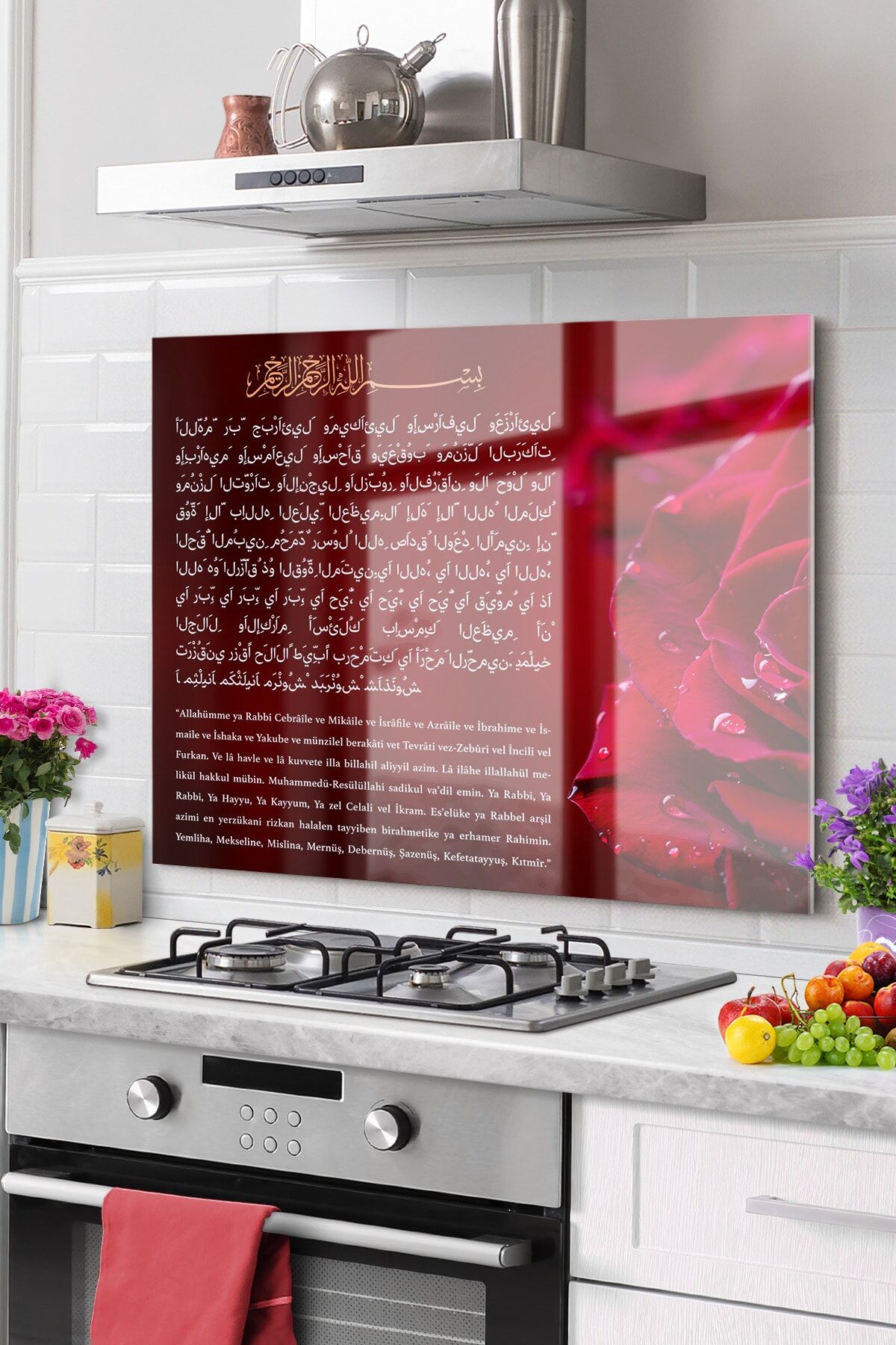 Kırmızı - Premium Mutfak Cam Ocak Arkası Koruyucu | Bereket, Sofra,karınca Duası