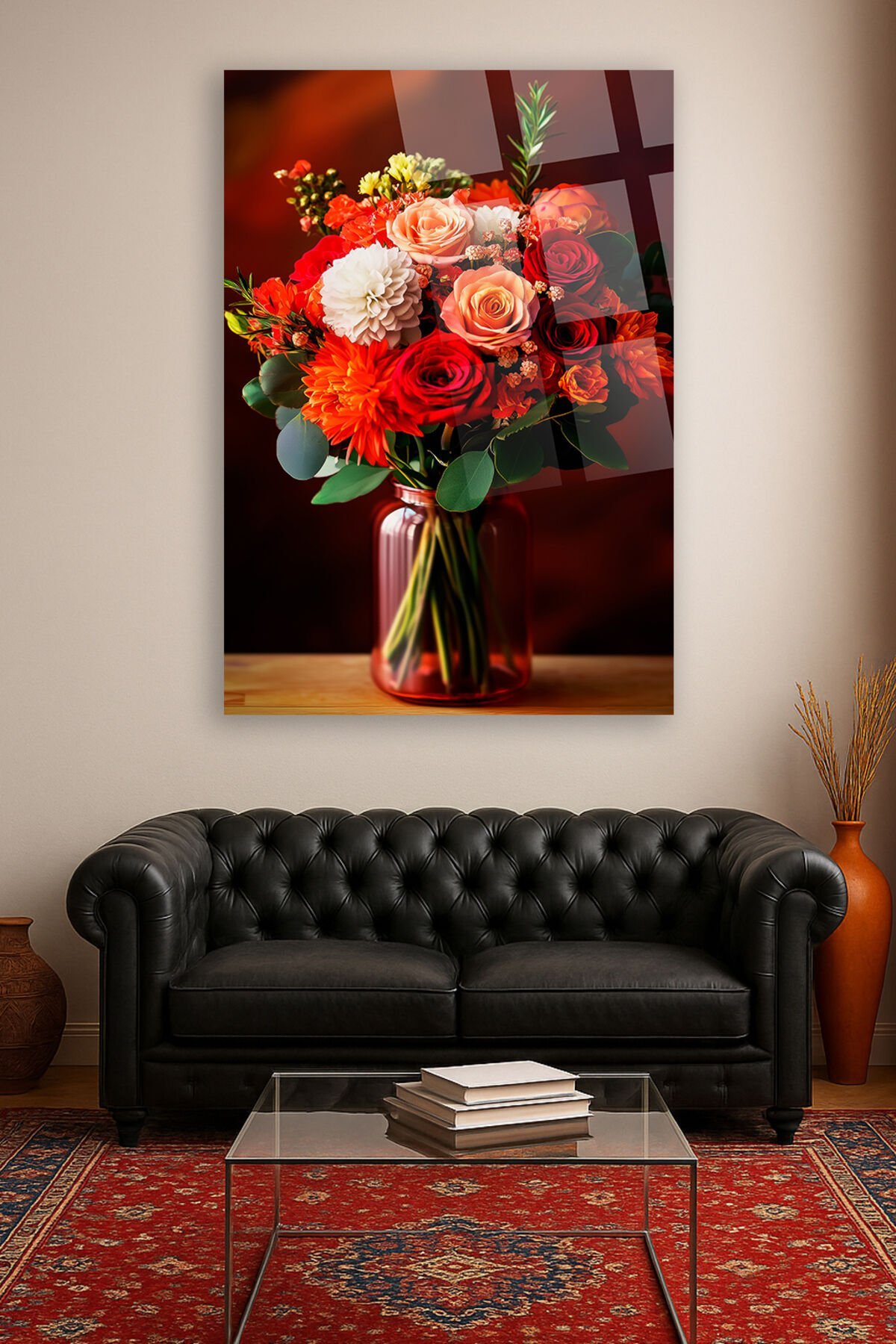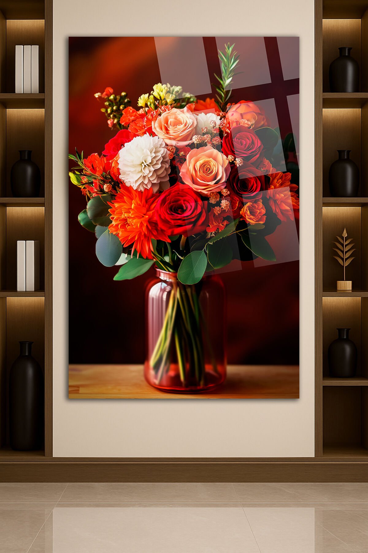 Kırmızı ve Turuncu Çiçek Buketi Cam Tablo – Modern Dekoratif Floral Tasarım Ultra Canlı Renkler Kırmızı