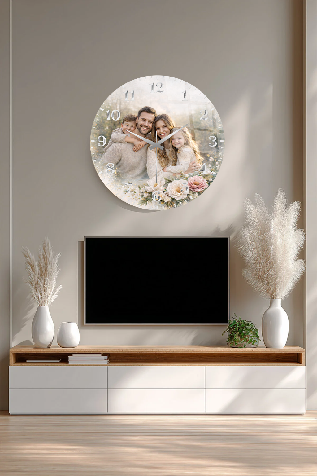 KİŞİYE ÖZEL MODERN YUVARLAK KIRILMAZ CAM SAAT LOGO BASKI, ÖZEL FOTOĞRAF BASKI EV HEDİYESİ SAAT