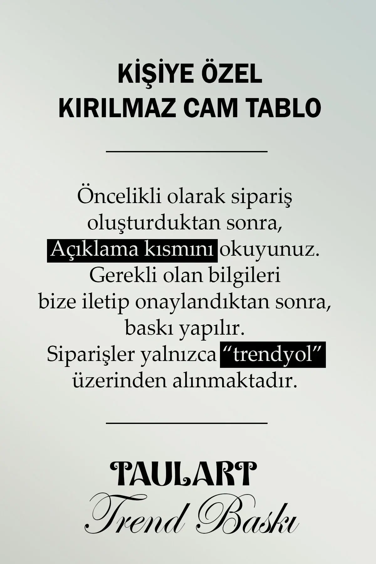 Cam tablolarımız 4 mm kalınlığında temper işlemi (ısıl işlem) görmüştür.; Kenarları rodajlanmış (kesiciliği giderilmiş) yüksek kaliteli düz camlardan oluşmaktadır.; Normal camlara göre kırılmaya 10 kat daha dayanıklıdır.; Gönderilirken özel koruma aparat ve ambalajları ile gönderilmektedir.; ; Tarafımızca hazırlanan özel tasarımlar doğrudan cam yüzeyine uv baskı tekniğiyle yüksek çözünürlüklü makinalarımız tarafından uygulanır.; Bu nedenle yüksek kaliteli,mükemmel bir görüntü derinliği sağlar.; Herhangi bir medyaya(folyo,kağıt v.; b.; ) baskı yapılmış görselin cam yüzeyine yapıştırılması şeklinde değildir.; Görsellerimiz camın arka yüzeyine doğrudan uv cam boyası kullanılarak basılır ve özel koruma boyası ile arka yüzey kapatılır.; Baskı cam ile arka koruma boyası arasında kalır.; Tasarımları ön yüzeyden camın parlaklığı ve şıklığı ile görürsünüz.; Cam tablolar zamanla solmazlar ve renkler canlılığını hiç kaybetmez.; ; Özel tasarım cam tablolar duvar dekorasyonunda yeni bir sayfa açmaktadır.; Özellikle ev ve ofis dekorasyonunda büyük tablolar duvarlarda çok şık bir görünüm sağlarlar.; Dekoratif ve zarif tablolar ev ve ofis duvarlarınıza estetik bir hava katar.; ; Tablolarımız sizler için özel olarak tasarlanmıştır.; ; Temizliği son derece kolay olan cam tablolarımızı,herhangi bir kimyasal ürünle veya nemli bez ile gönül rahatlığıyla silebilirsiniz.; Özel askı aparatı sayesinde ürünlerimizin duvardan kazara düşme olasılığı çok düşüktür.; Tek çivi ile kolayca duvara monte edebilirsiniz.; Ürün asıldığında duvardan 2 cm önde durmaktadır.; ; Kargo esnasında yaşanacak her türlü olumsuzluk(kırılma v.; b.; ) firmamıza aittir.; Kırılma olasılığı %1 in altındadır.; Özel çerçeveli kargo metodumuz Türkiyede yalnızca tarafımıza aittir bu sayede kırılma yaşanmamaktadır.; En ufak bir sorunda ise sizlere sağlam şekilde ulaşıncaya kadar tekrar gönderilir.; ; Üretici firma olarak özel tasarımlarıyla camı birleştirerek yaşam alanlarınıza şık bir görünüm ve modern bir hava katmayı amaç edinilmiştir.Kişiye özel Tablo seçeneğimiz de mevcuttur kişiye özel cam tablolalar için iletişime geçiniz.