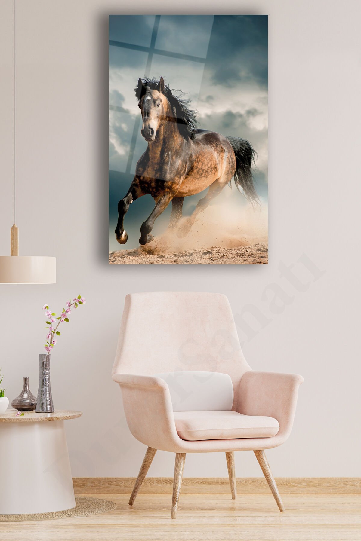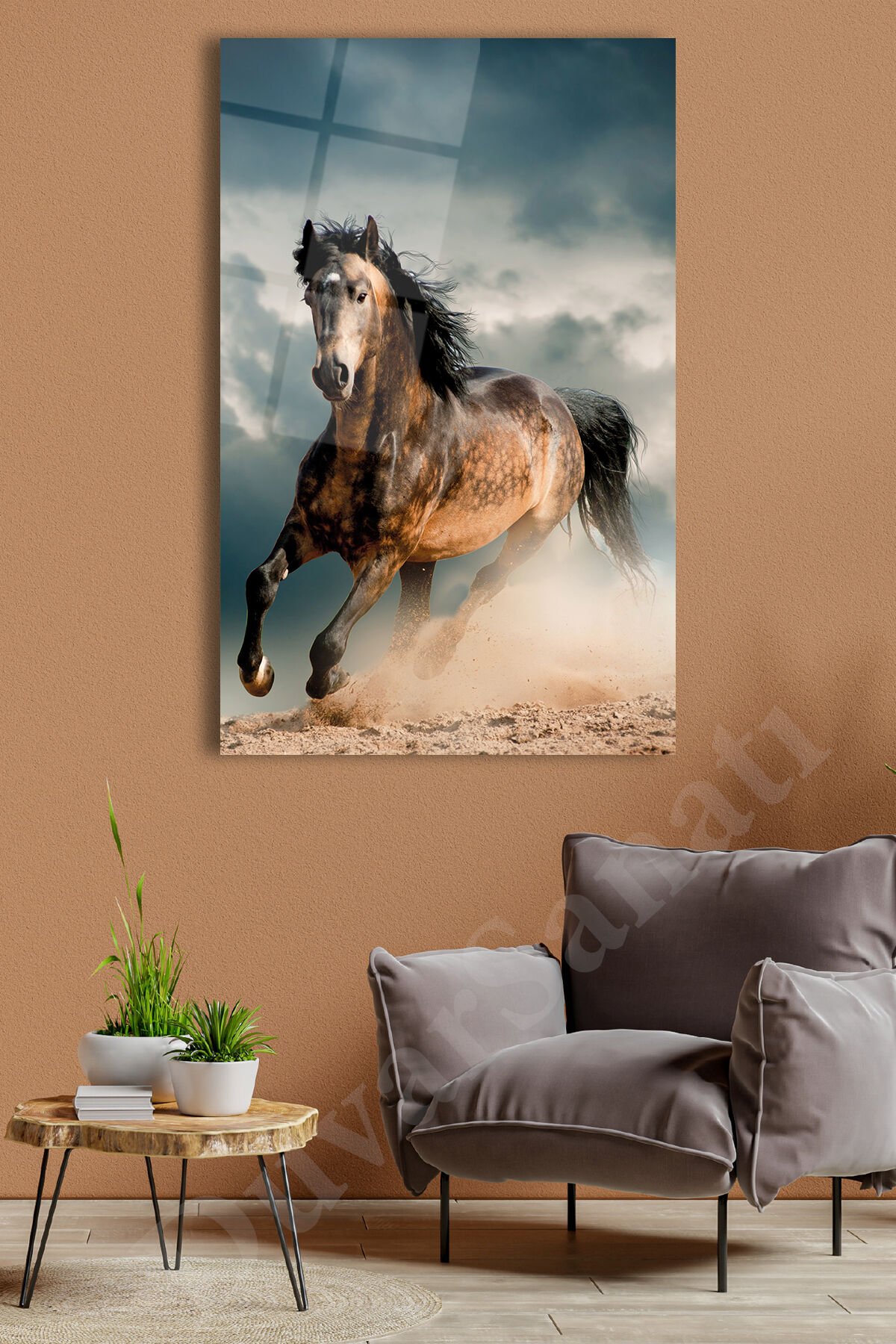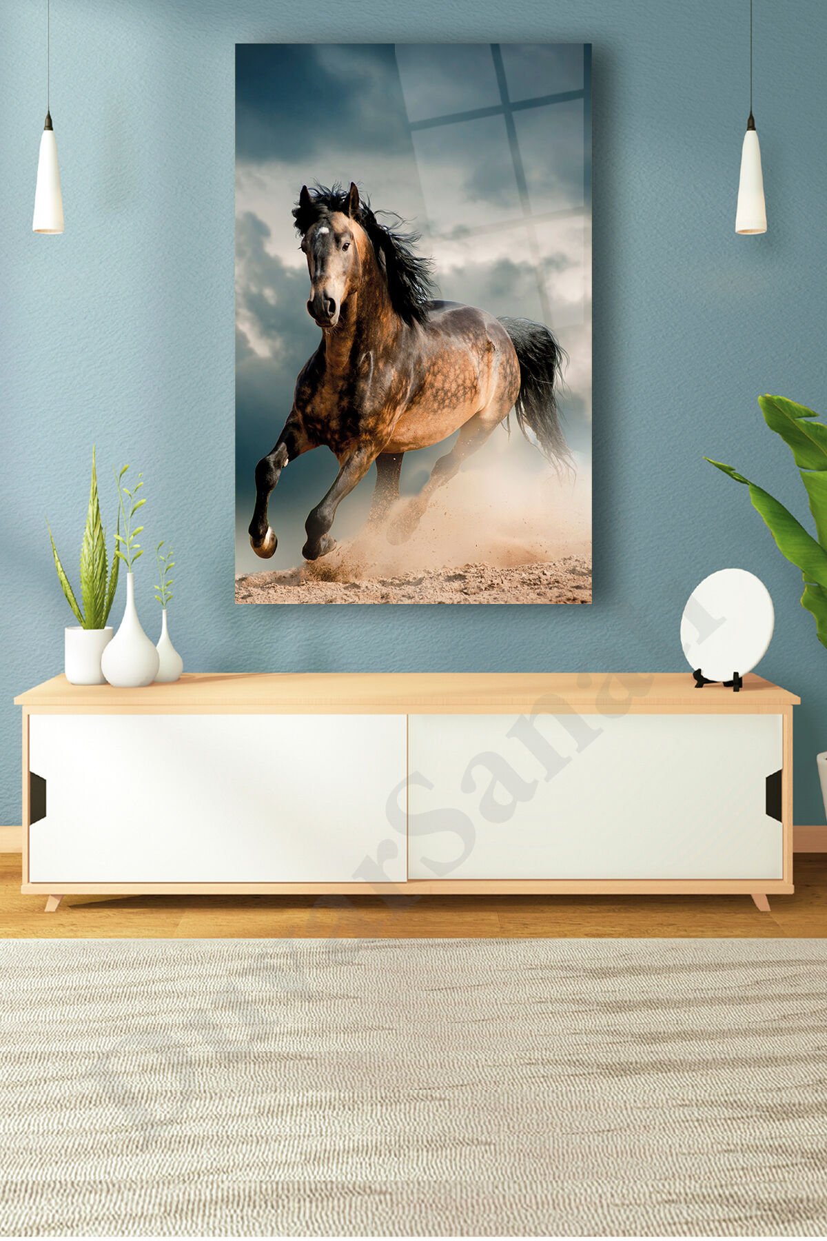 Koşan At Cam Tablo Ev Ofis Salon Hediyelik Büyük Tablo Kahverengi