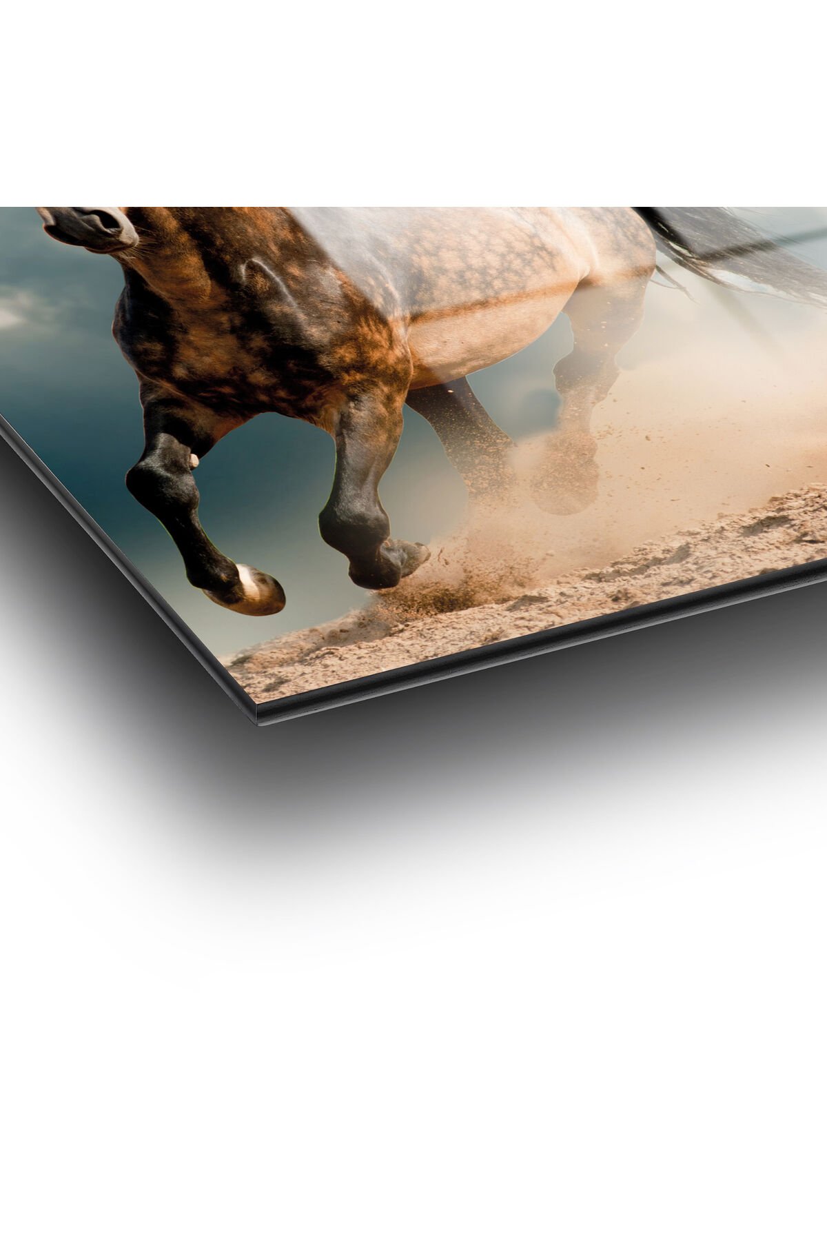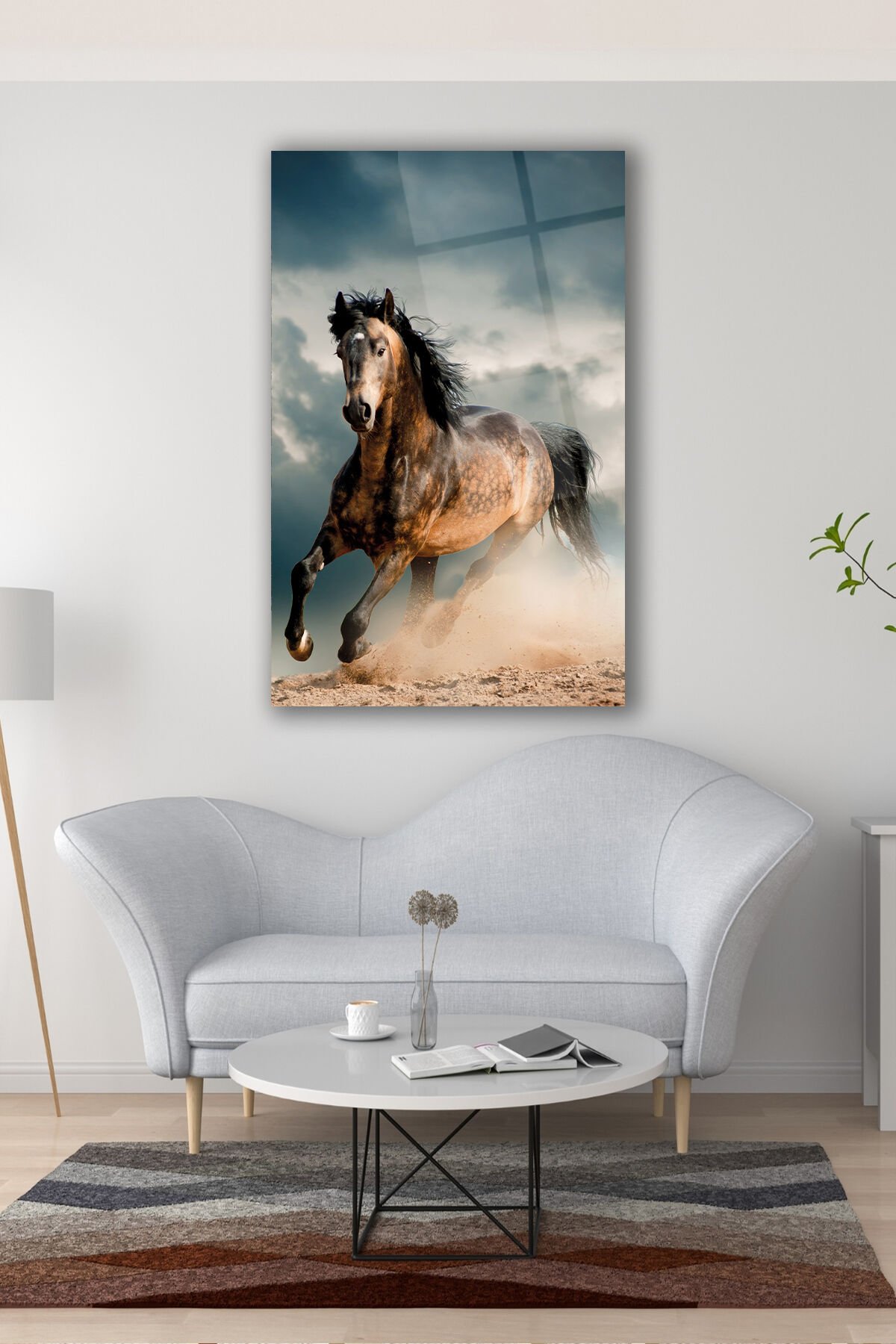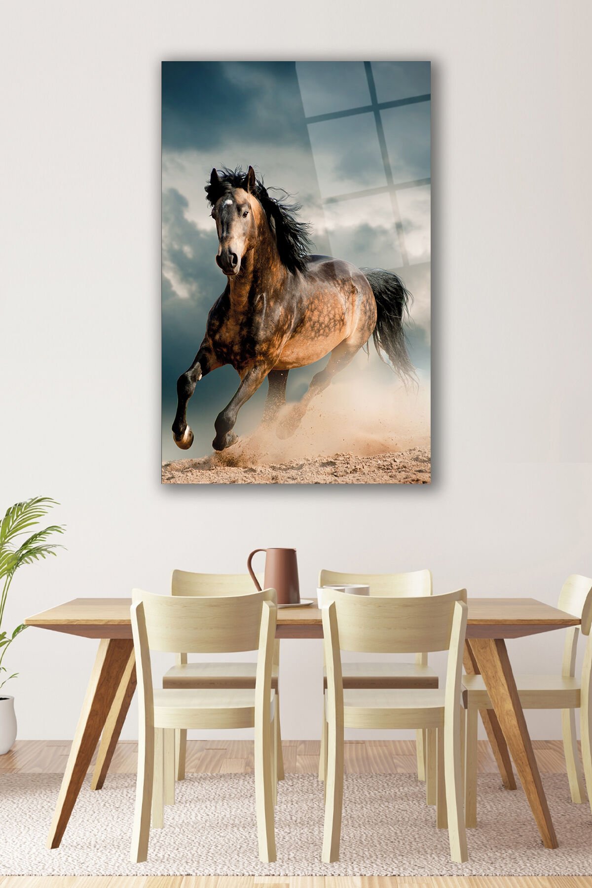 Koşan At Cam Tablo Ev Ofis Salon Hediyelik Büyük Tablo Kahverengi