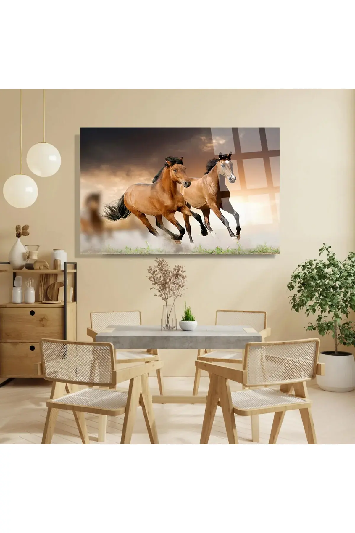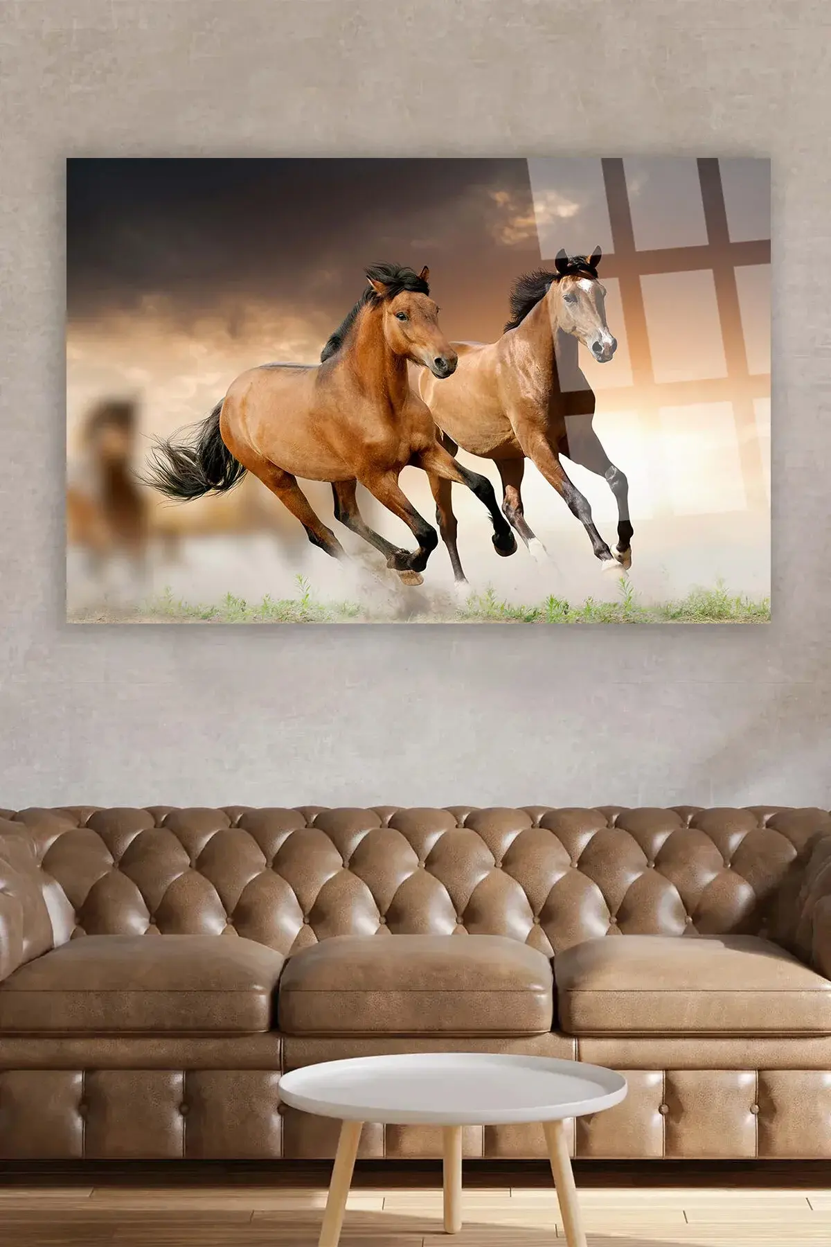 KOŞAN ATLAR ULTRA CANLI RENKLİ KIRILMAZ CAM TABLO EV HEDİYESİ AT TABLOSU Turuncu