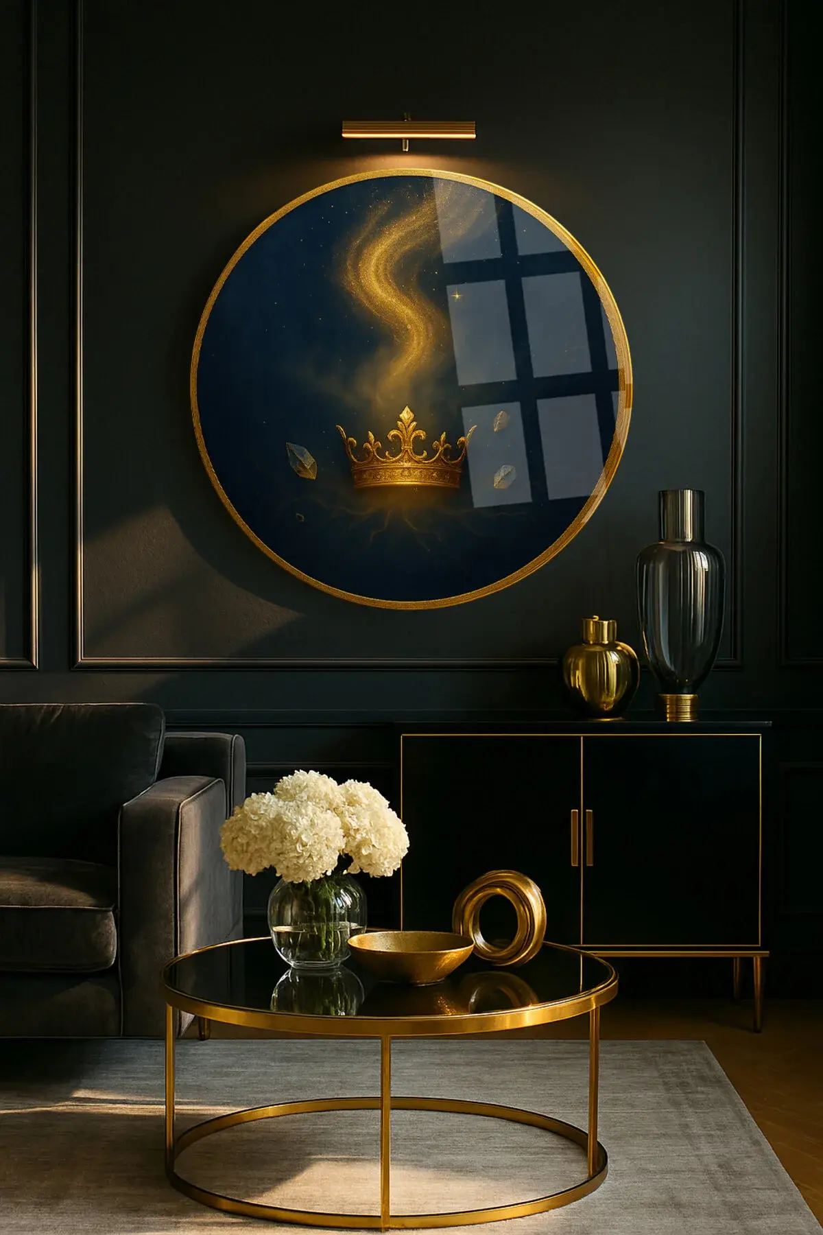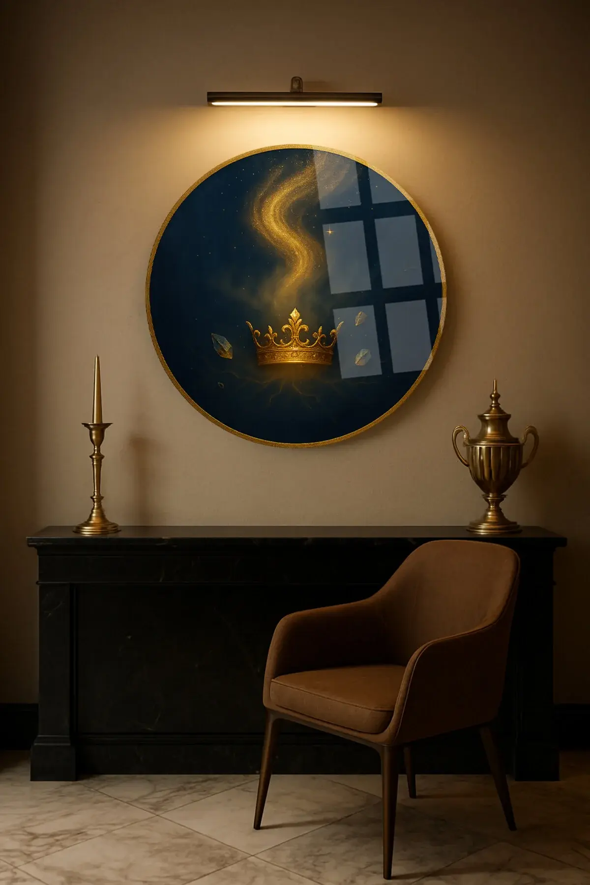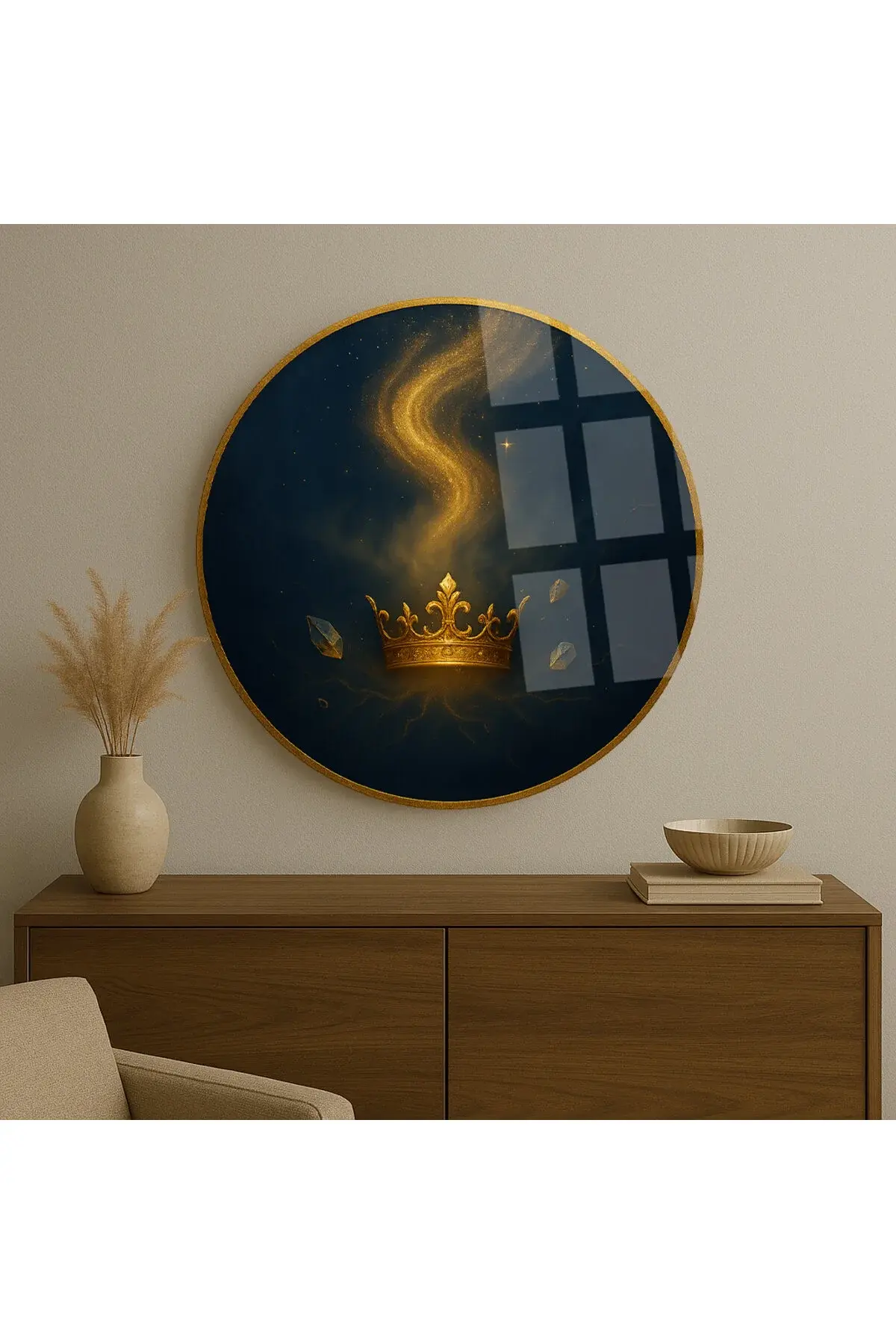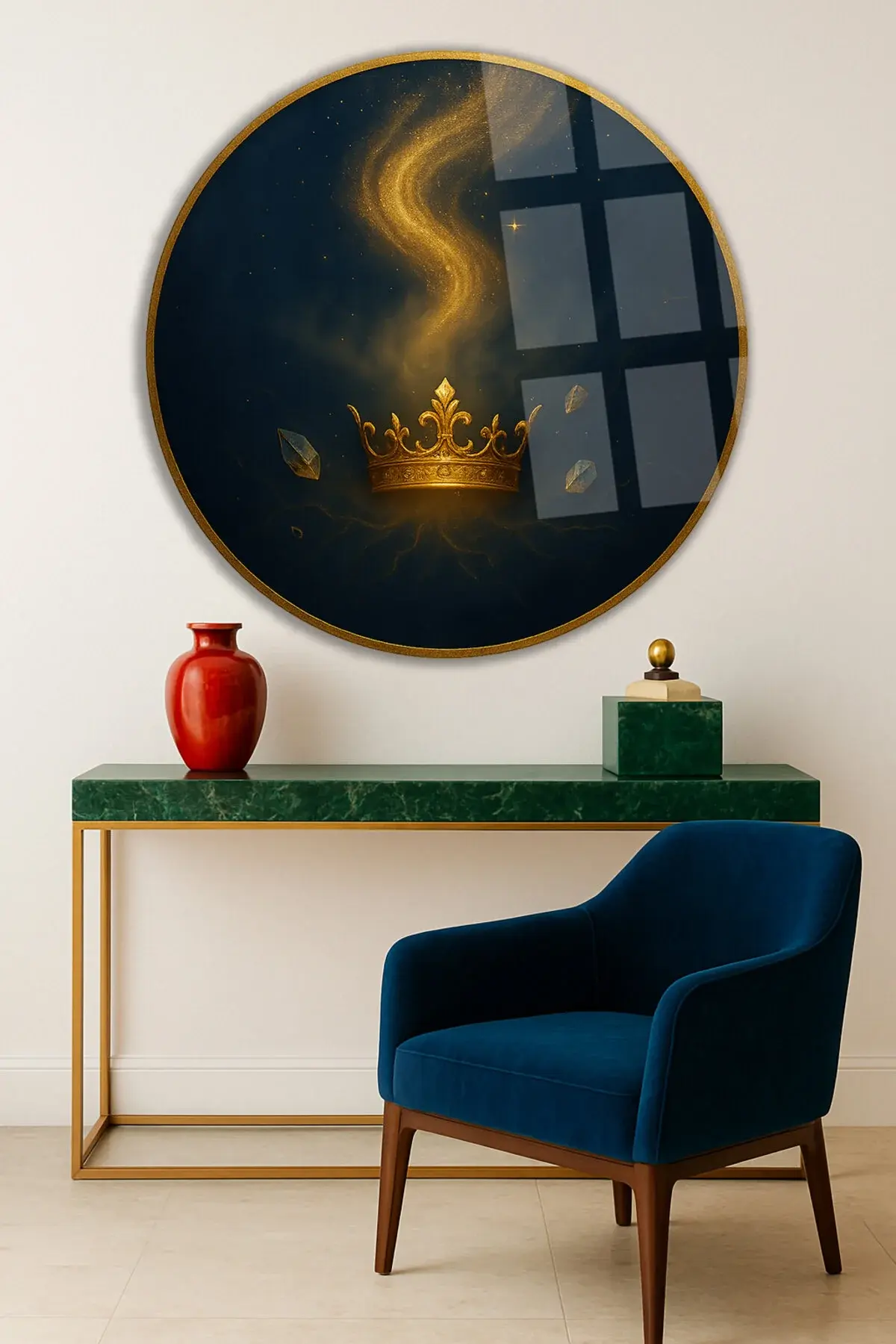 KRAL TACI TASARIMI KIRILMAZ YUVARLAK CAM TABLO LÜKS EV HEDİYESİ ULTRA CANLI RENKLİ Lacivert