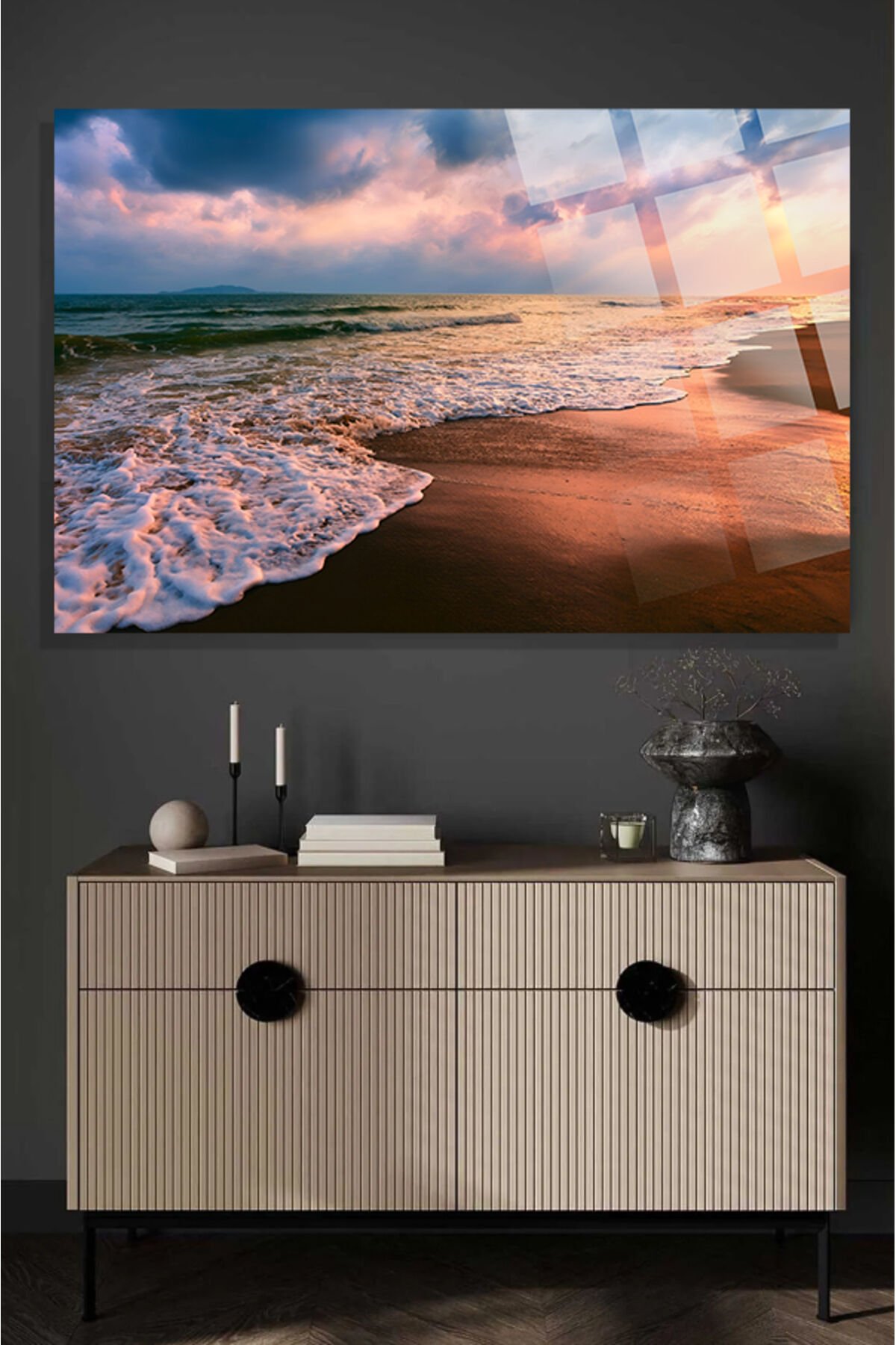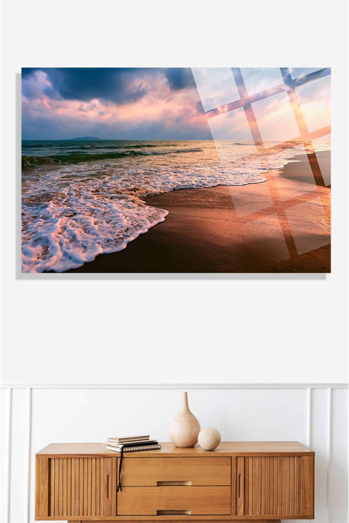 Kumsalda Gün Batımı Manzara 4mm Lüks Kırılmaz Temperli Yüksek Çözünürlüklü Cam Tablo TURUNCU 2