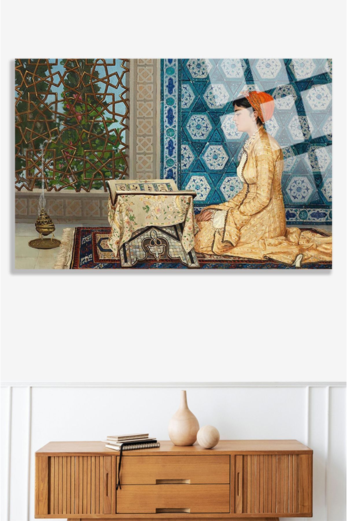 Kuran Okuyan Kız Canlı Renkli Cam Tablo, Ev Ve Ofis Hediyesi Yüksek Çözünürlüklü 4mm Lüks Tablo mavi