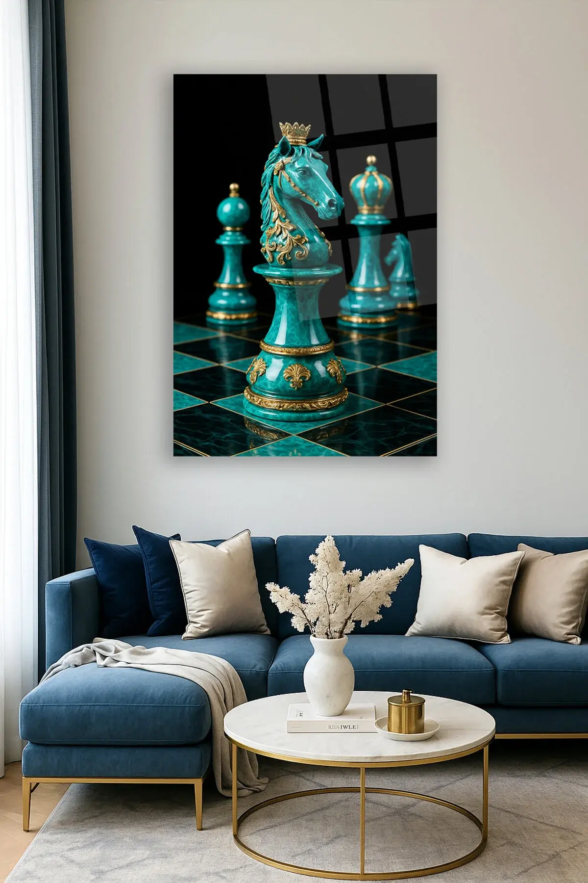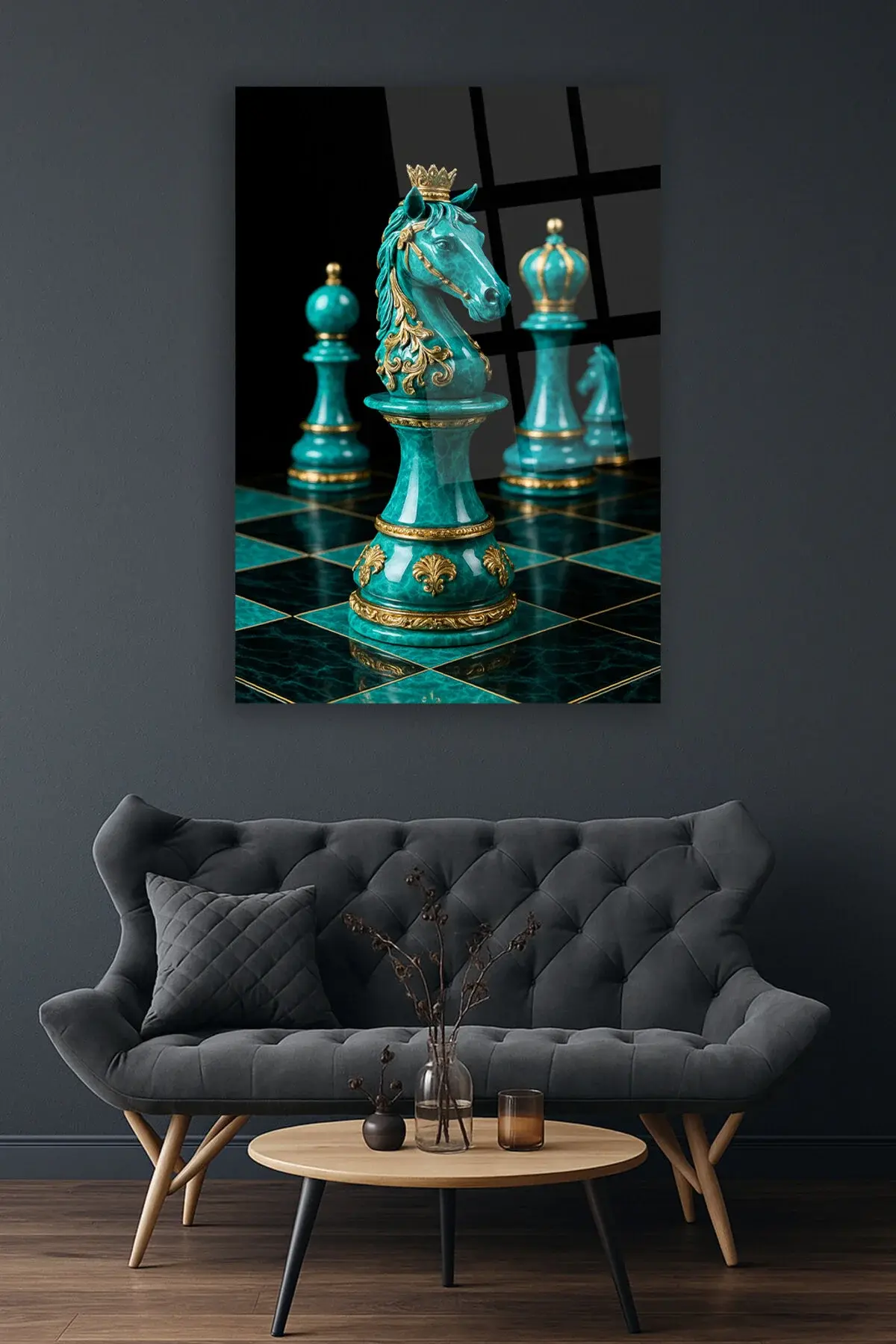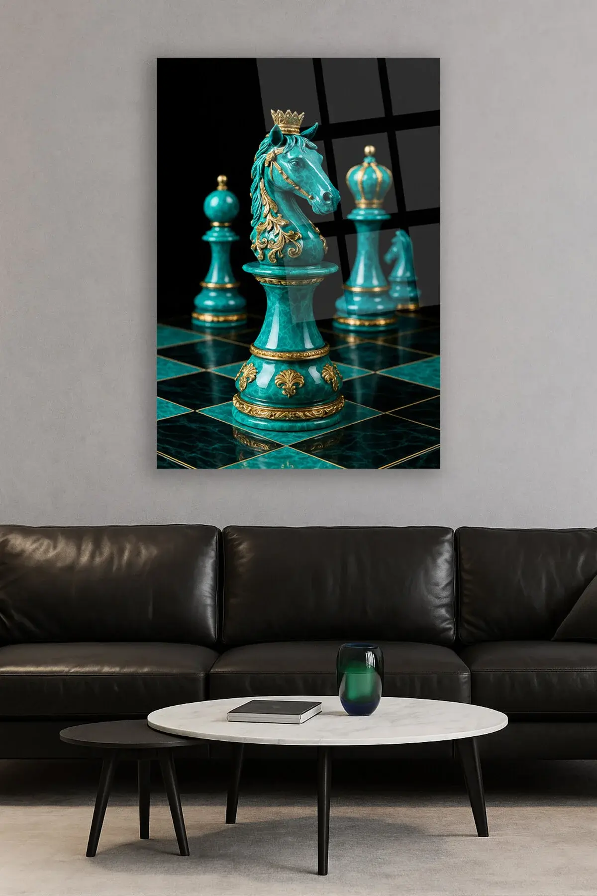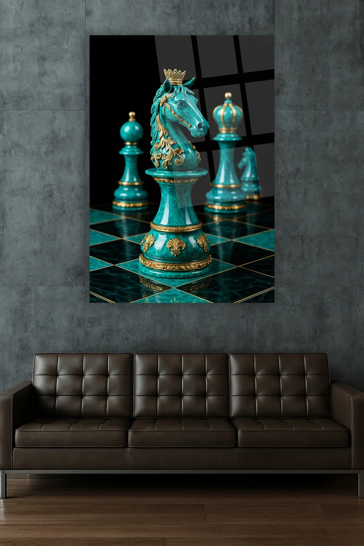 LÜKS SATRANÇ MODERN CAM TABLO ULTRA YÜKSEK KALİTELİ AT SATRANÇ TAŞI TABLOSU OFİS EV HEDİYESİ Turkuaz
