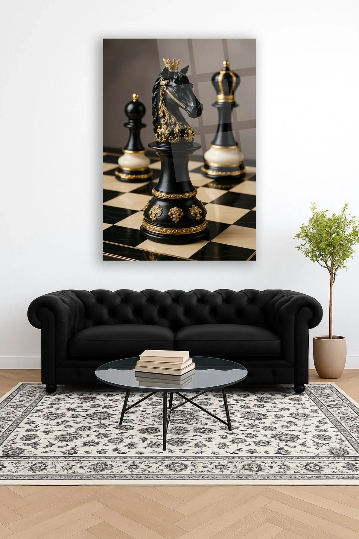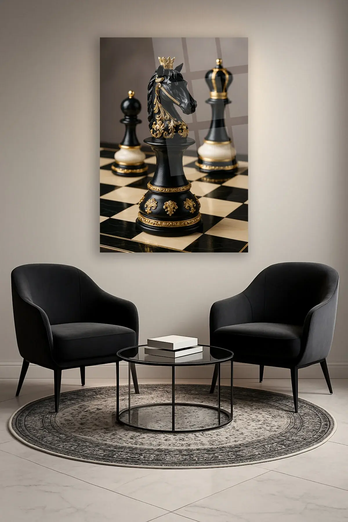 LÜKS SATRANÇ MODERN CAM TABLO ULTRA YÜKSEK KALİTELİ AT SATRANÇ TAŞI TABLOSU OFİS EV HEDİYESİ