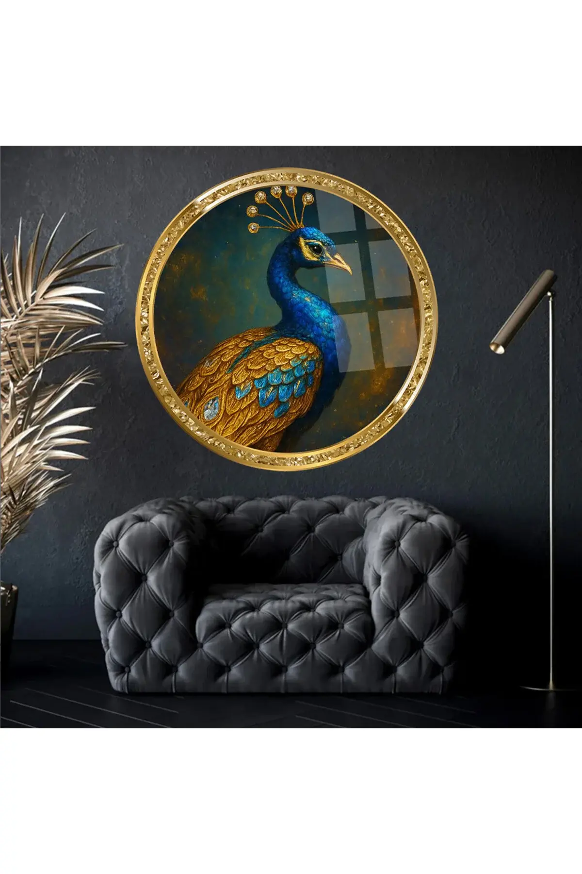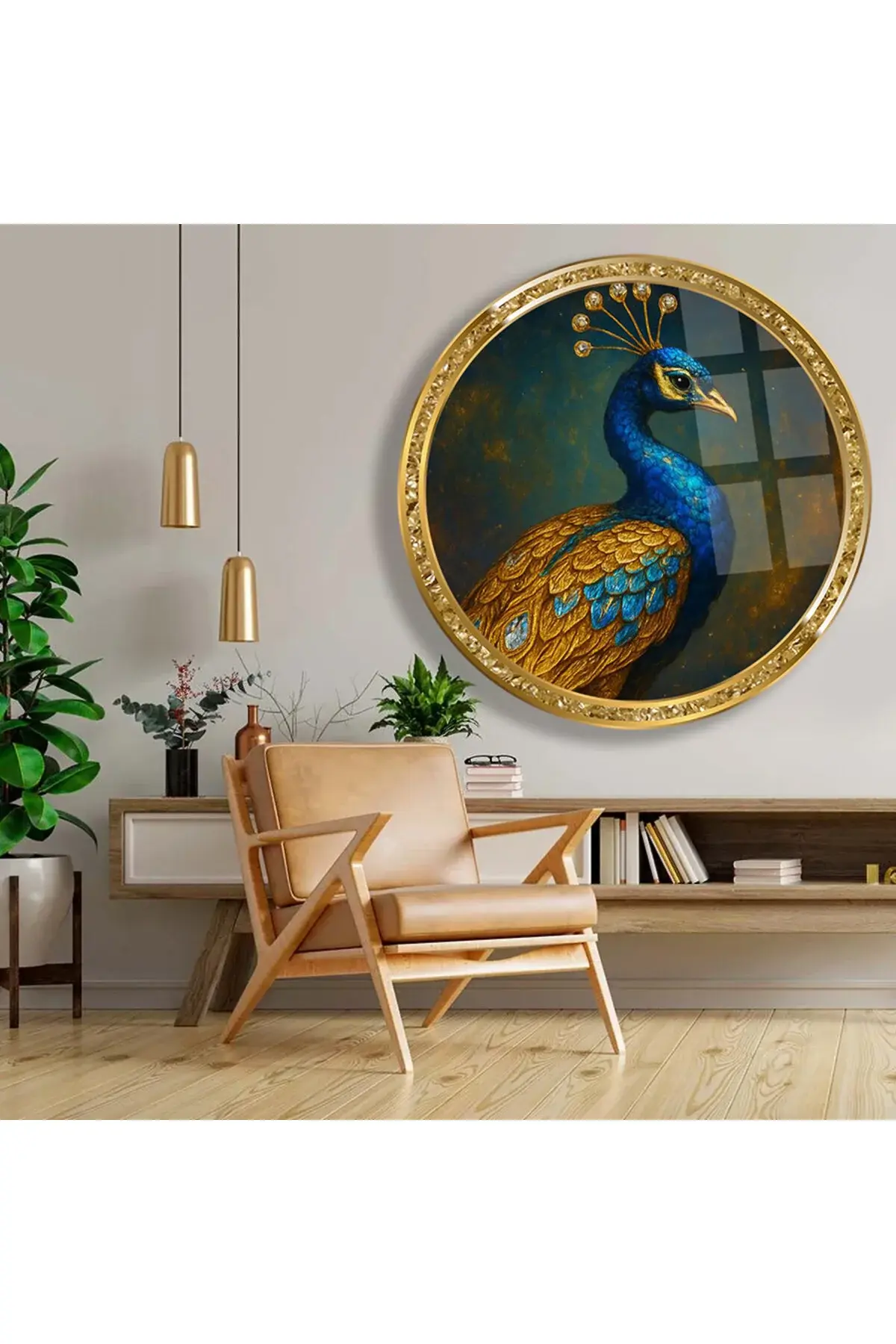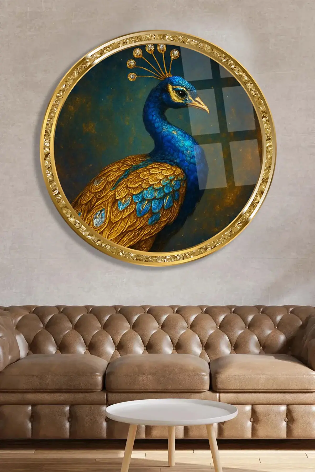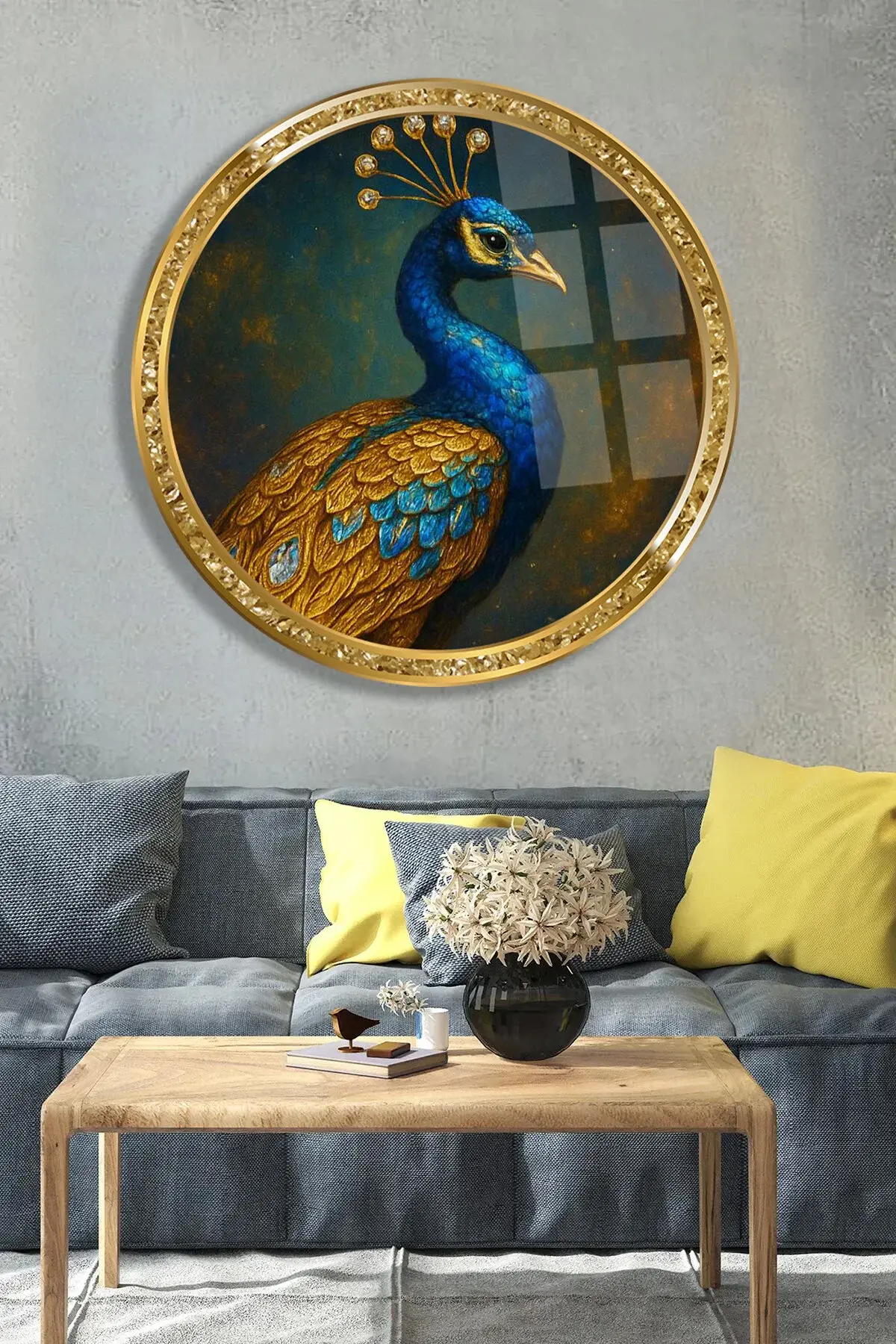 LÜKS TAVUS KUŞU CAM TABLOSU YUVARLAK ŞIK VE LÜKS KIRILMAZ MODERN CAM TABLO EV HEDİYESİ TABLO Mavi