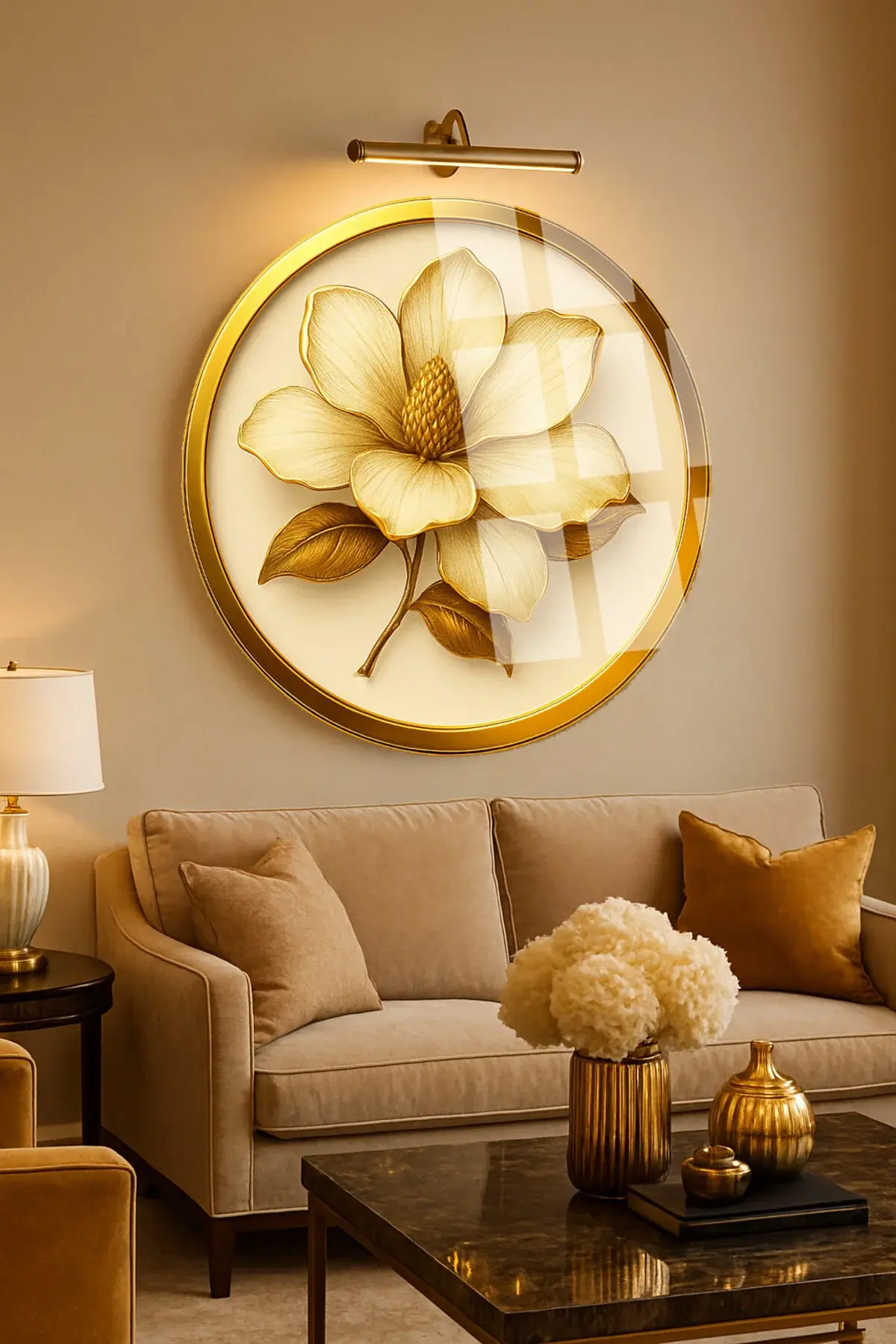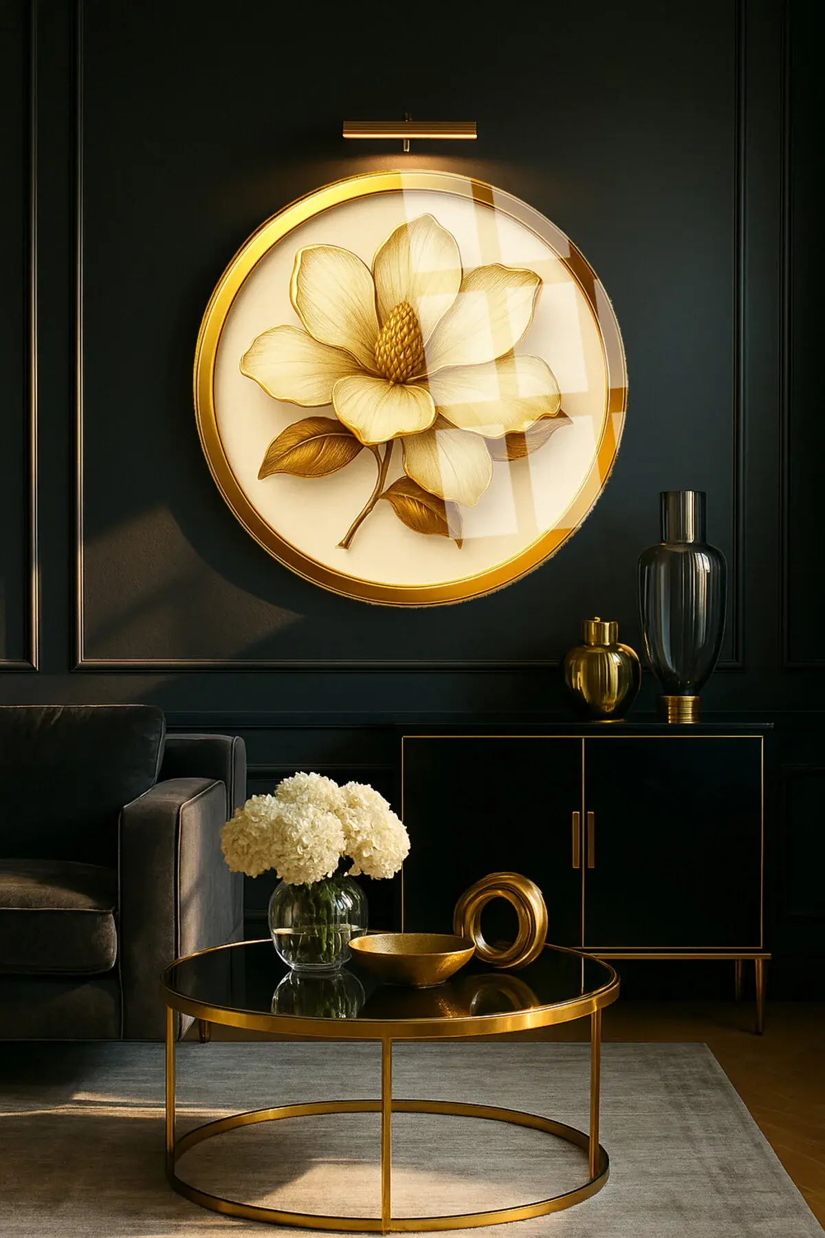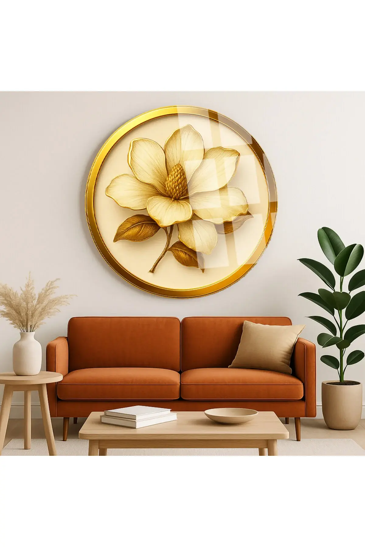 MANOLYA ÇİÇEĞİ ALTIN DETAYLI TASARIM KIRILMAZ YUVARLAK CAM TABLO LÜKS EV HEDİYESİ ULTRA CANLI RENKLİ Krem