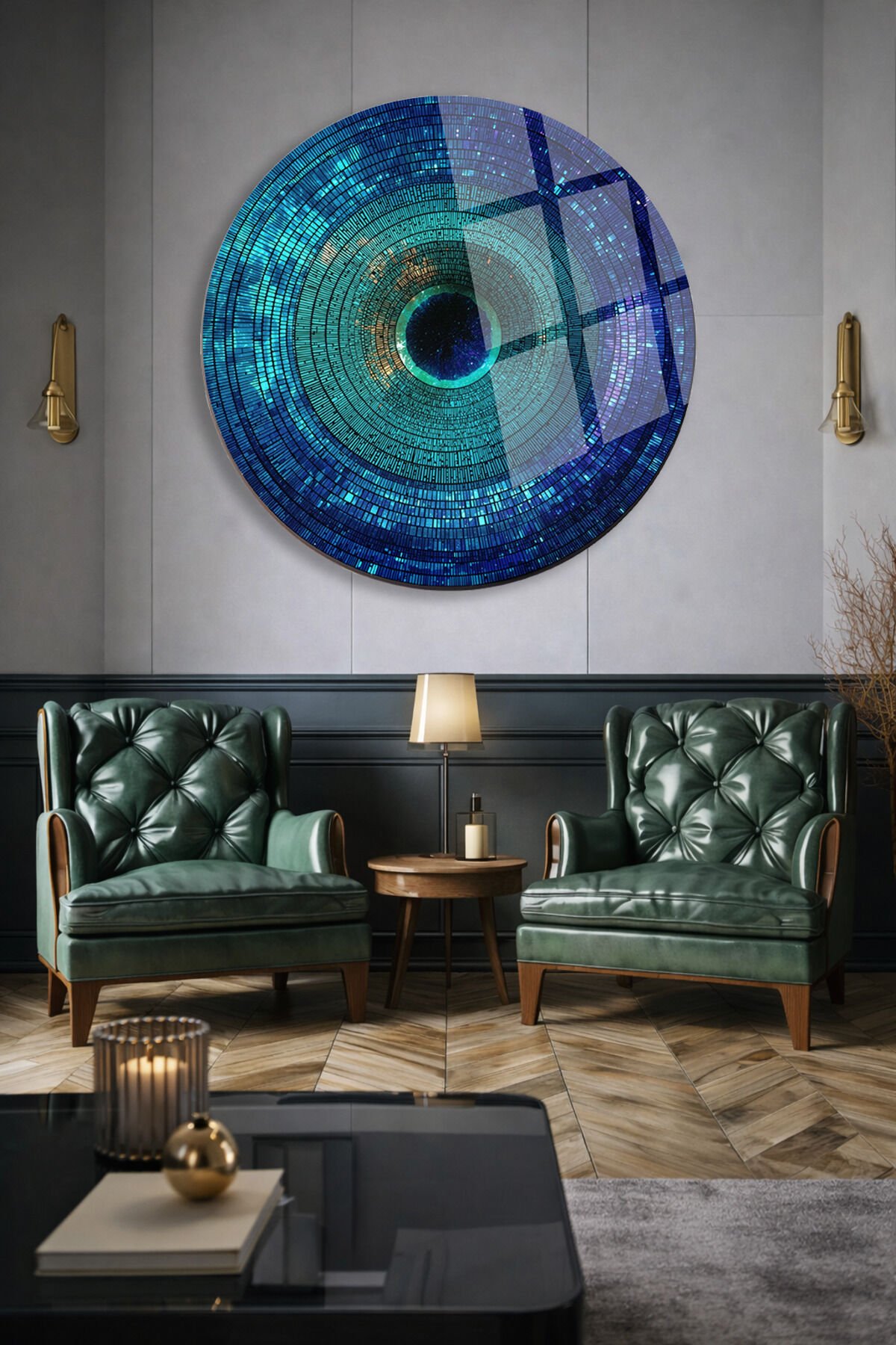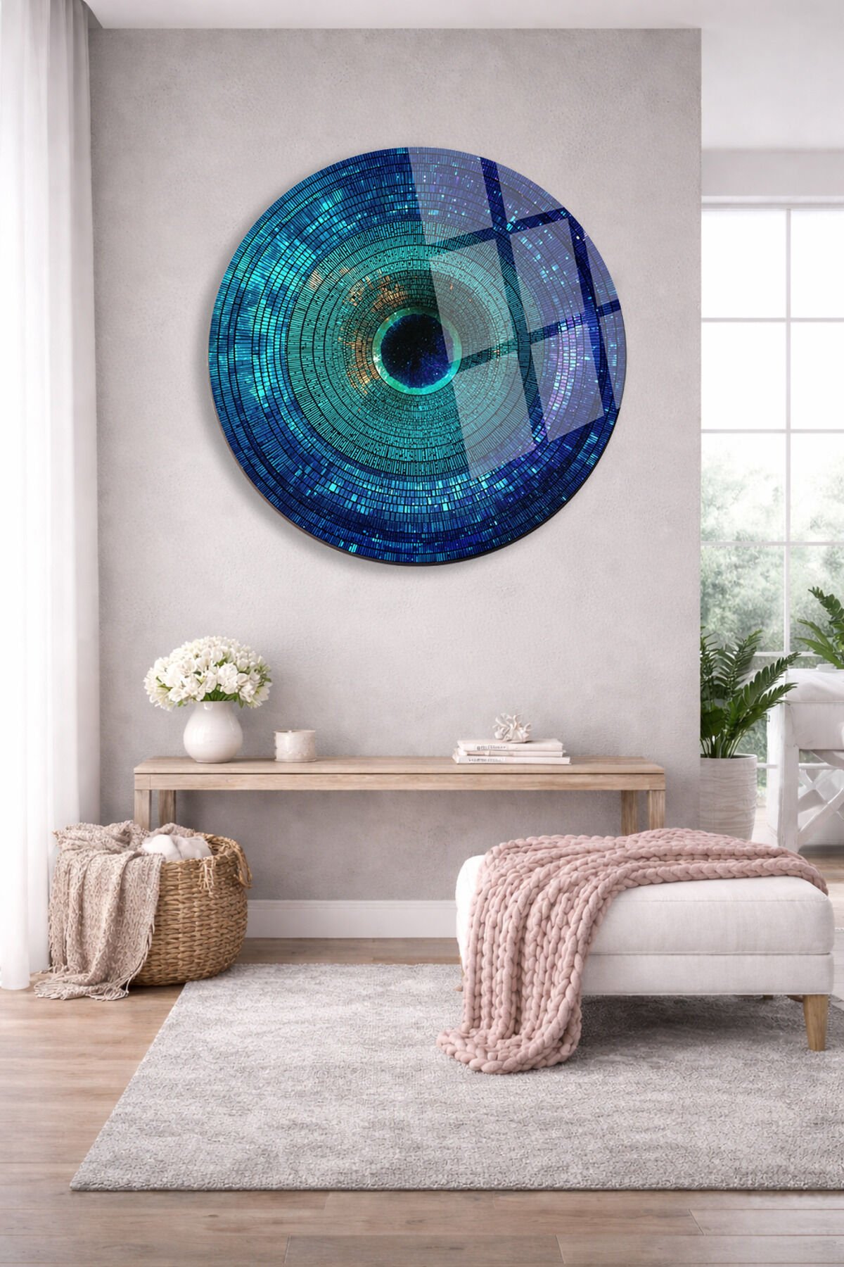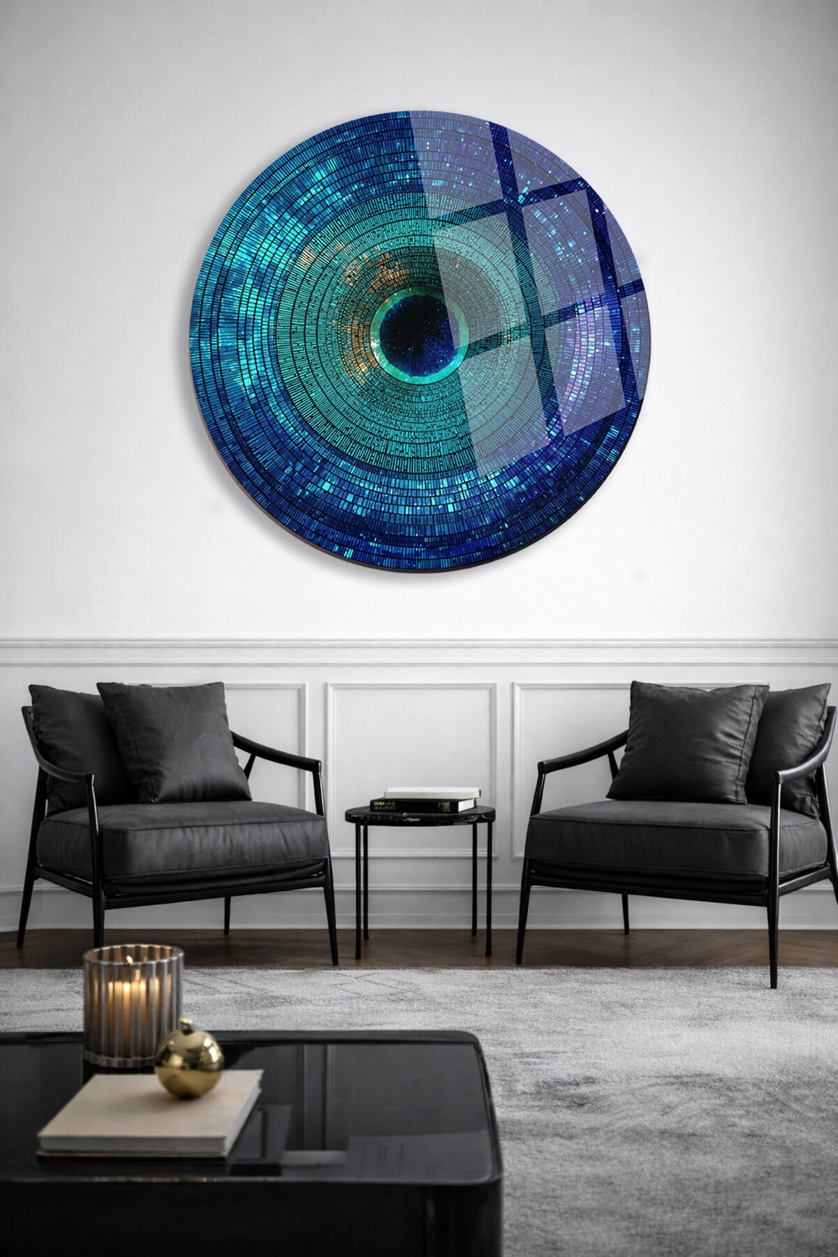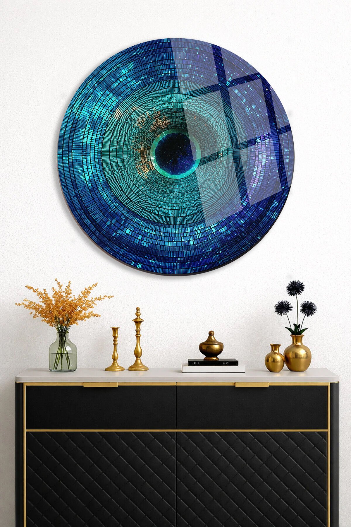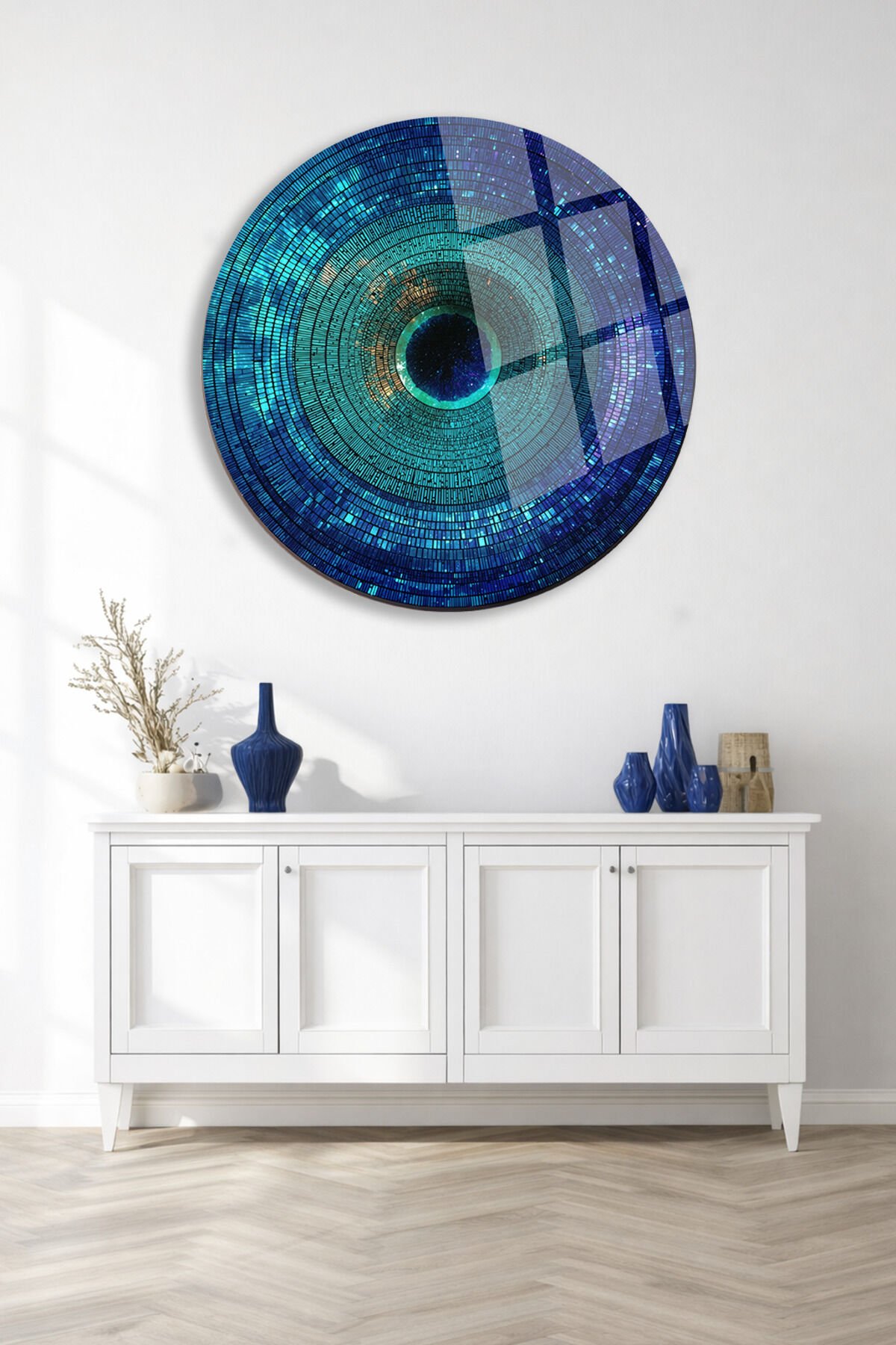 MAVİ GEOMETRİK DAİRE DESENLİ YUVARLAK GERÇEK KIRILMAZ CAM TABLO ULTRA CANLI RENKLER EV OFİS HEDİYESİ Turkuaz