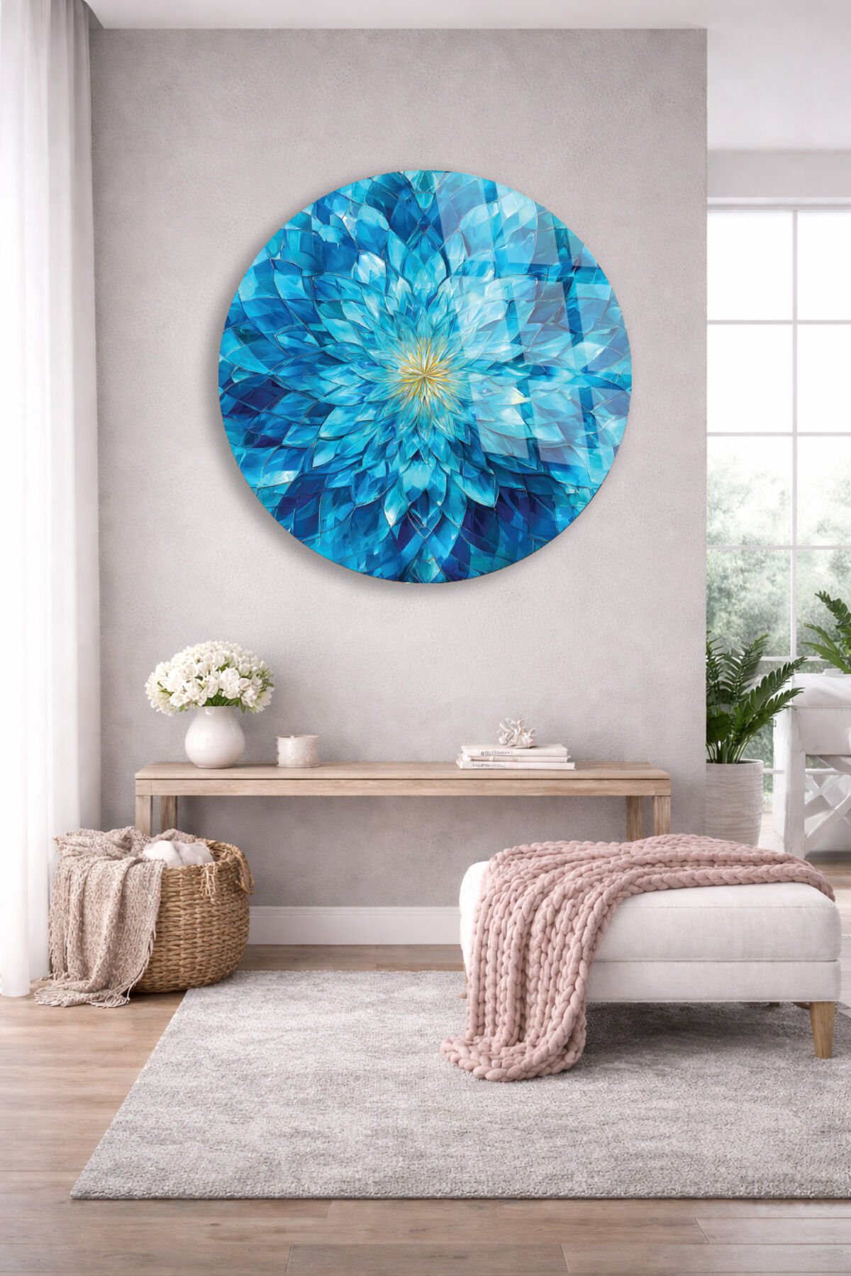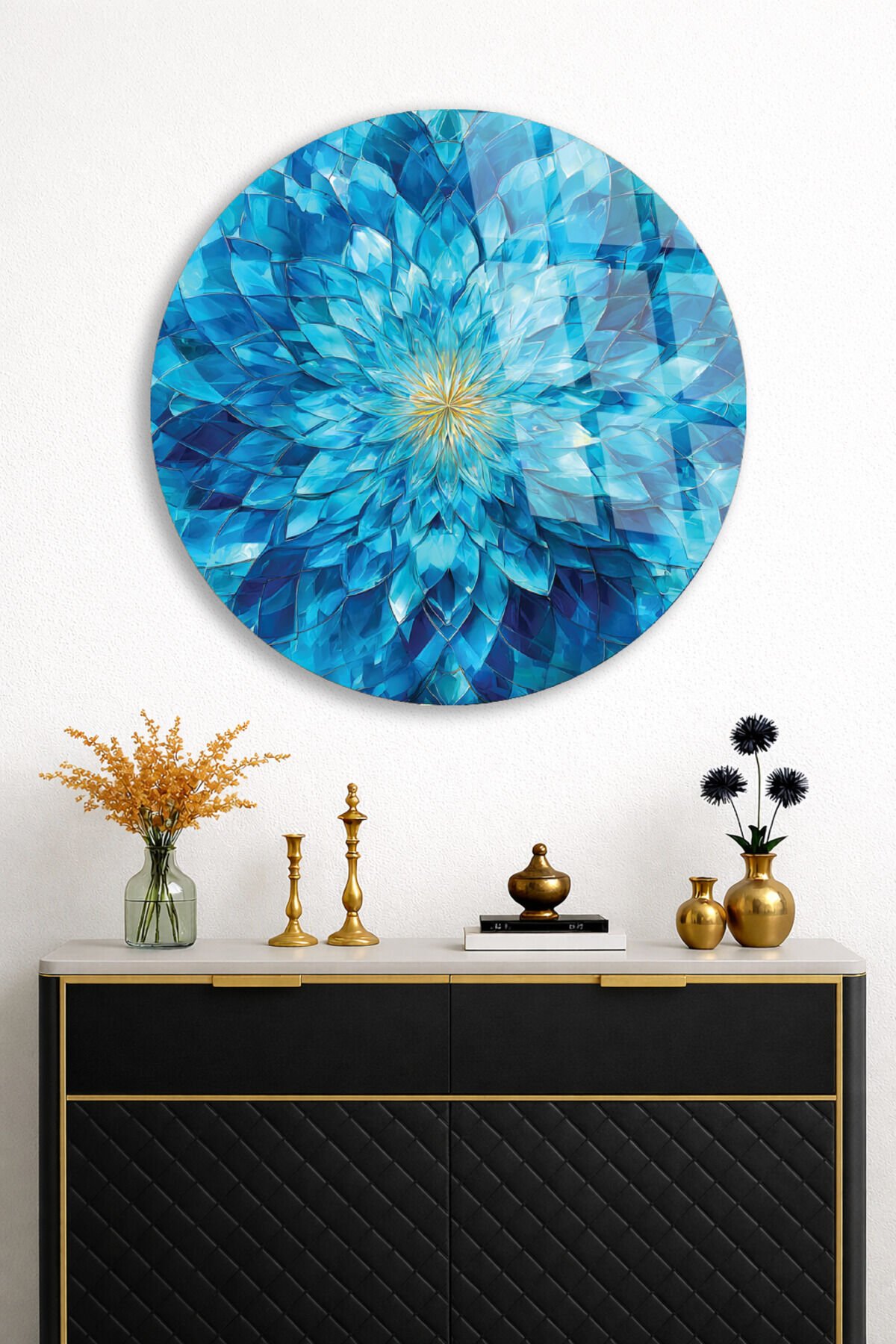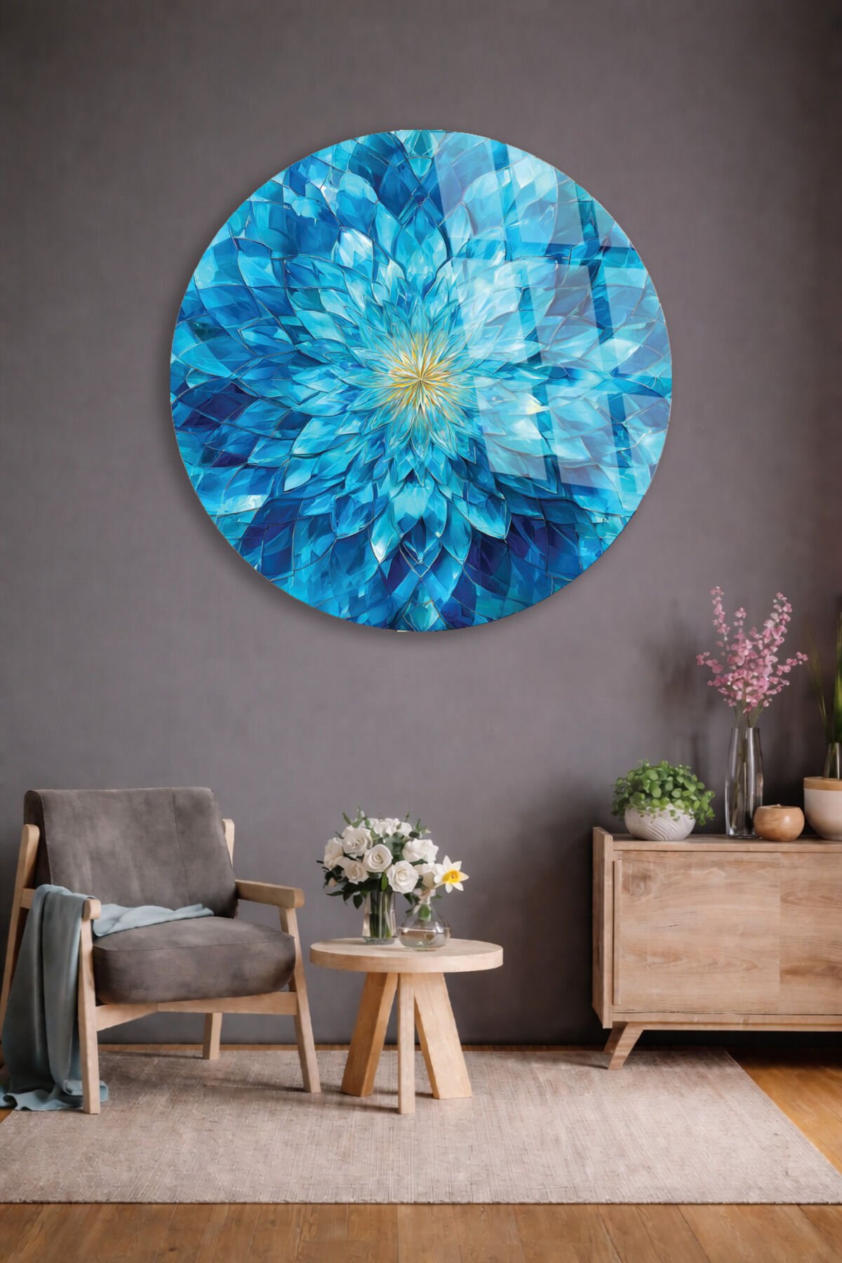 Mavi Kristal Çiçek Cam Tablo – Ferah ve Modern Duvar Dekoru Mavi