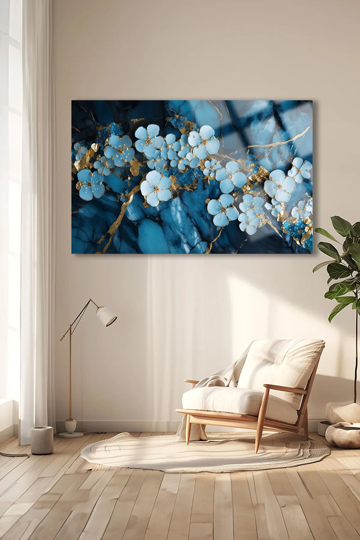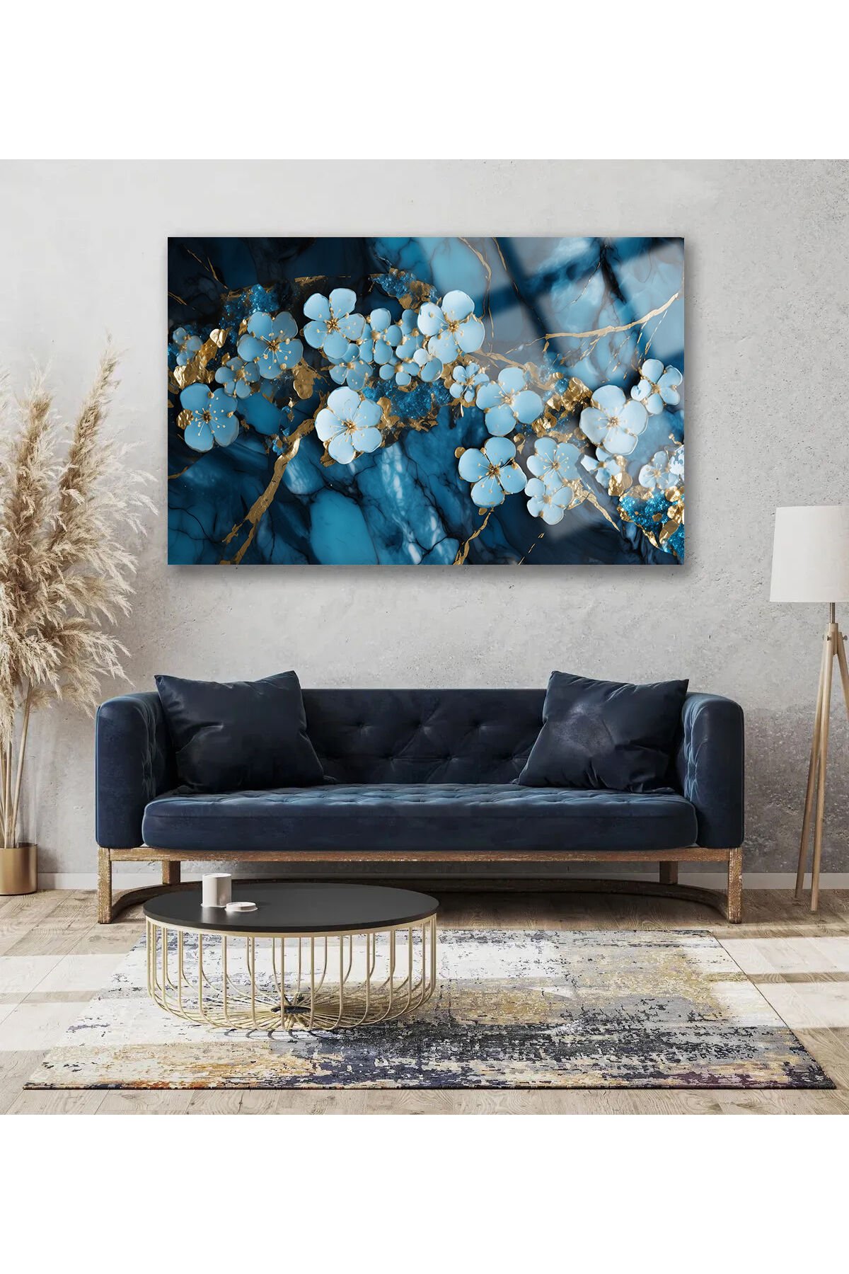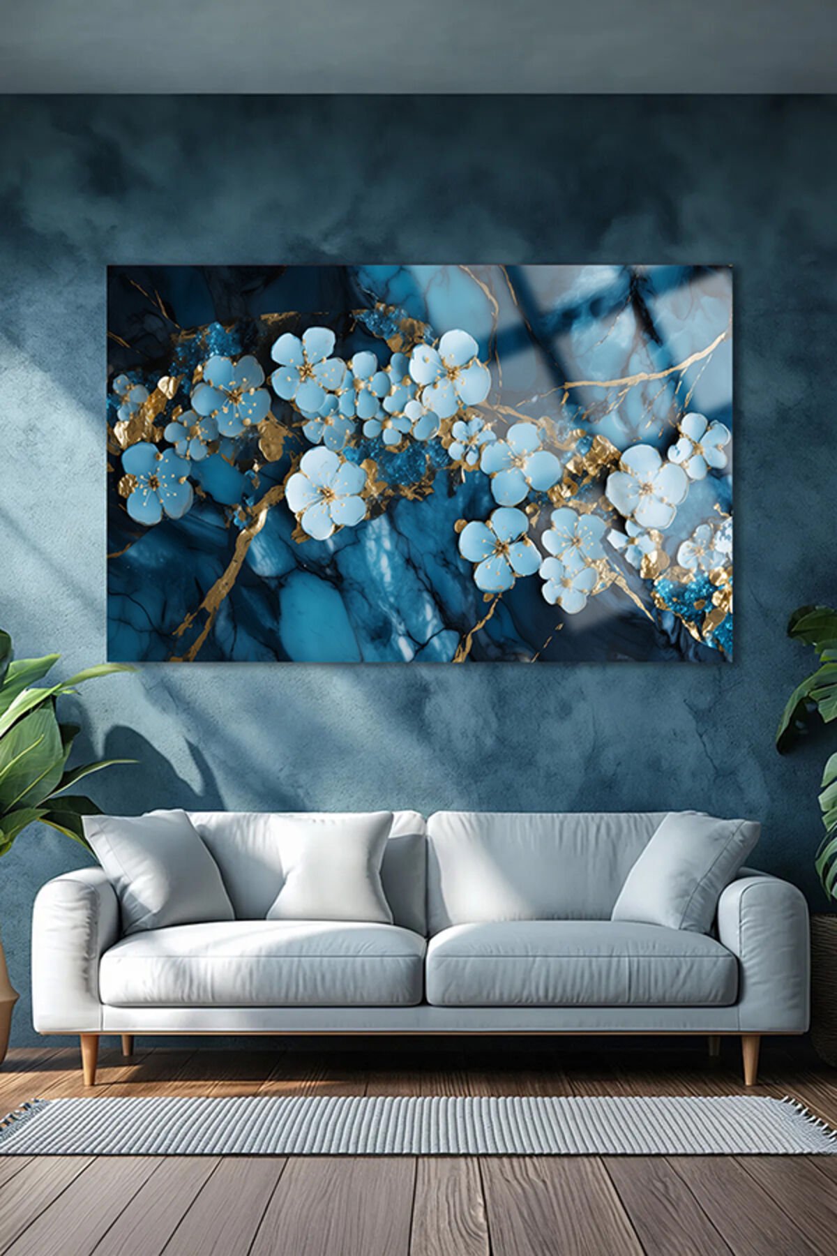 MAVİ MERMER ÜZERİNDE GOLD DETAY ÇİÇEKLER YATAY CAM TABLO KIRILMAZ LÜKS CAM TABLO EV HEDİYESİ
