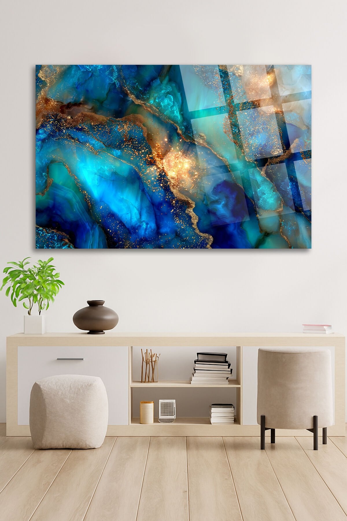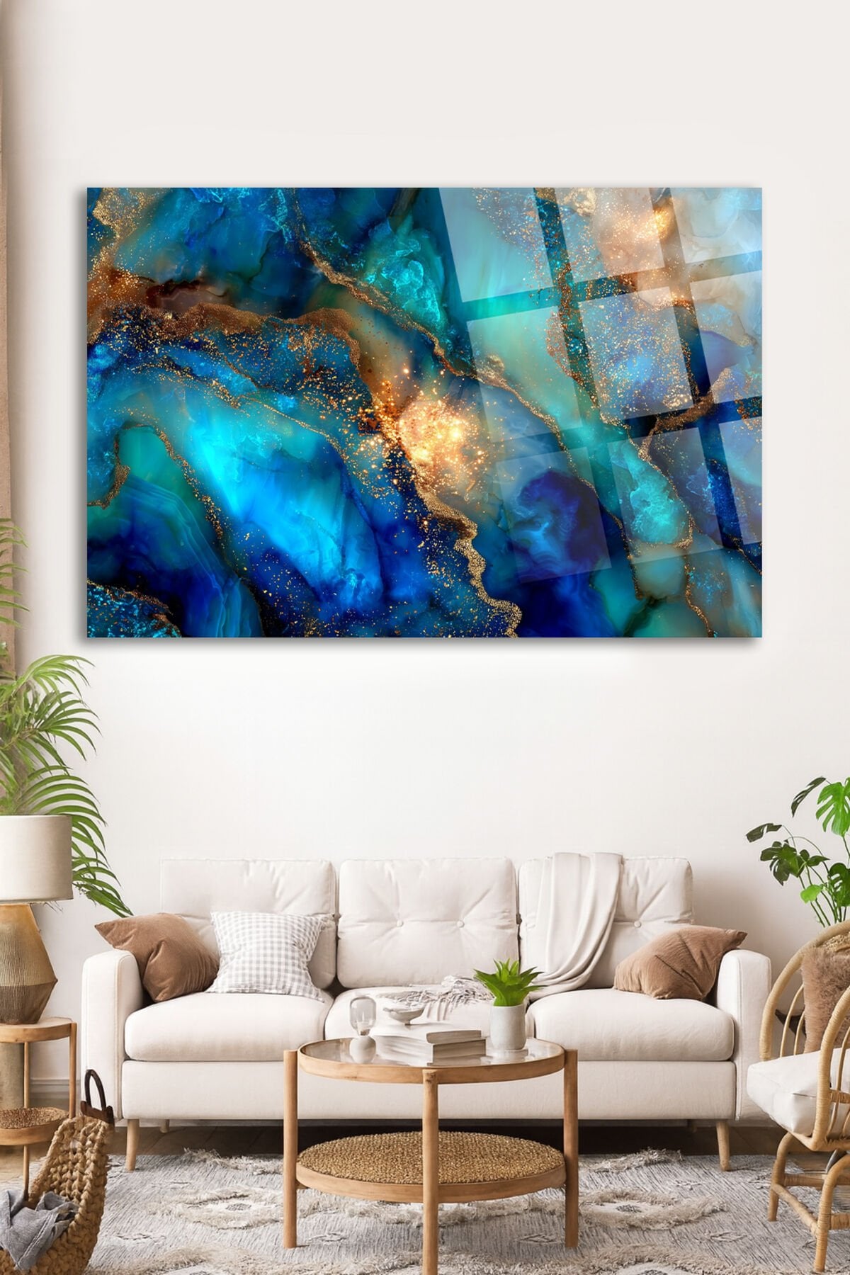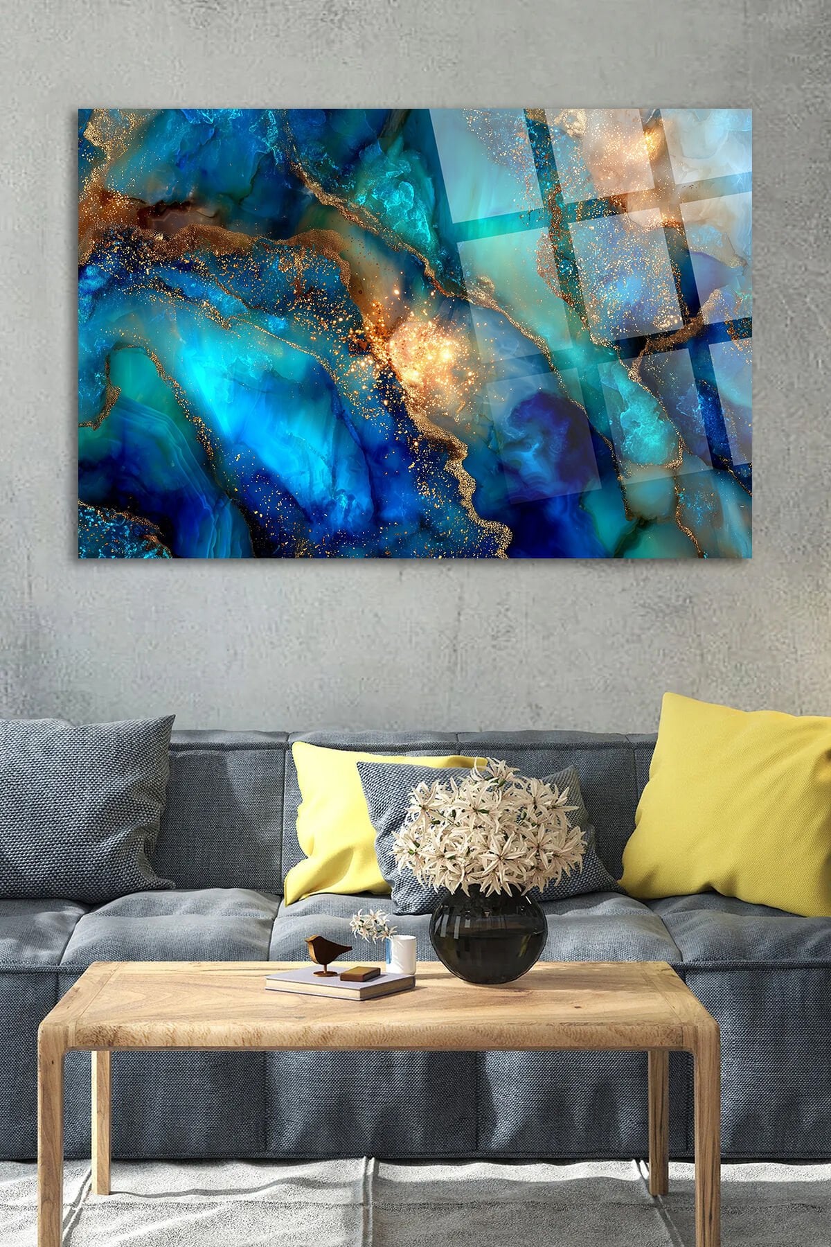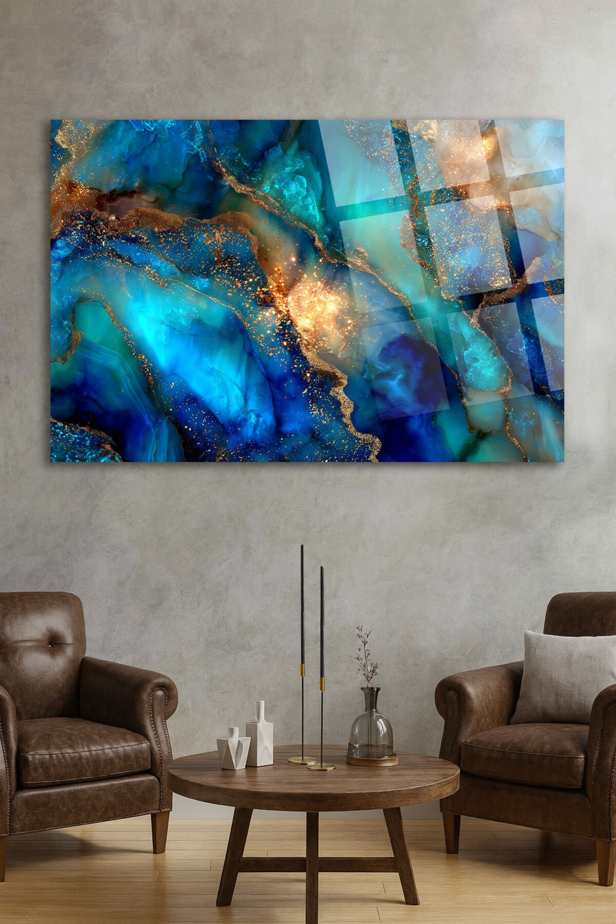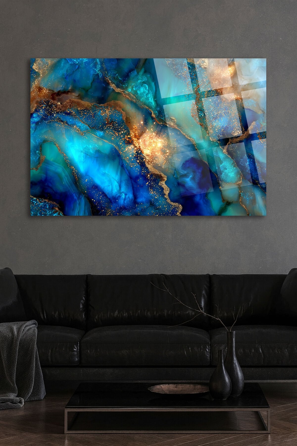 MAVİ TURKUAZ AKİK DESEN ALTIN PARILTILI MODERN SANATSAL EV HEDİYESİ TABLO KIRILMAZ LÜKS CAM TABLO Turkuaz