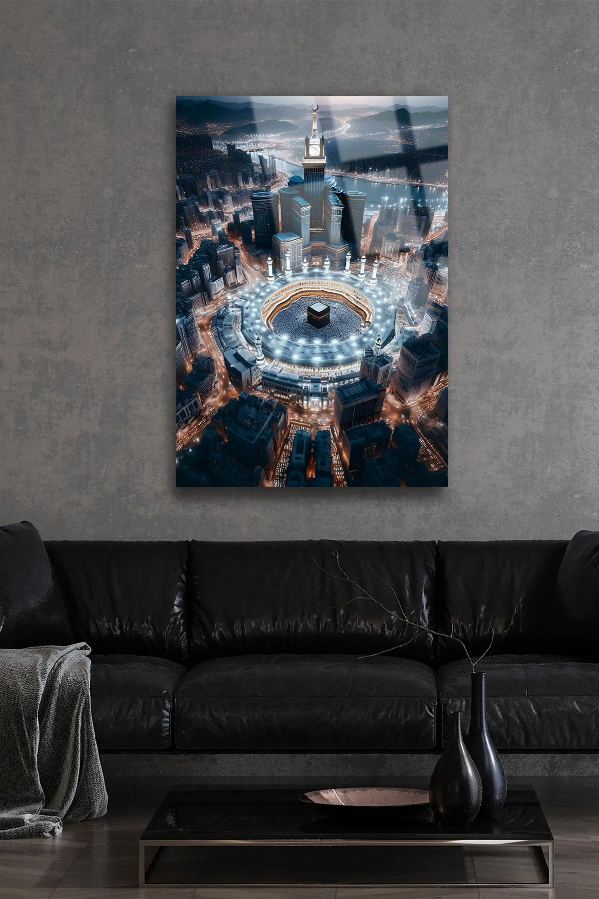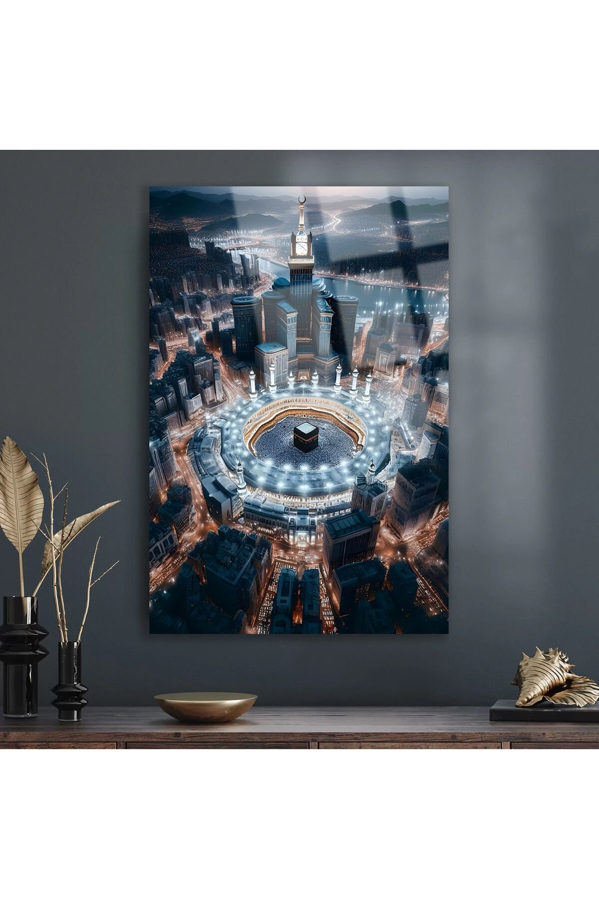 MEKKE GÖRSELİ YAPAY ZEKA İLE DİNİ İSLAMİ LÜKS KIRILMAZ CAM TABLO EV OFİS İŞ YERİ HEDİRYESİ Siyah