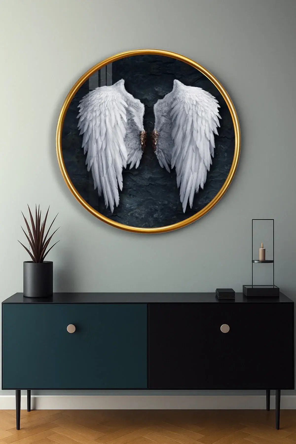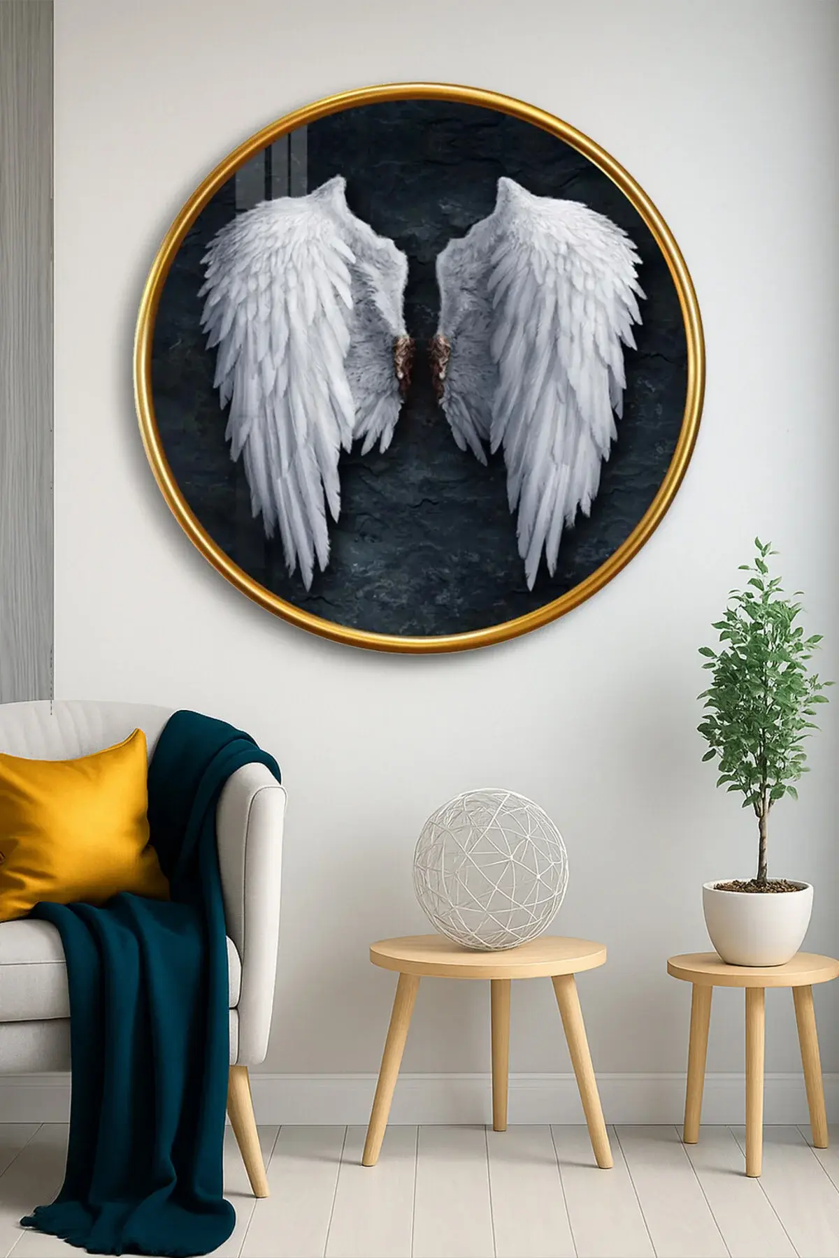 MELEK KANATI SİYAHIN UYUMU TASARIMI YUVARLAK KIRILMAZ MODERN CAM TABLO EV HEDİYESİ LÜKS ODA TABLOSU Beyaz