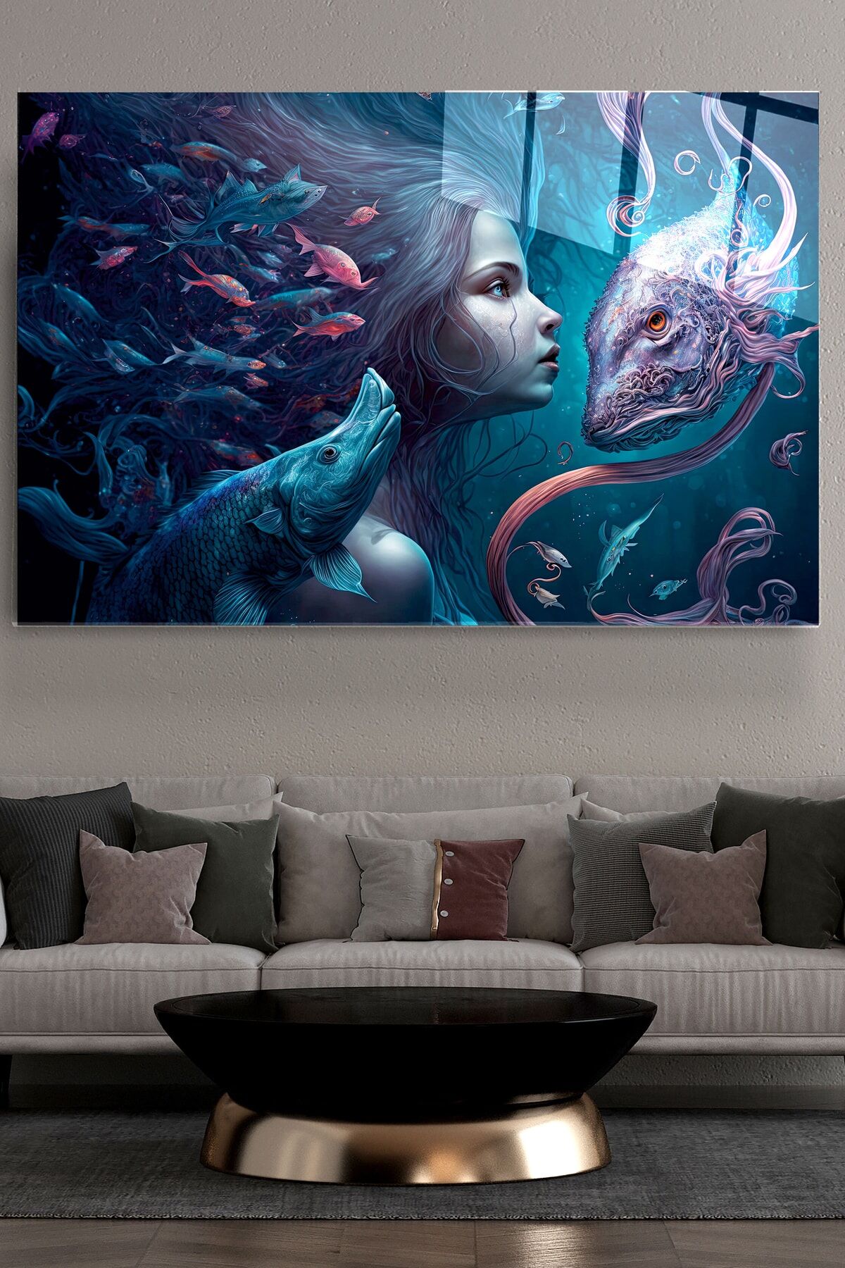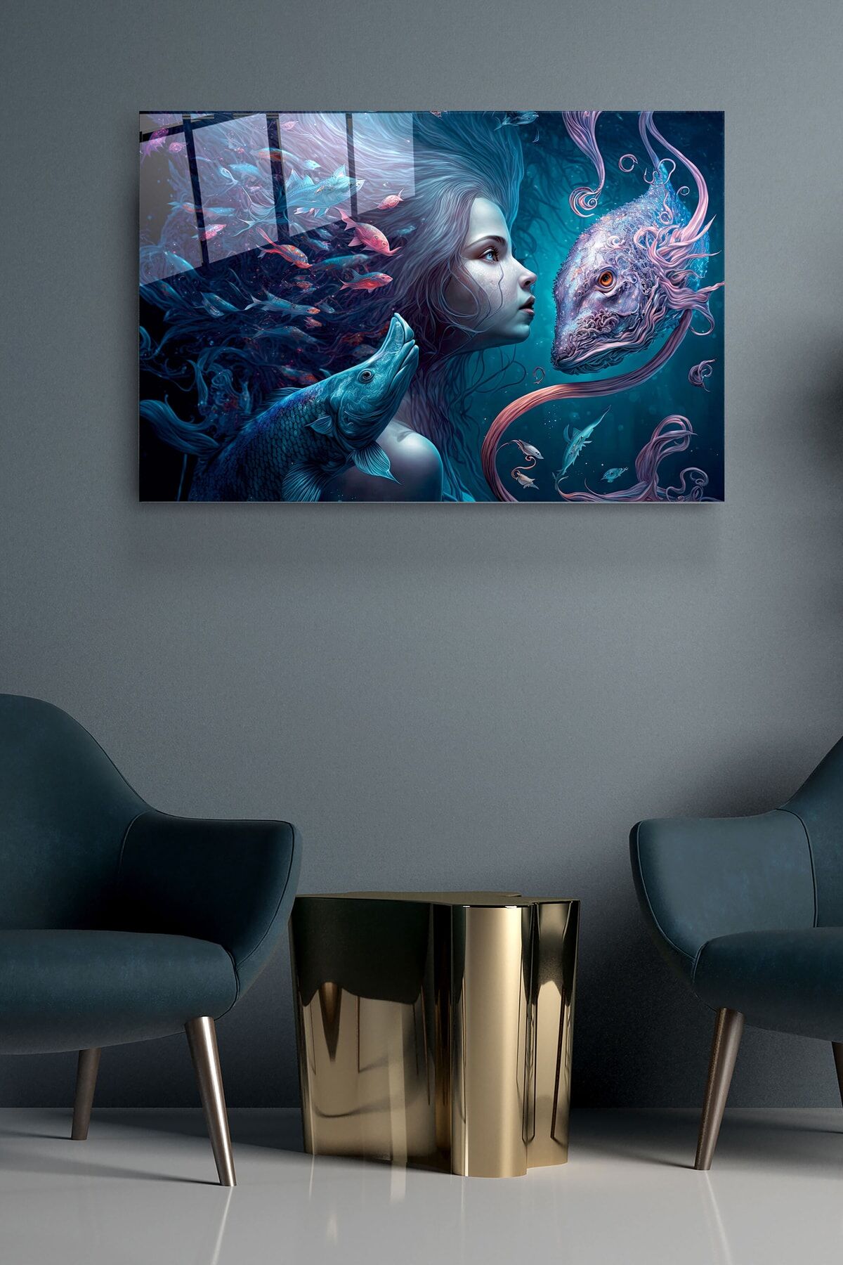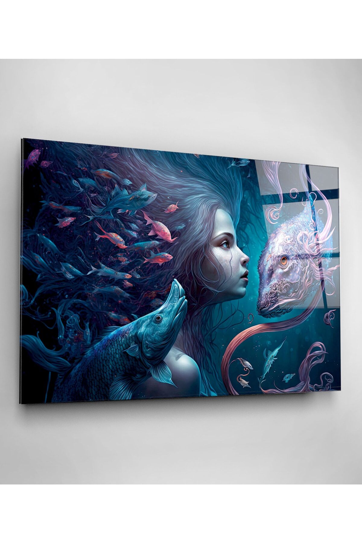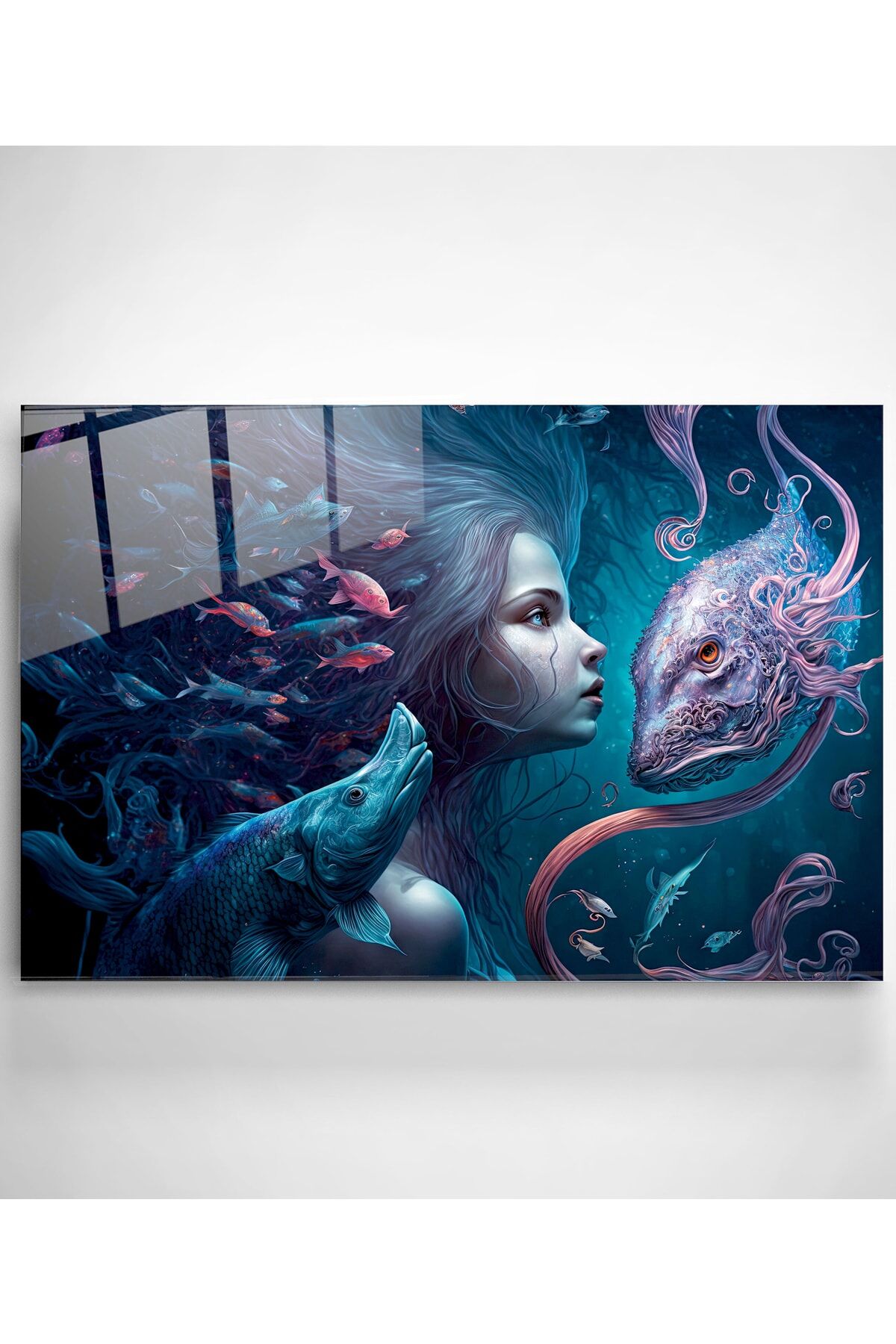 Mermaid And Fishes Cam Tablo, Dekoratif Cam Tablo