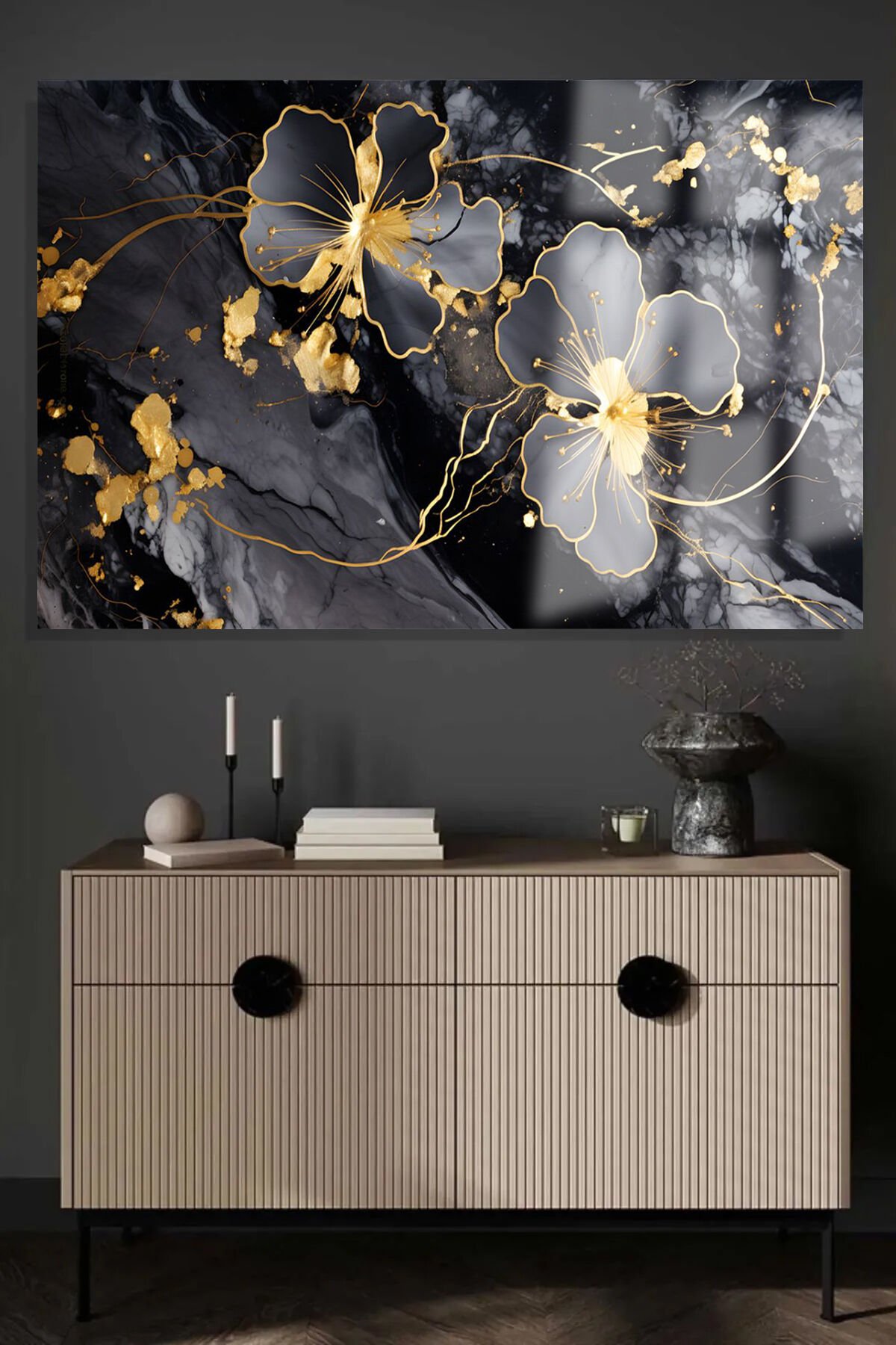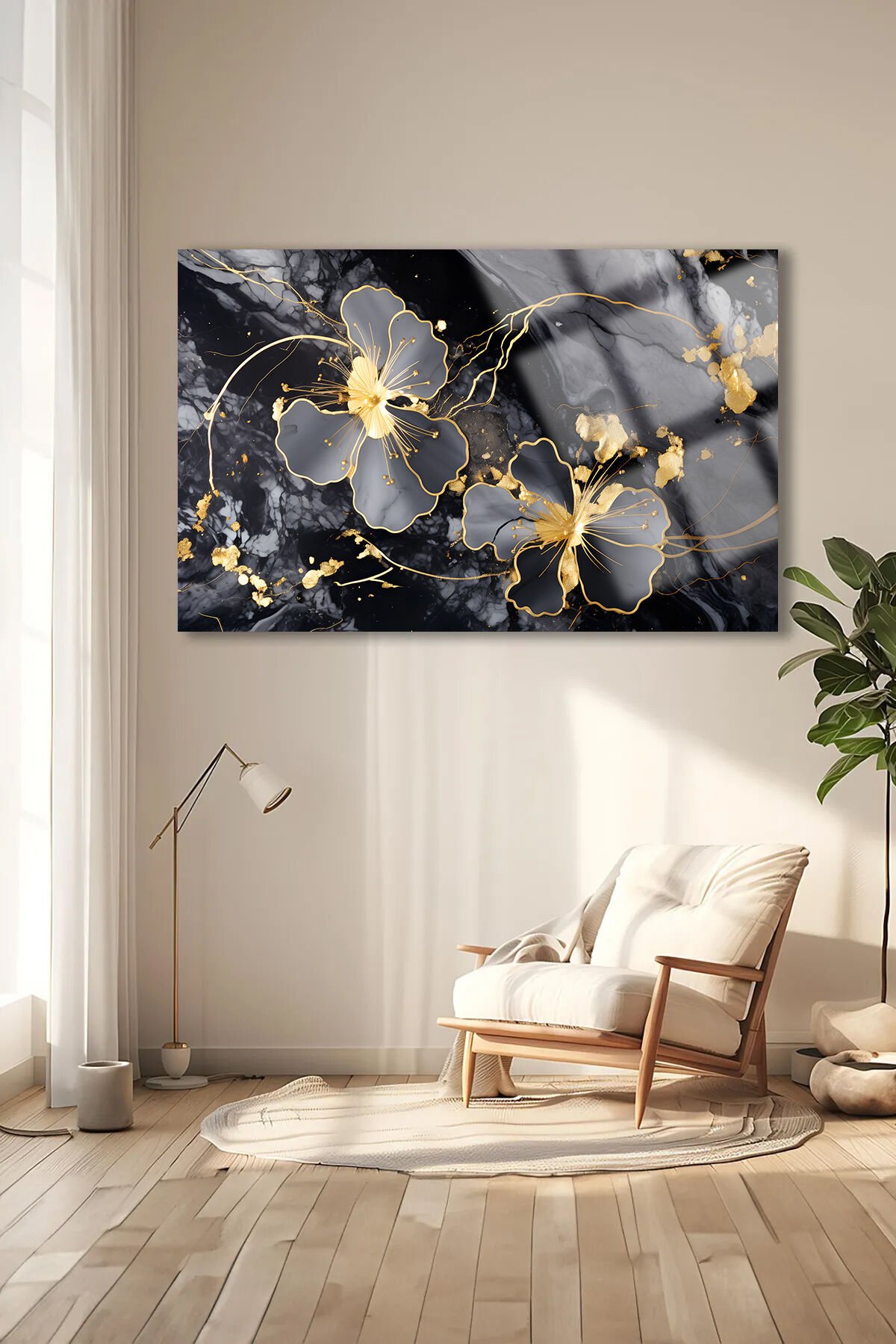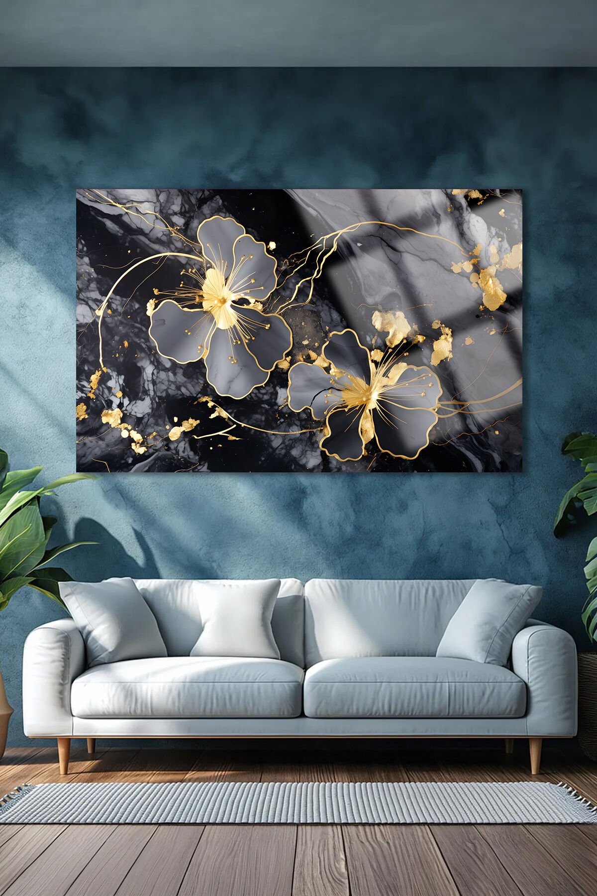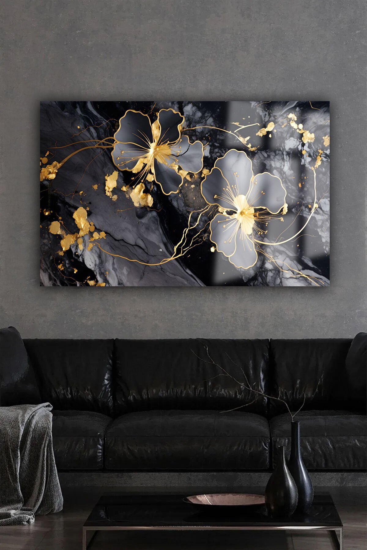 MERMER DETAY GOLD YATAY ÇİÇEK KIRILMAZ LÜKS CAM TABLO OF İŞ YERİ EV HEDİYESİ CAM TABLO