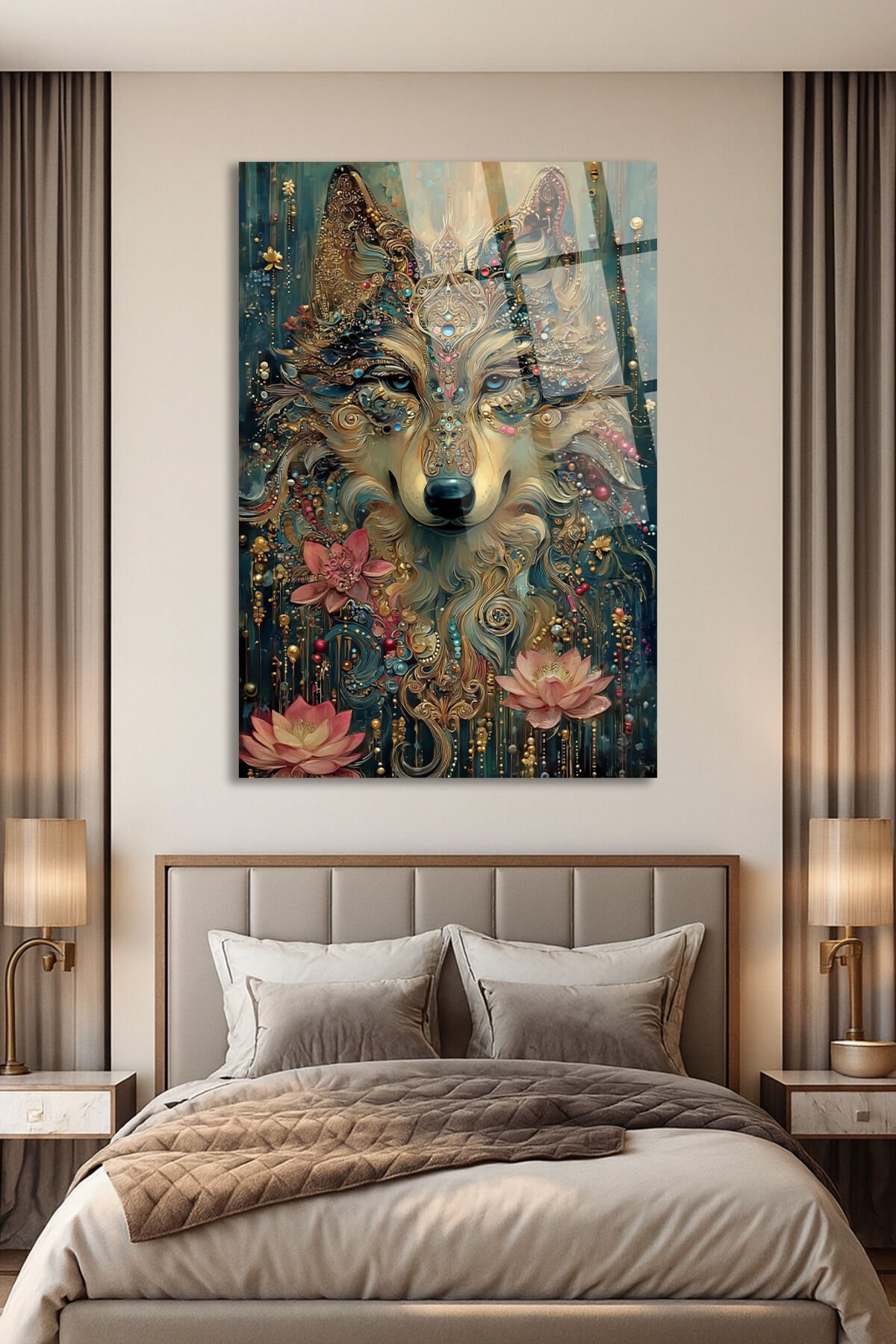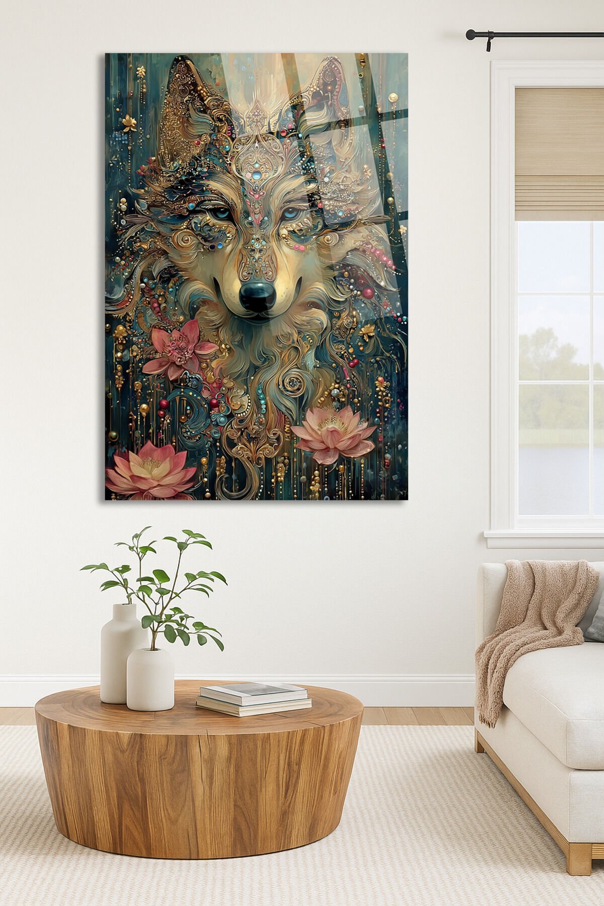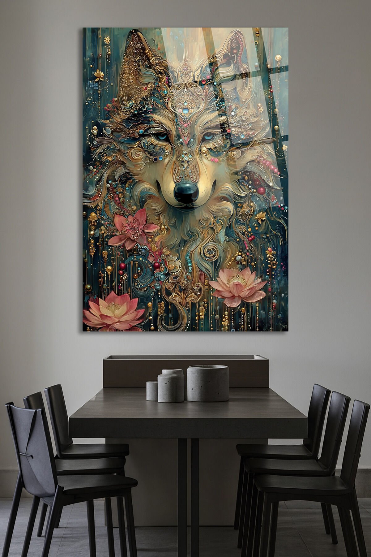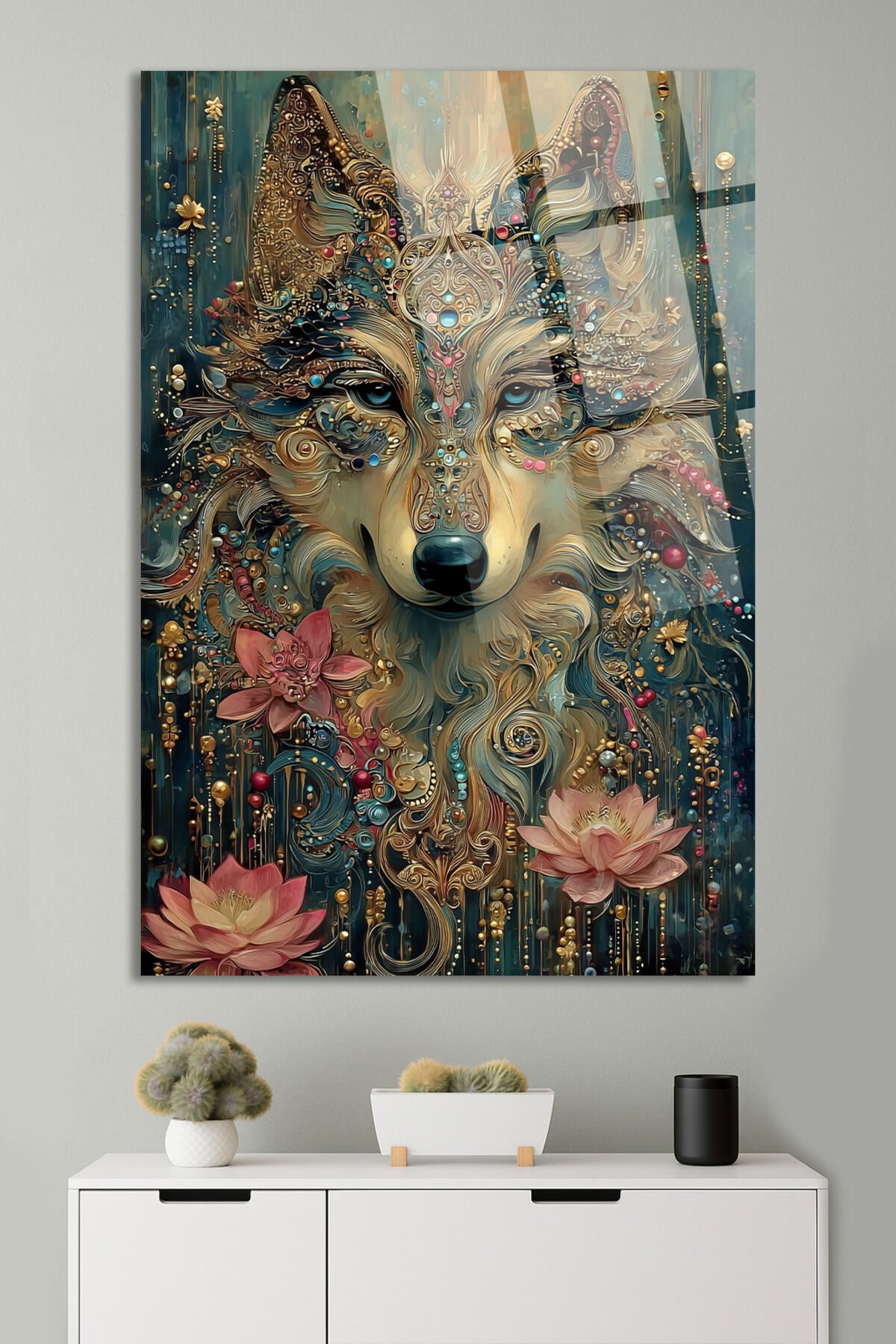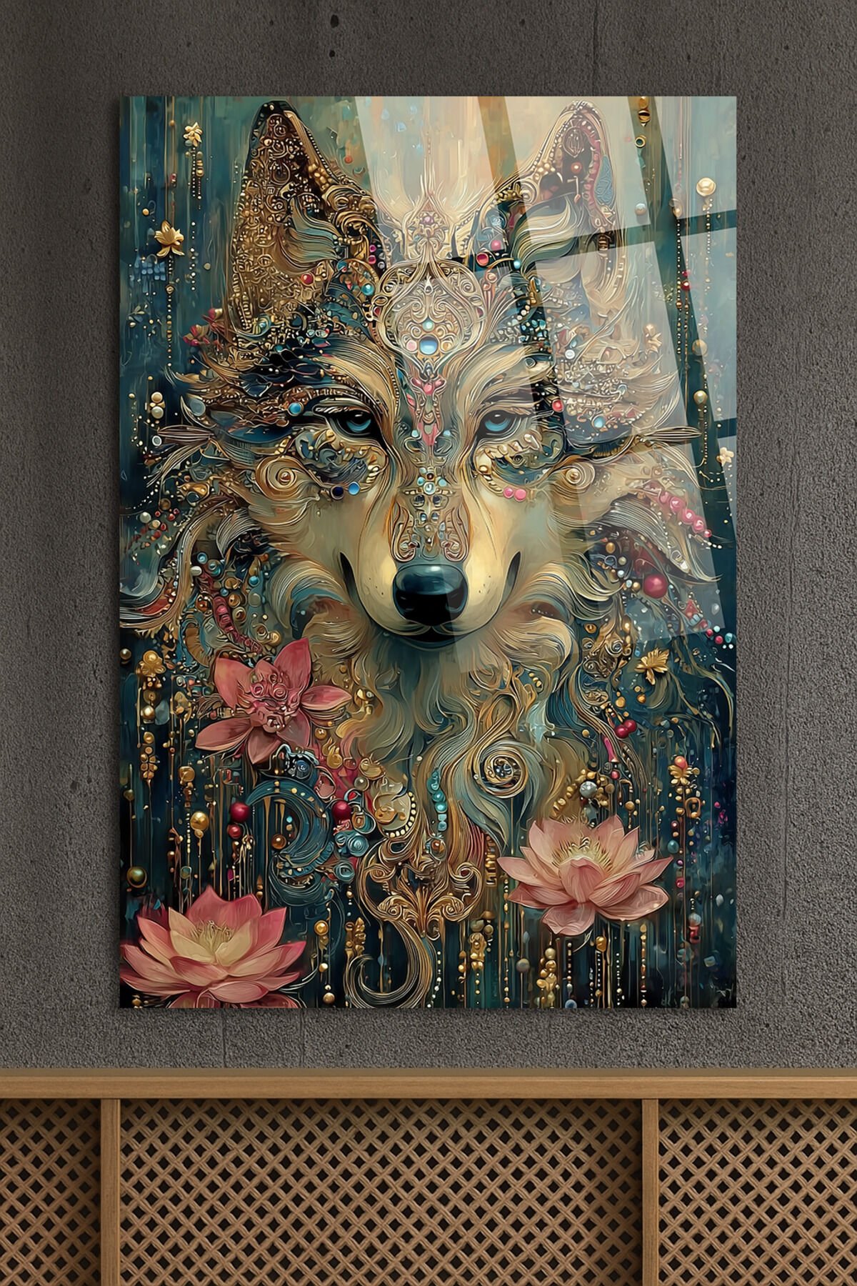 MİSTİK KURT VE LOTUS ÇİÇEĞİ ALTIN DETAYLI SANATSAL EV HEDİYESİ TABLO Turkuaz