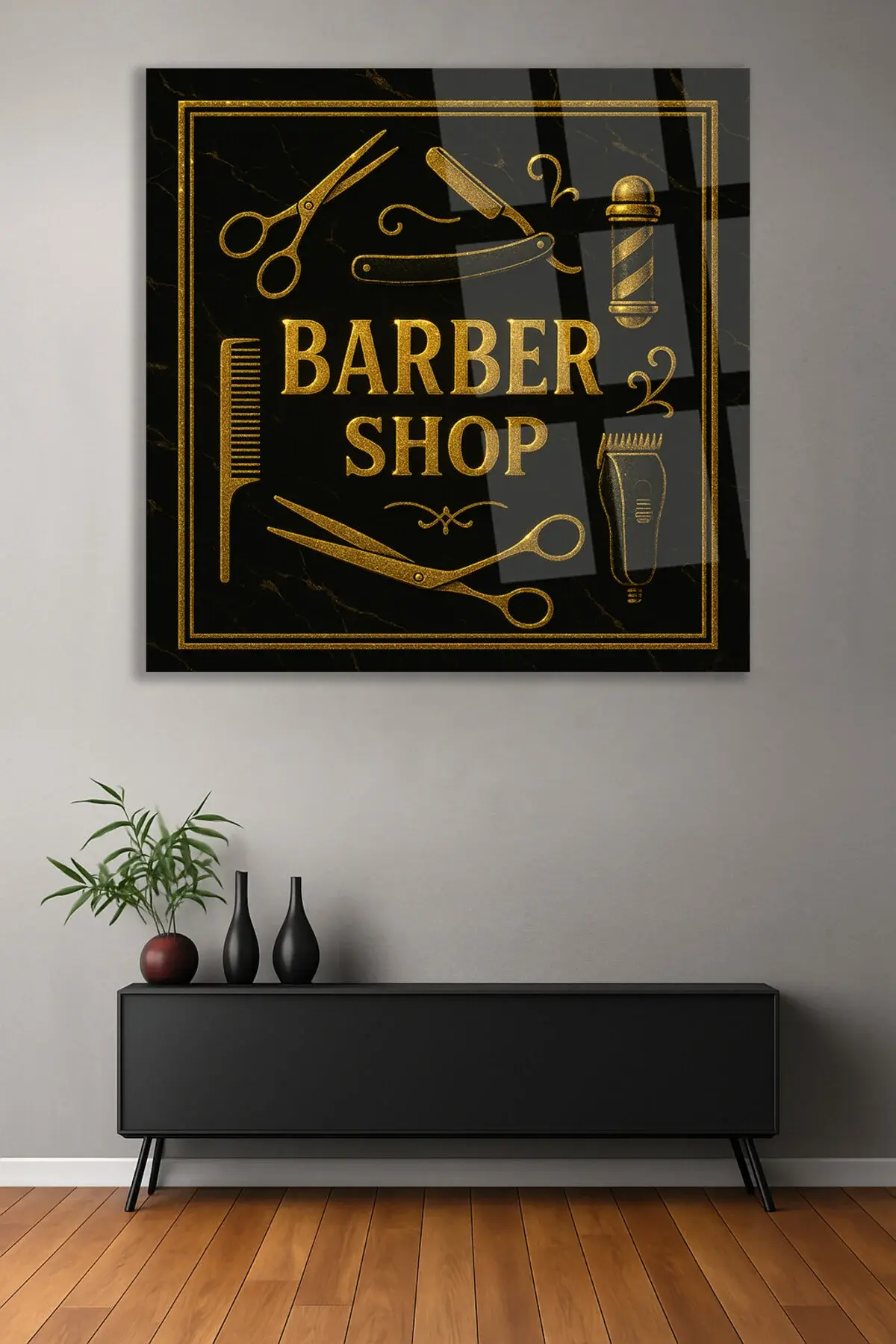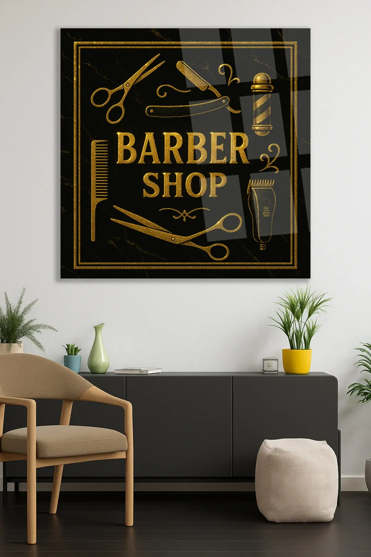 MODERN BERBER TABLOSU ERKEK KUAFÖRÜ KIRILMAZ CAM TABLO LÜKS HEDİYE ULTA CANLI RENKLER Siyah