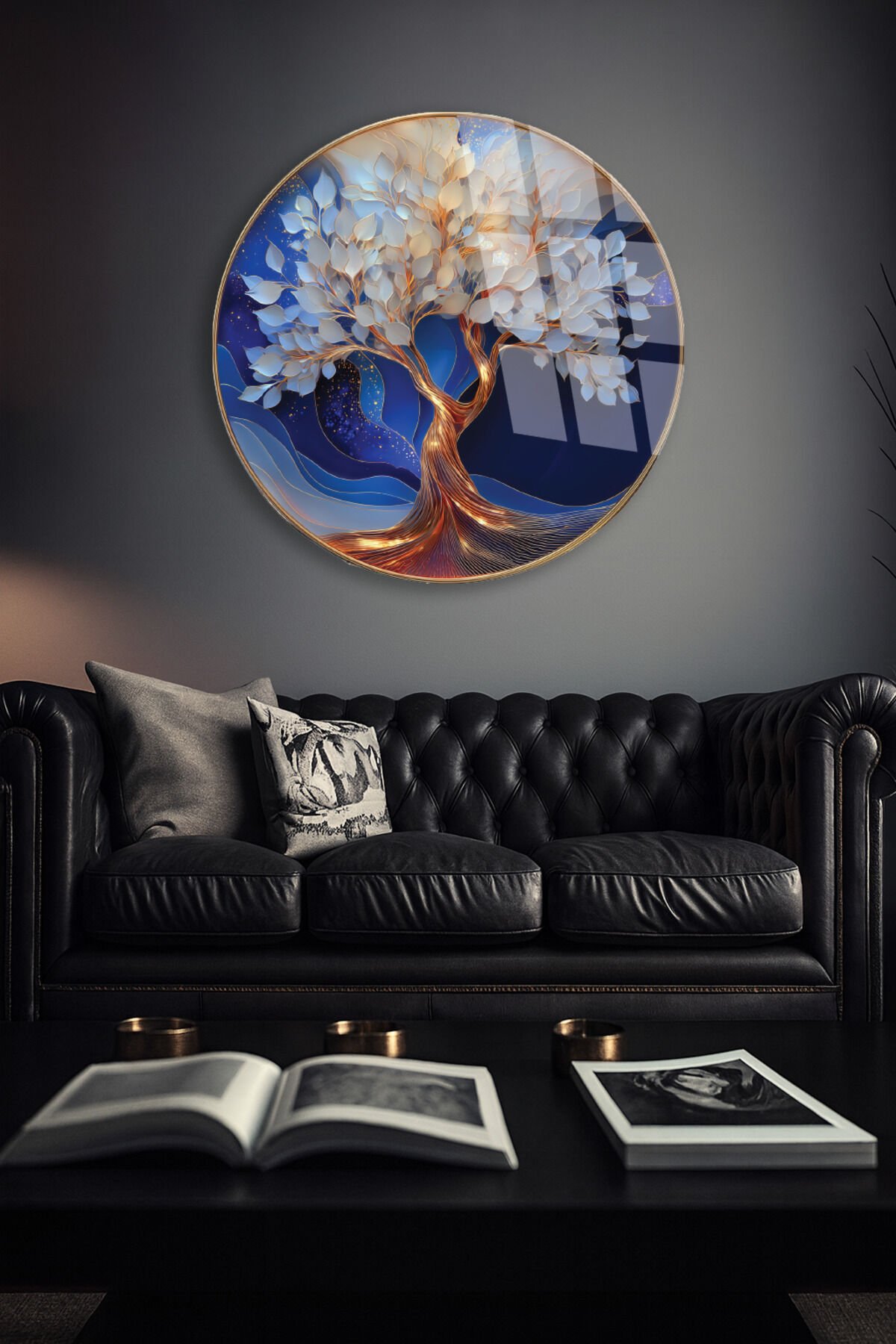 MODERN MAVİ TONLAR ALTIN HAYAT AĞACI KIRILMAZ CAM TABLO Lacivert