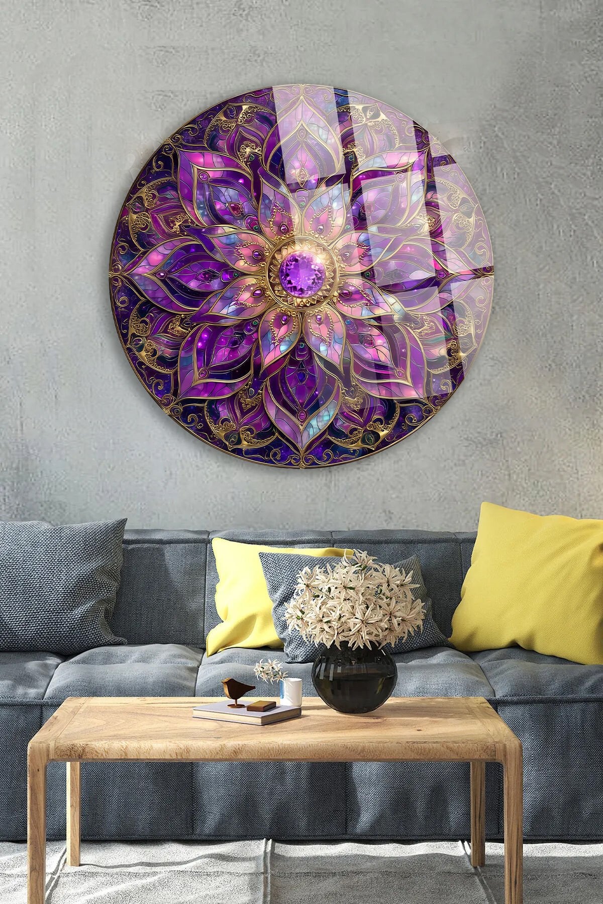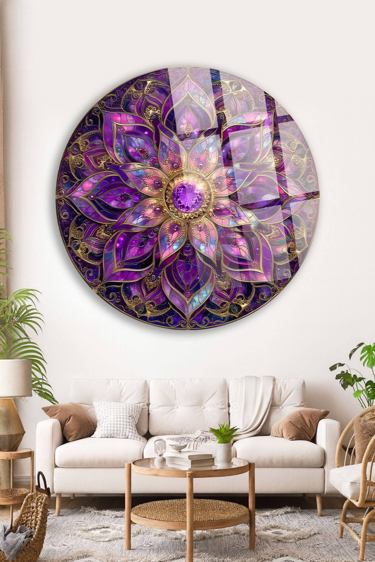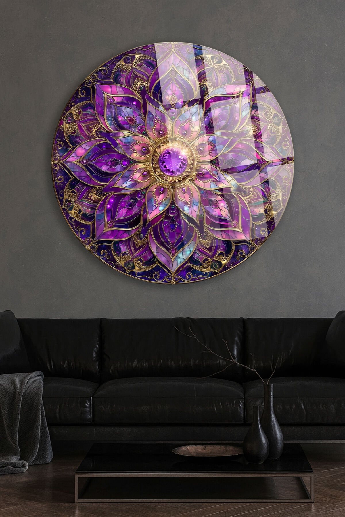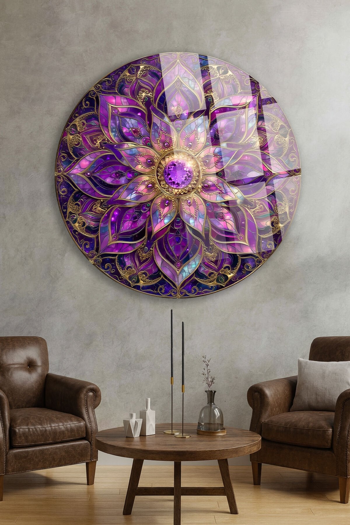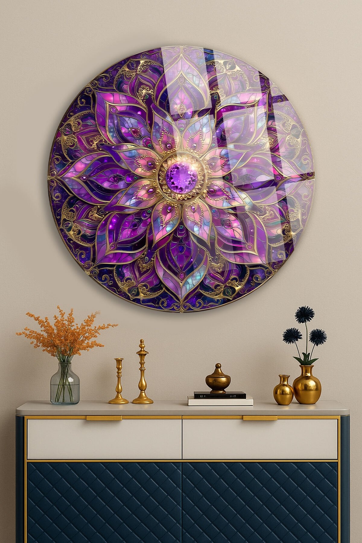 MOR AMETİST TAŞLI VİTRAY MANDALA DESEN DAİRE KIRILMAZ LÜKS CAM TABLO Mor