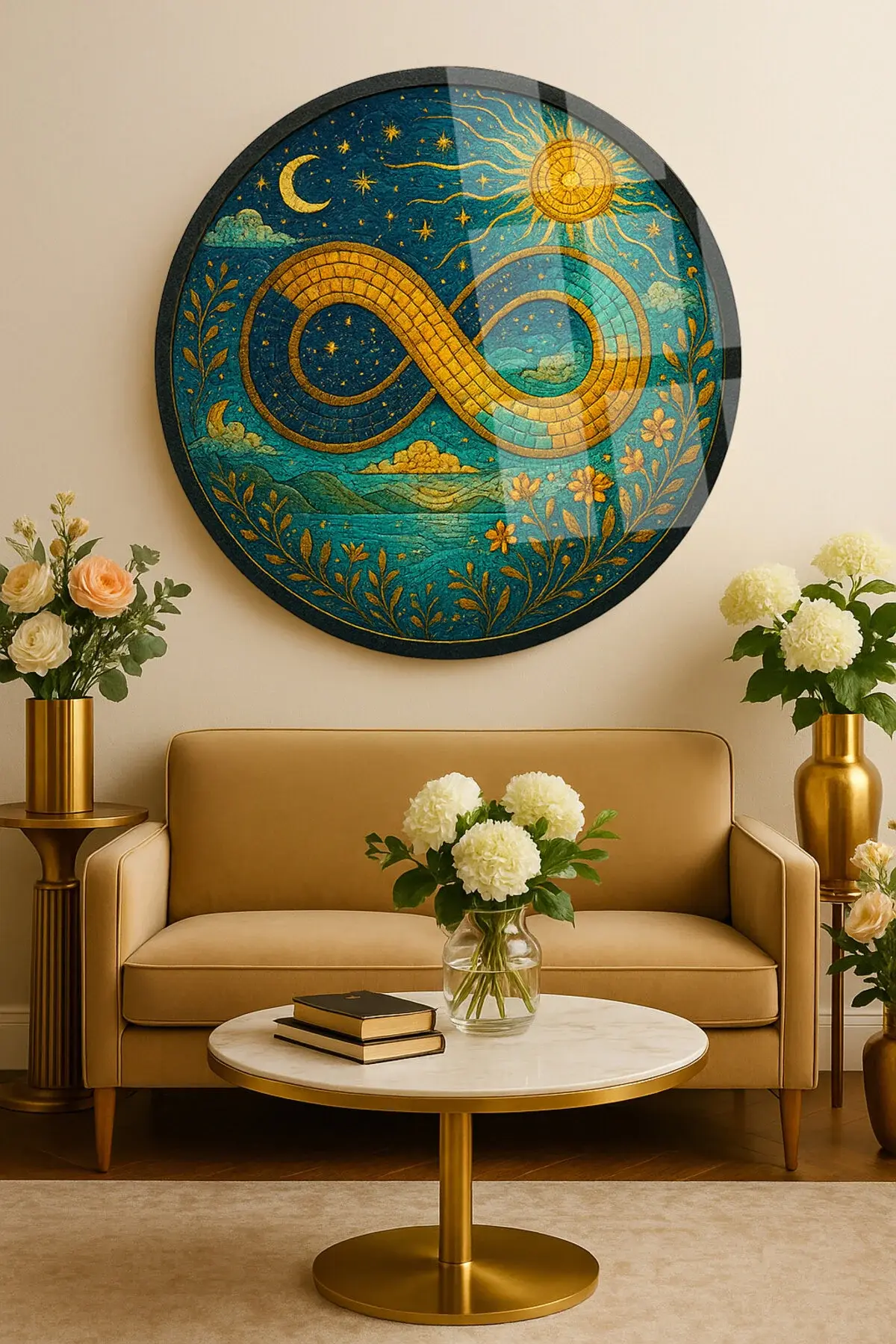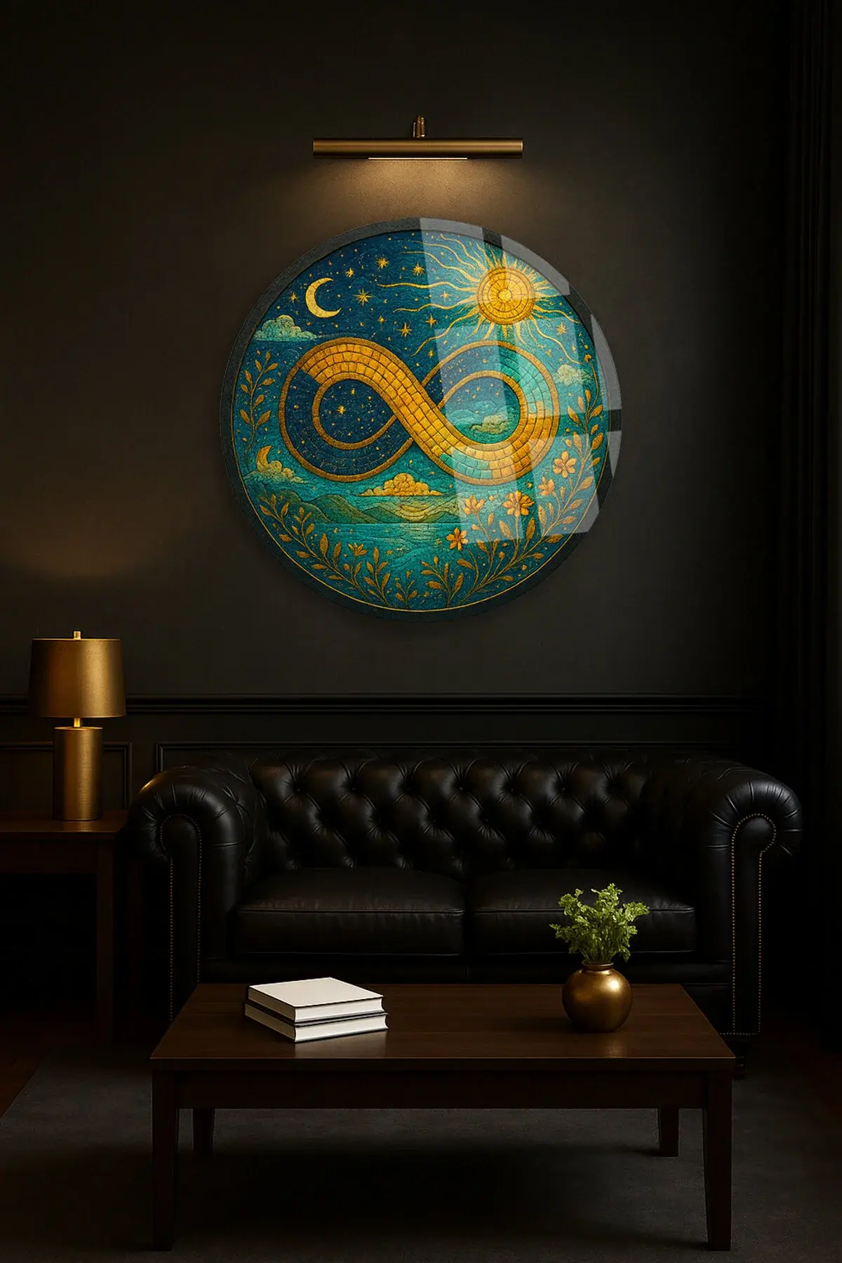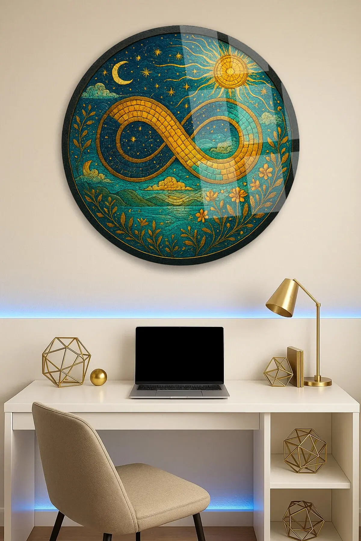 MOZAİK DESENLİ SONSUZLUK İŞARETİ MODERN YUVARLAK CAM TABLO EV HEDİYESİ ULTRA CANLI RENKLER Lacivert