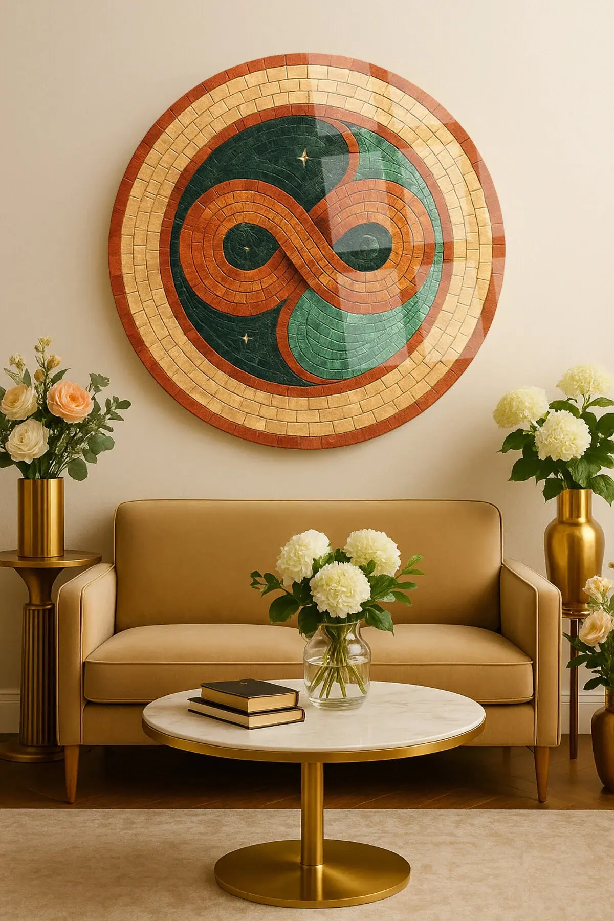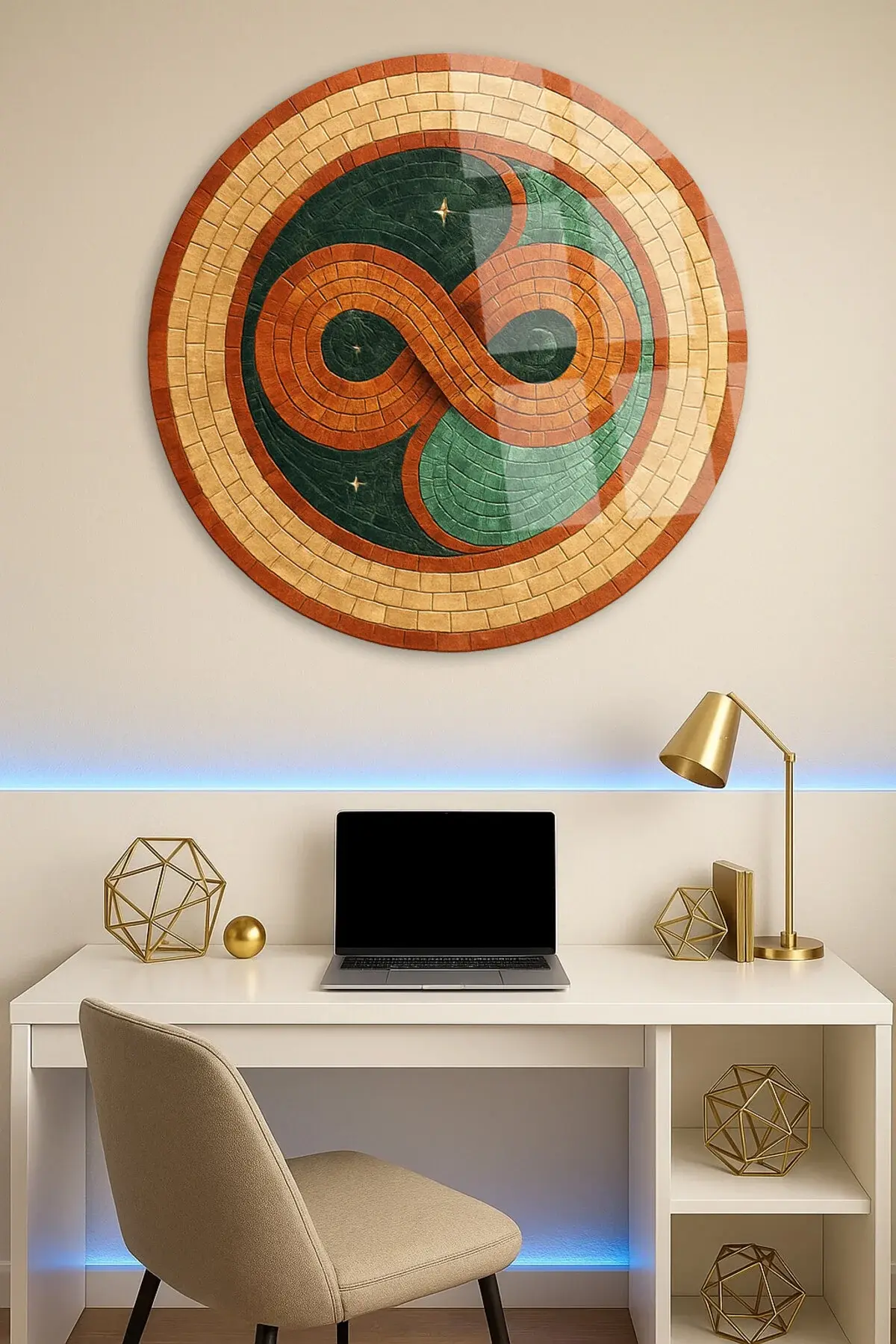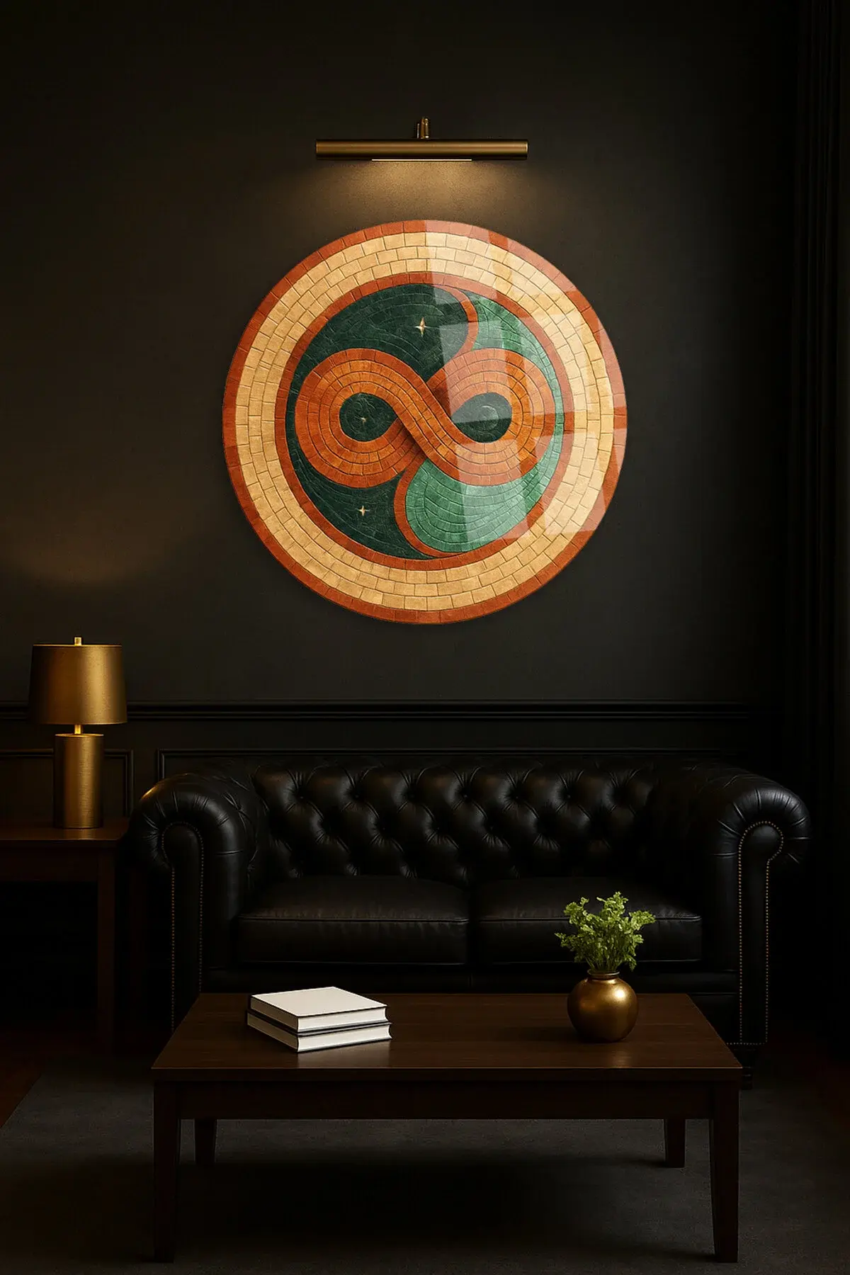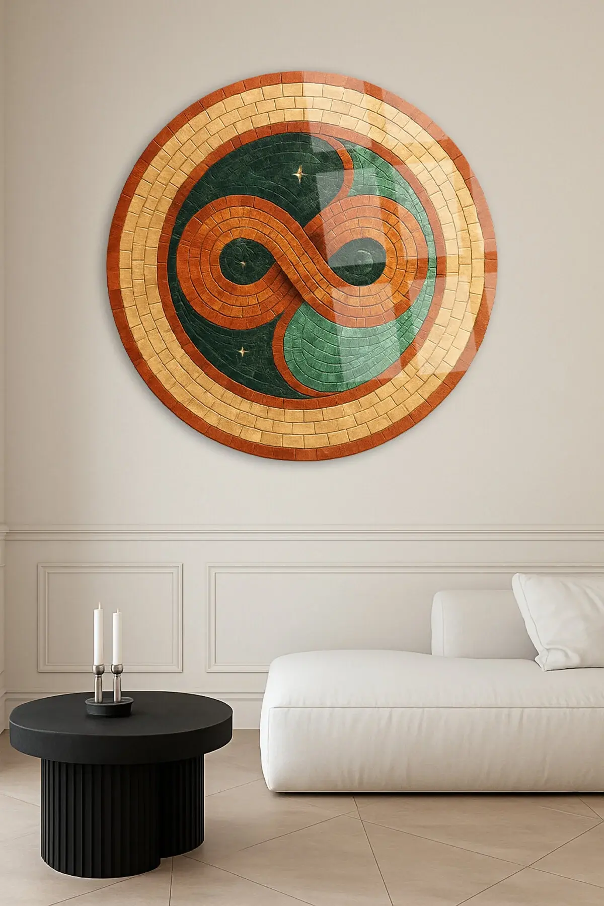 MOZAİK DESENLİ SONSUZLUK İŞARETİ MODERN YUVARLAK CAM TABLO EV HEDİYESİ ULTRA CANLI RENKLER