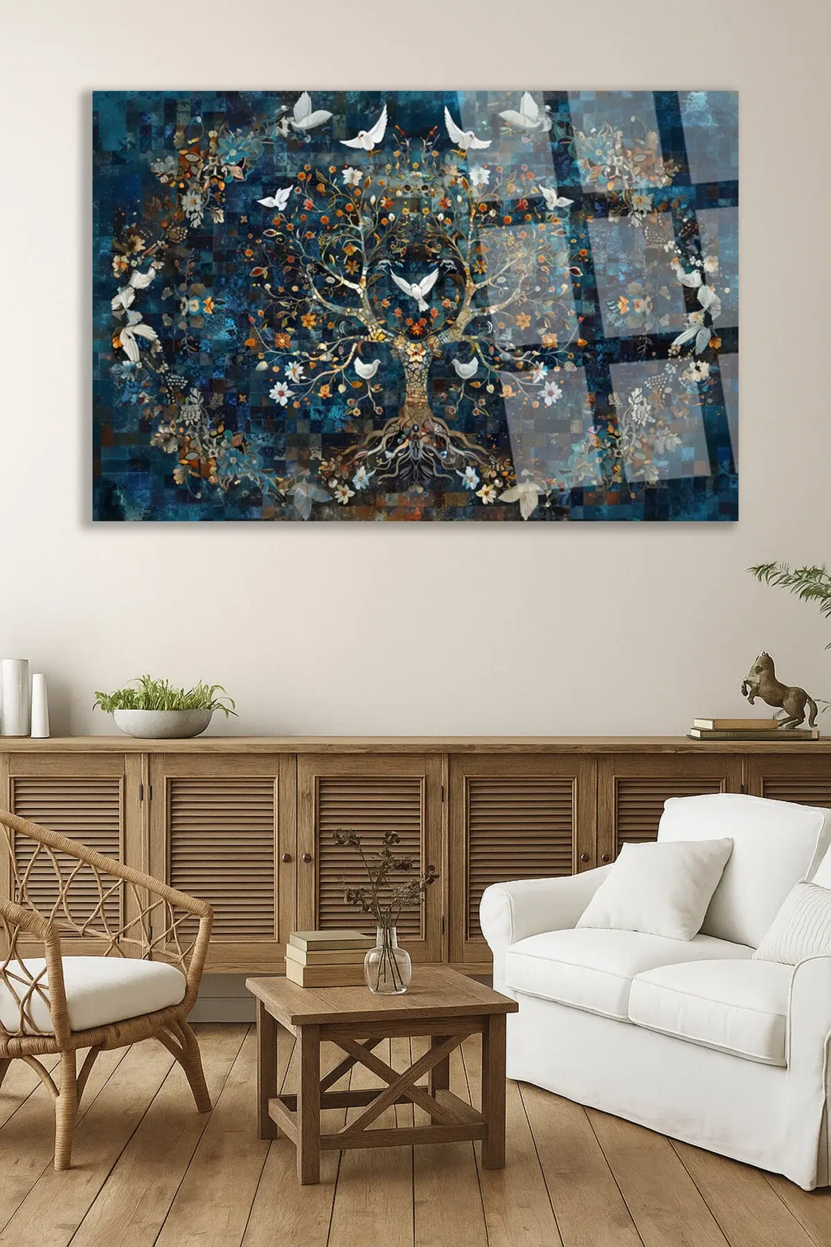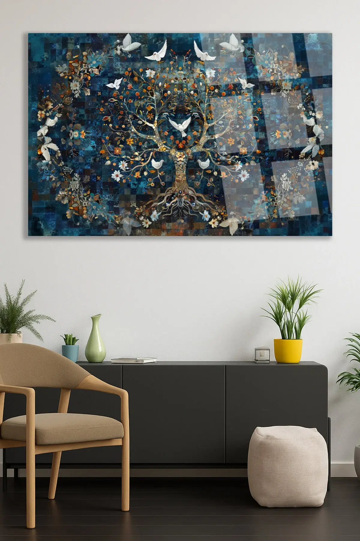 MOZAİK TAŞ DESEN TASARIMLI AĞAÇ TABLOSU GÜVERCİN DETAY KIRILMAZ CAM TABLO HEDİYE ULTA CANLI RENKLER Lacivert