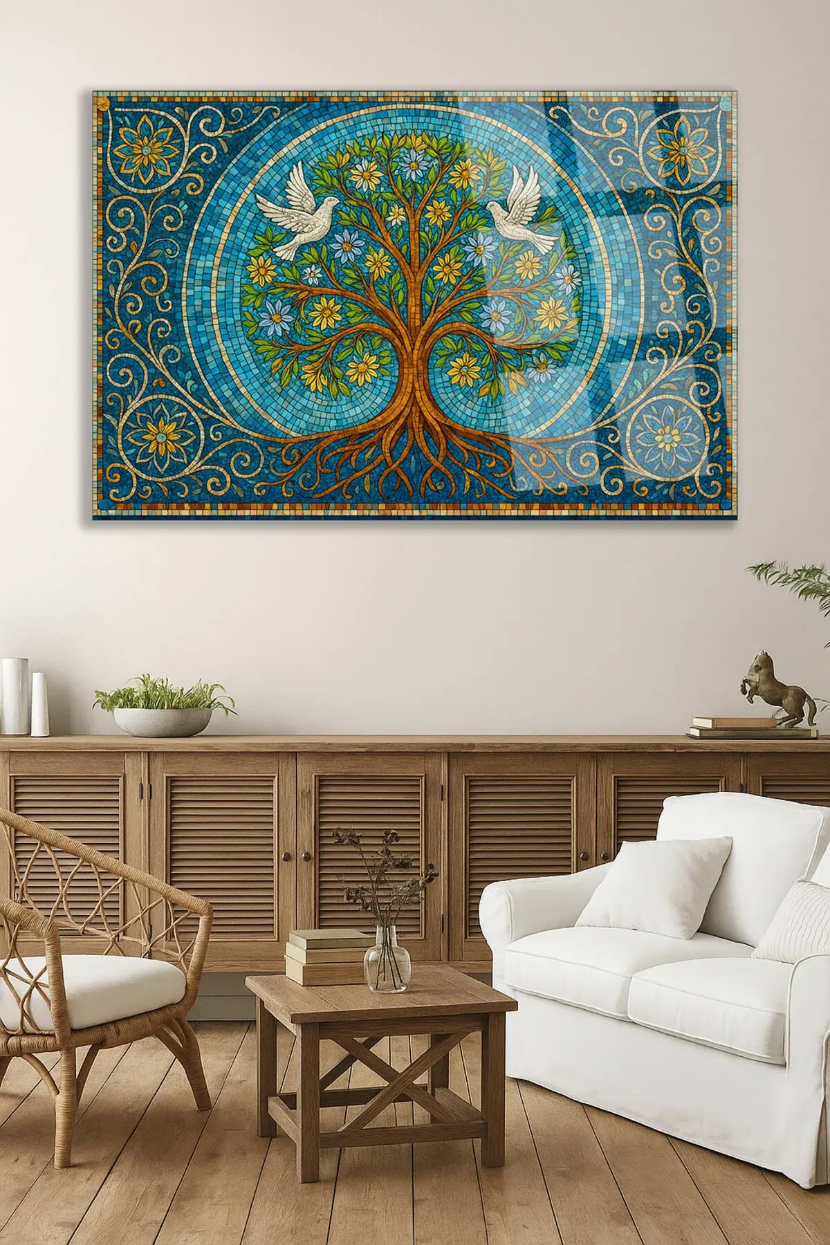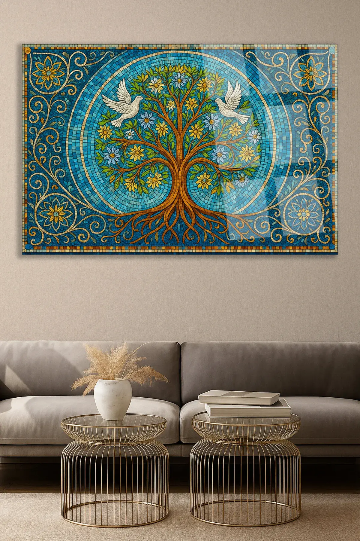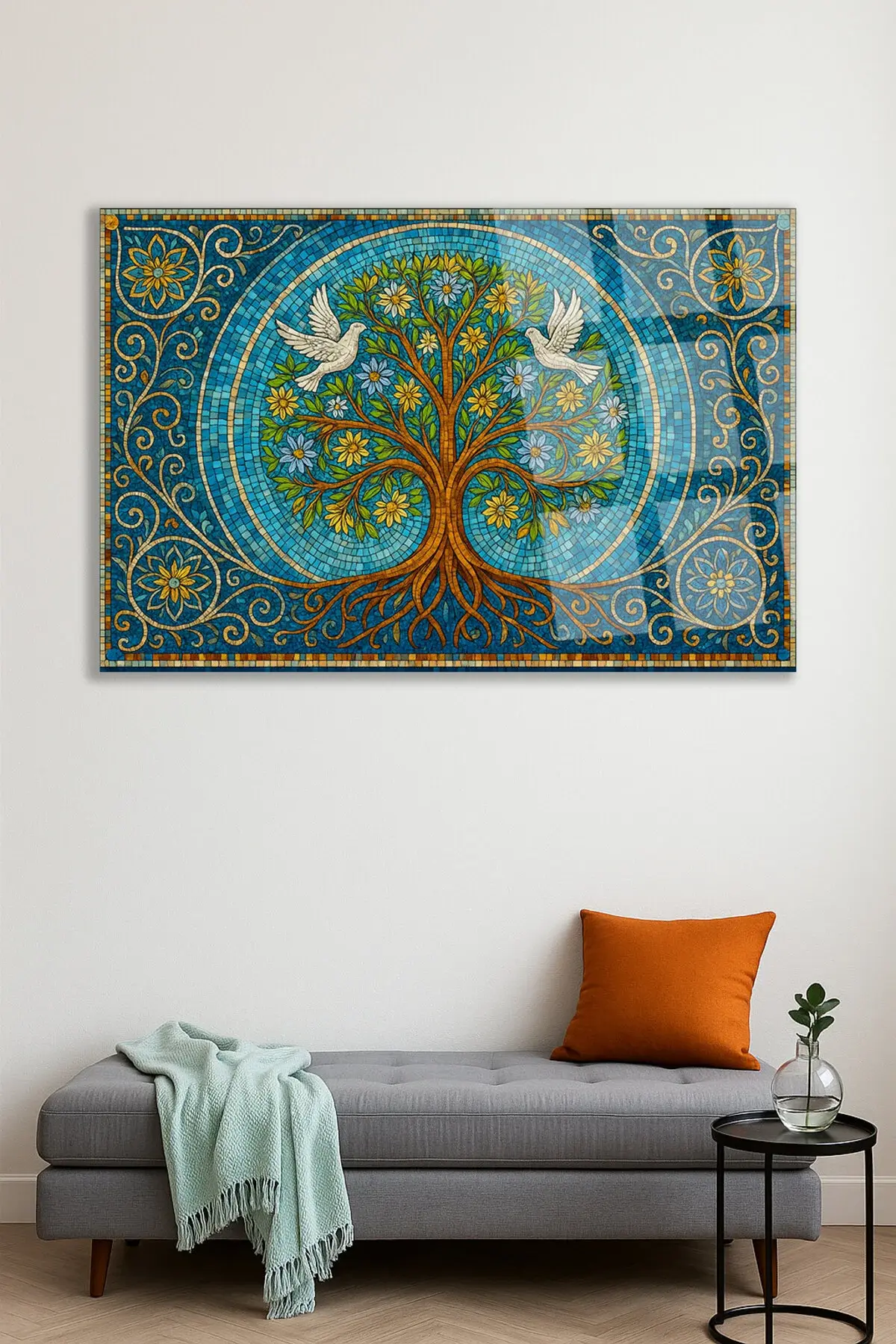 MOZAİK TAŞ DESEN TASARIMLI AĞAÇ TABLOSU GÜVERCİN DETAY KIRILMAZ CAM TABLO HEDİYE ULTA CANLI RENKLER Çok Renkli