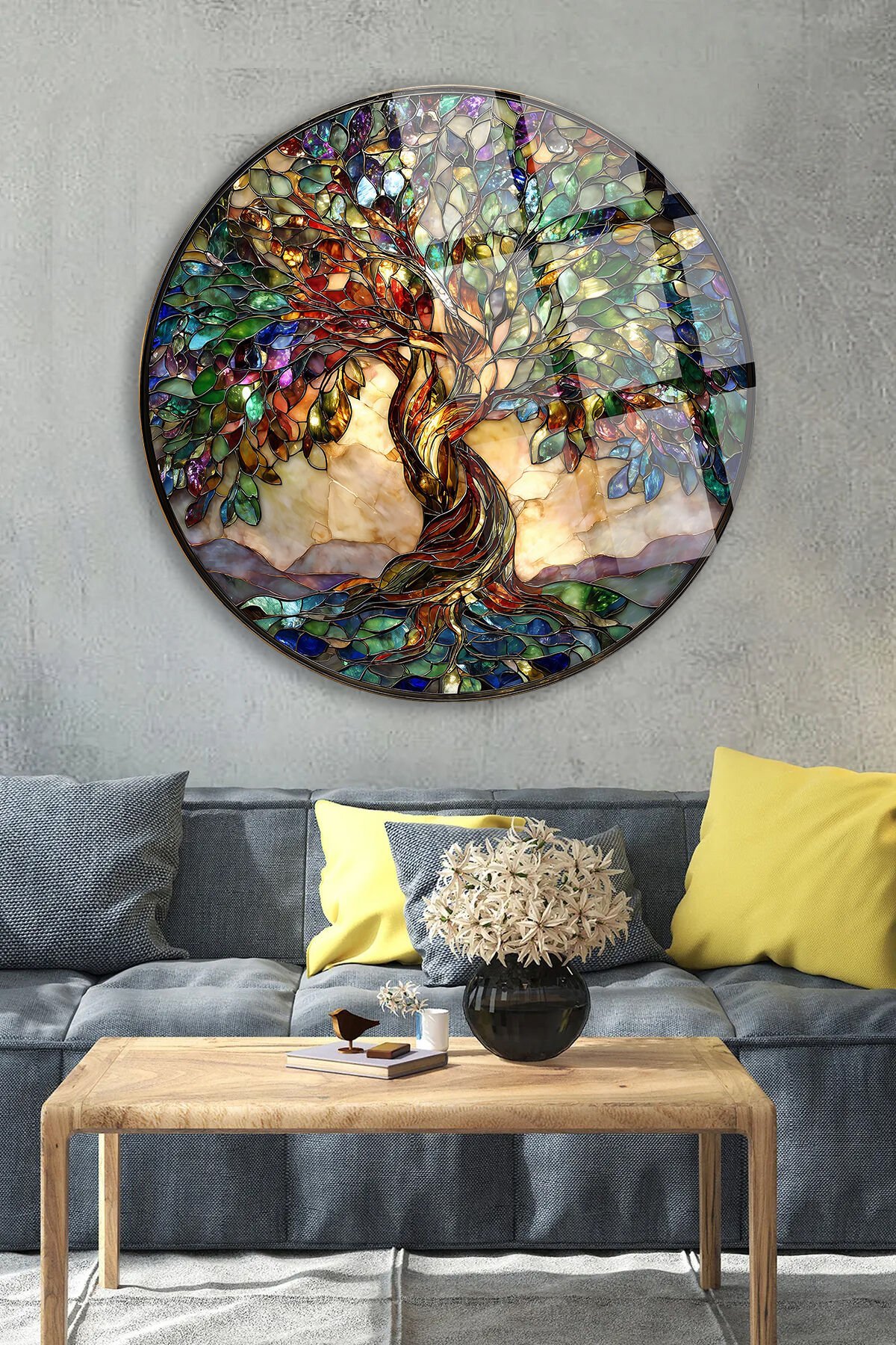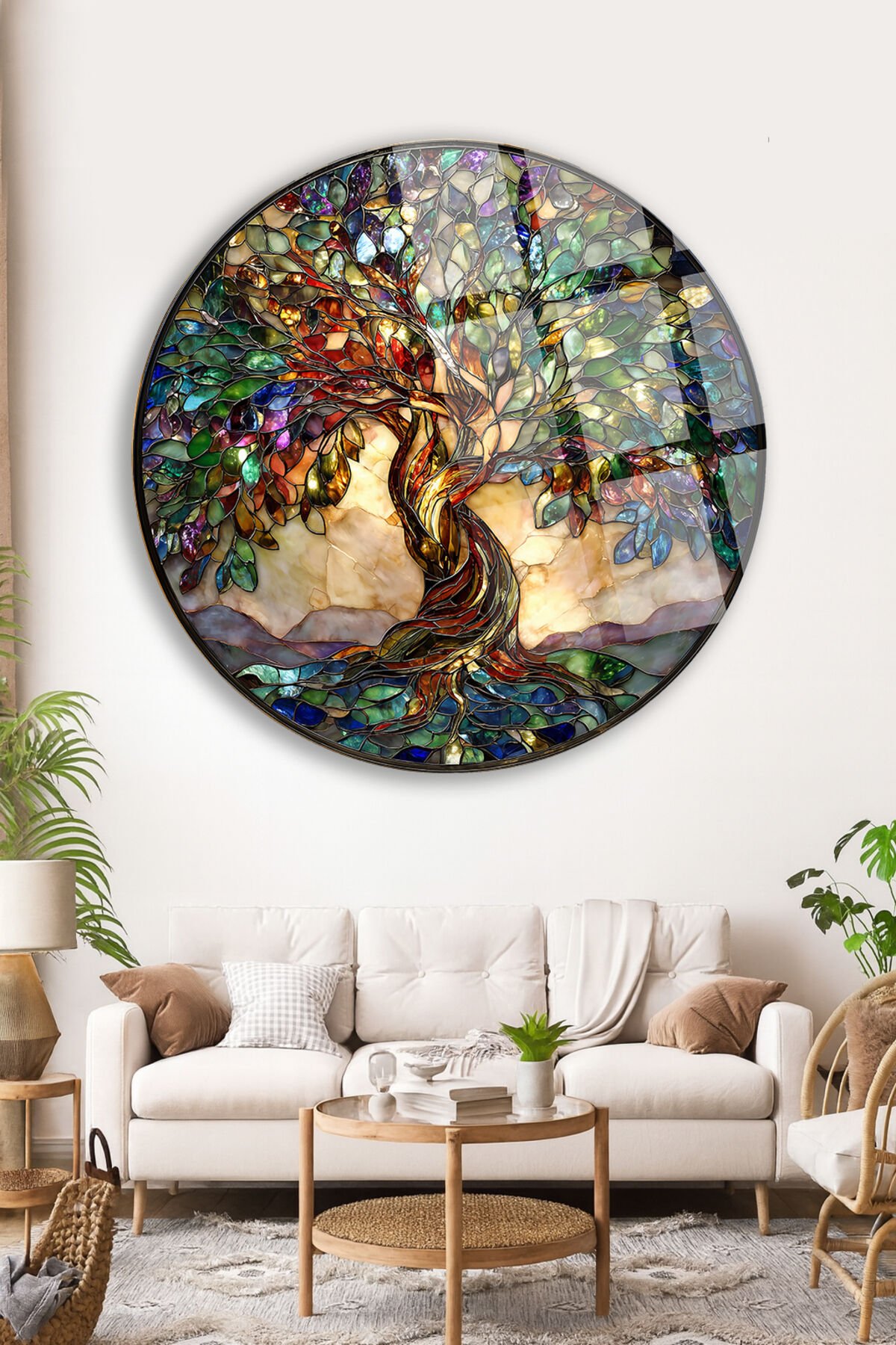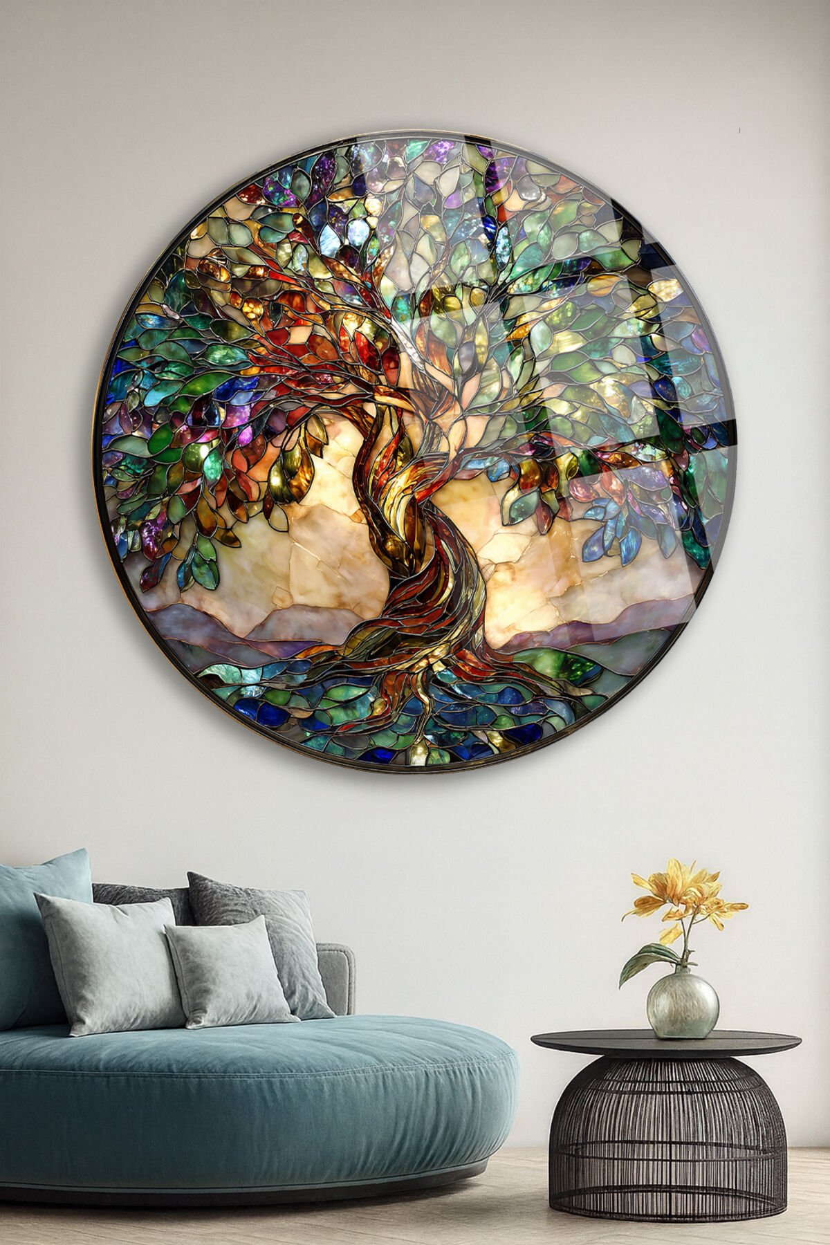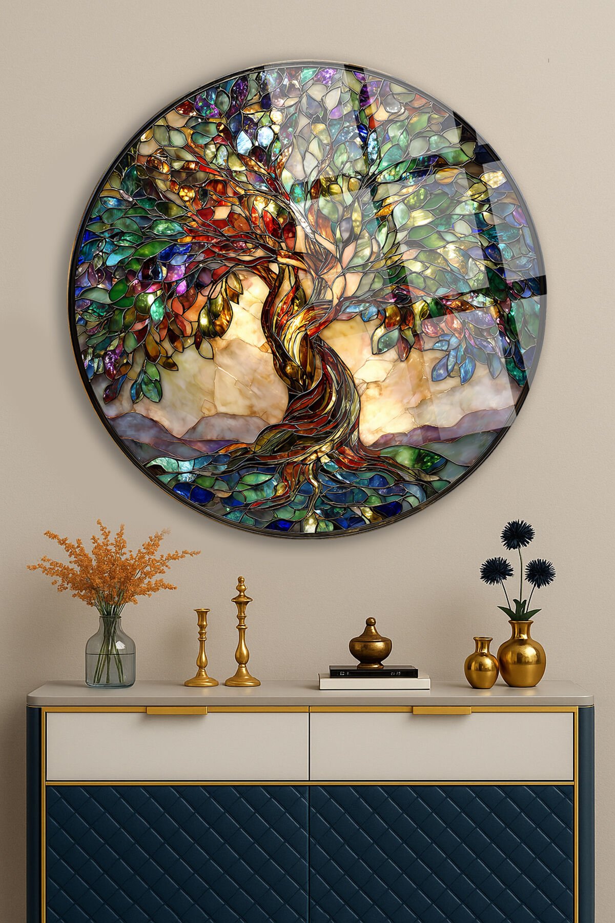 MOZAİK VİTRAY RENKLİ YAŞAM AĞACI TASARIMI KIRILMAZ LÜKS CAM TABLO Yeşil